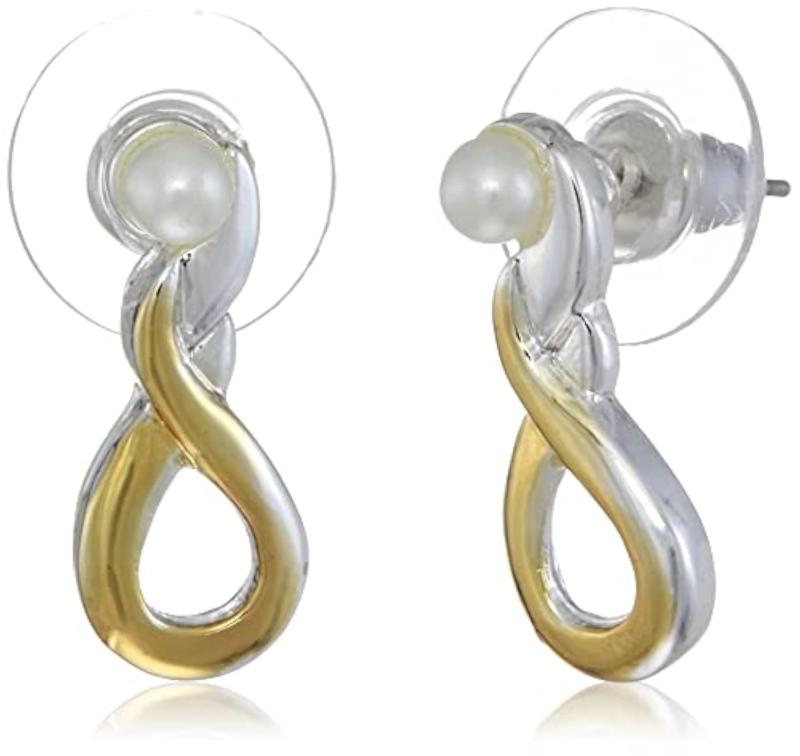 Elegant silhoutte style stud earring featuring a pearl on dual tone plating. Perfect for adding a touch of sophistication to any outfit.