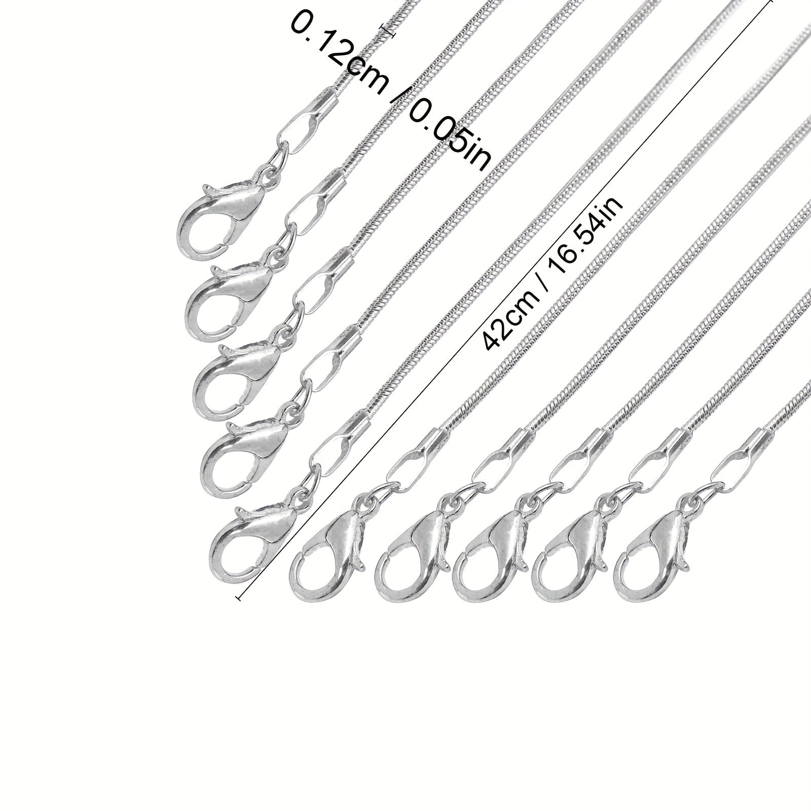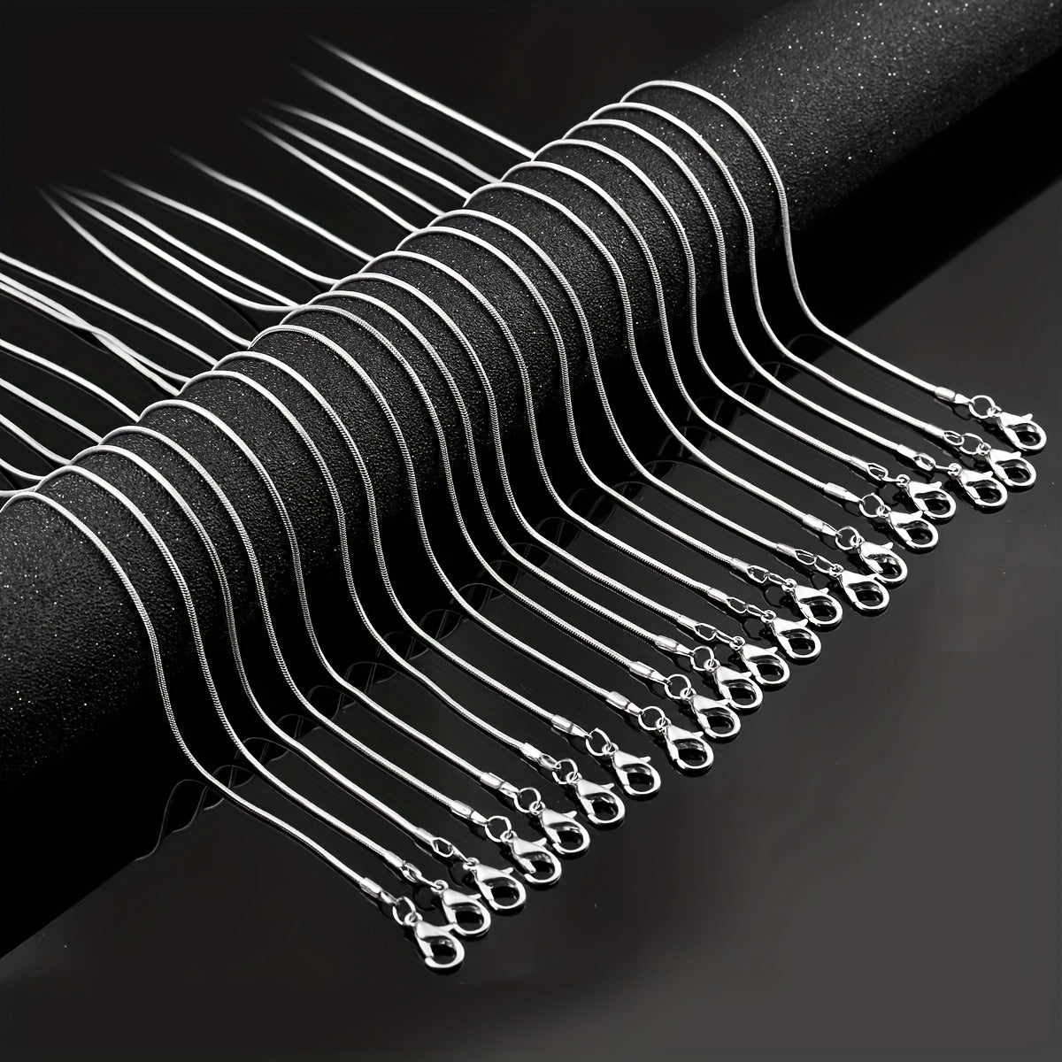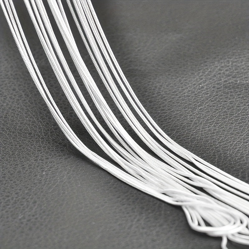 This set includes 24 silver plated snake chain necklaces with lobster clasp, perfect for DIY jewelry making. Each chain is 1.2mm thick and has a sleek design.