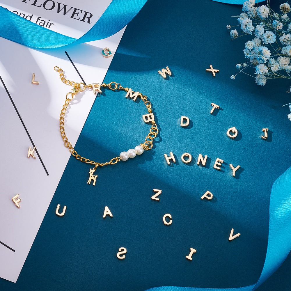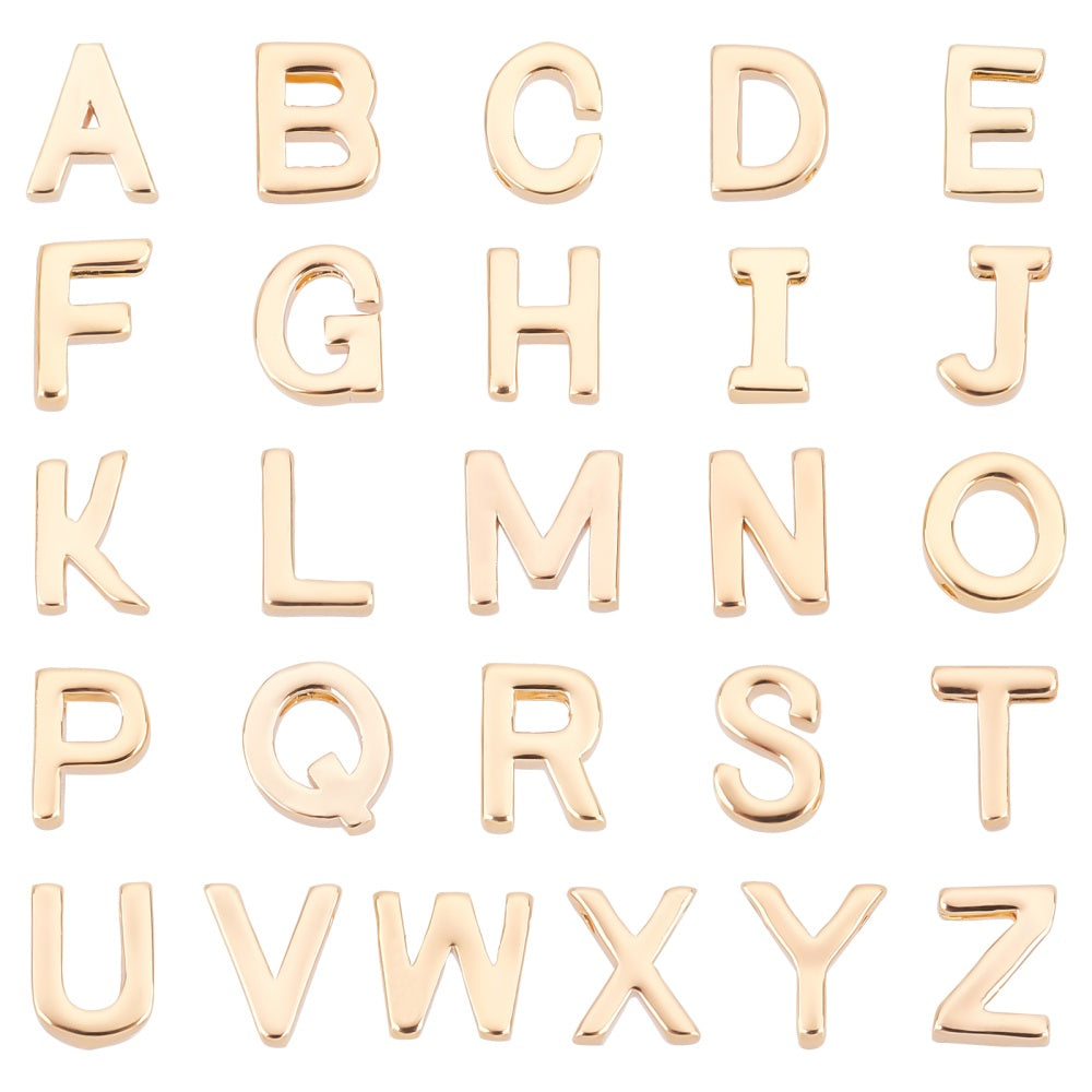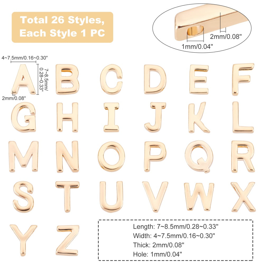 Get a set of 26 different styles of brass charms with nickel capital letter beads for your DIY earrings, bracelets, necklaces, and jewelry making projects. Each charm measures 7.8x4.7x2mm with a hole size of 1mm.