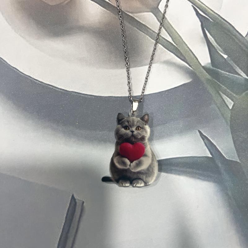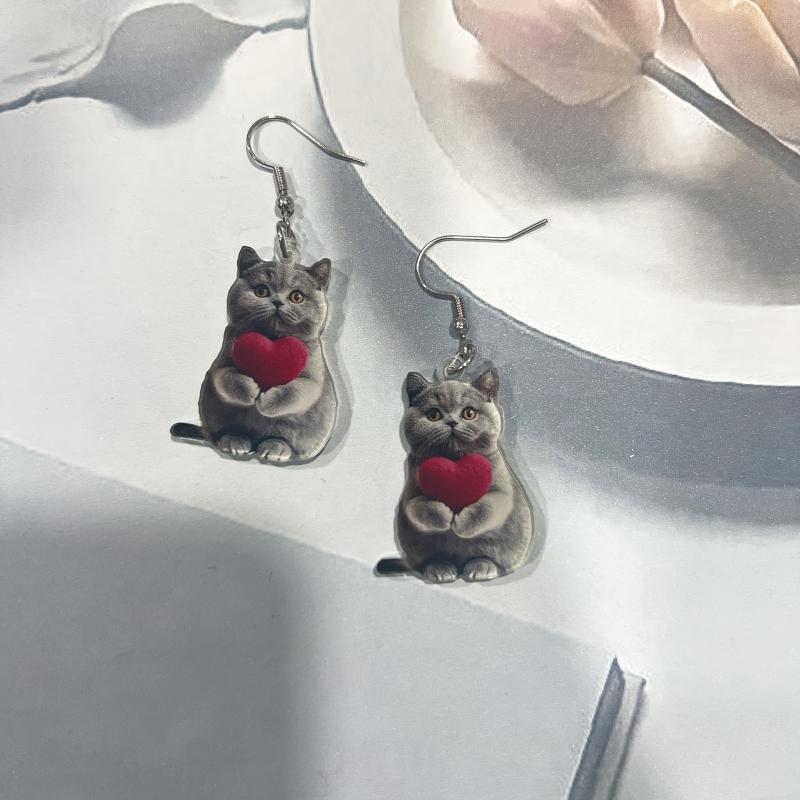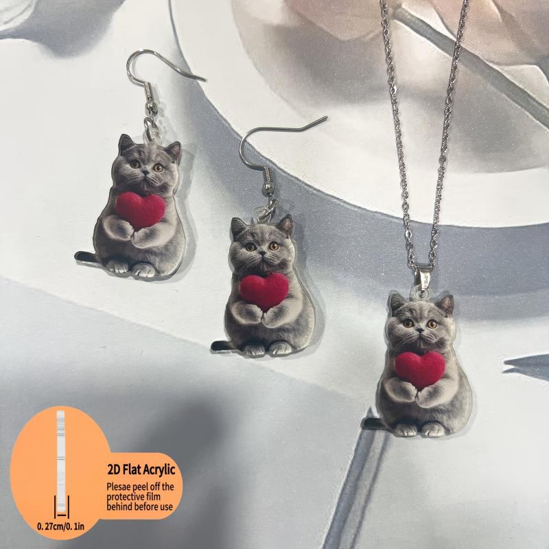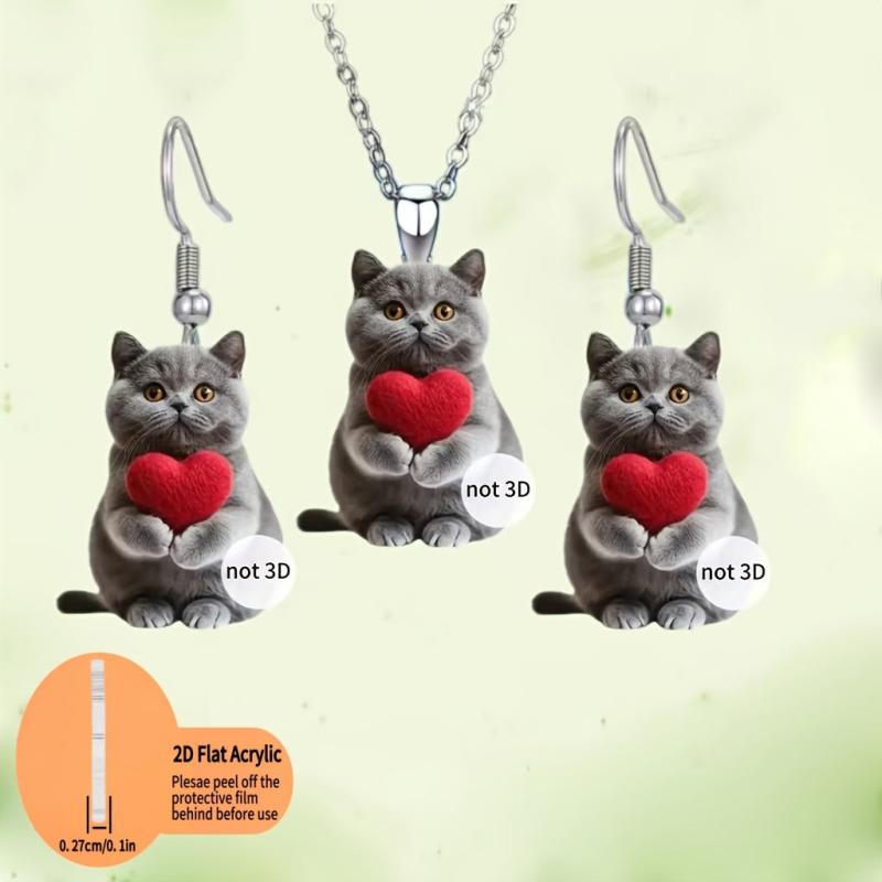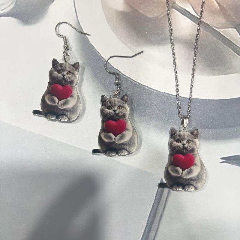 Adorable gray cat design earrings and pendant set made of acrylic. Perfect gift for pet lovers on Valentine's, birthdays, or any special occasion.