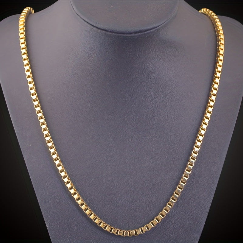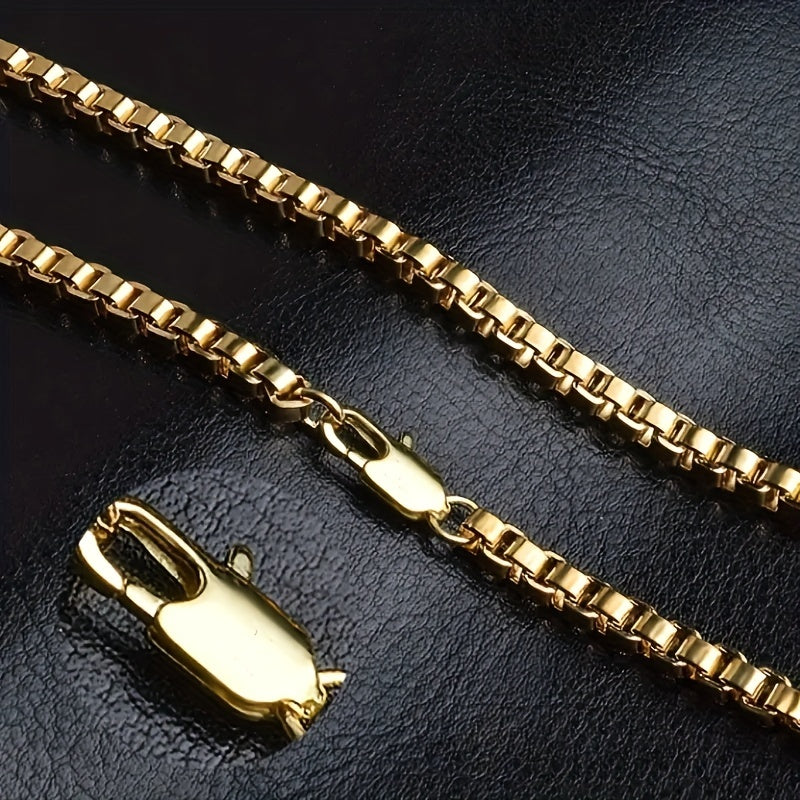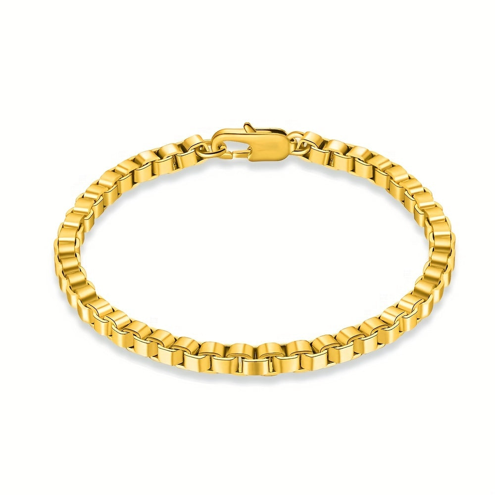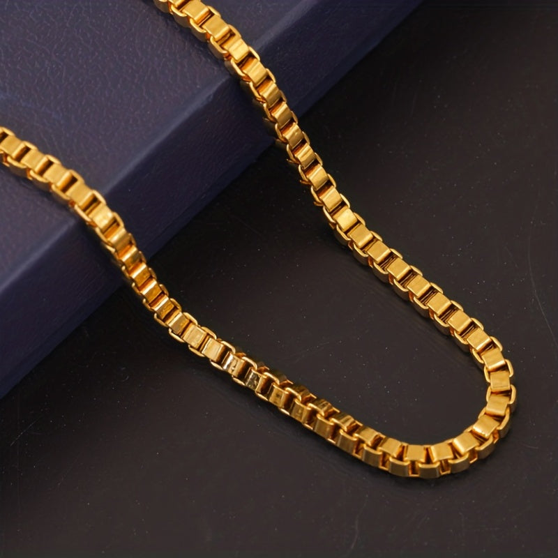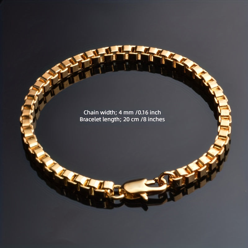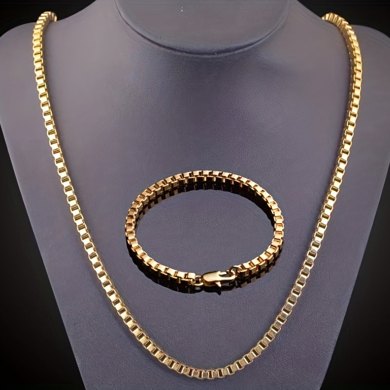 This set includes a matching necklace and bracelet with a 4mm chain width, crafted in a stylish golden hue suitable for both men and women.