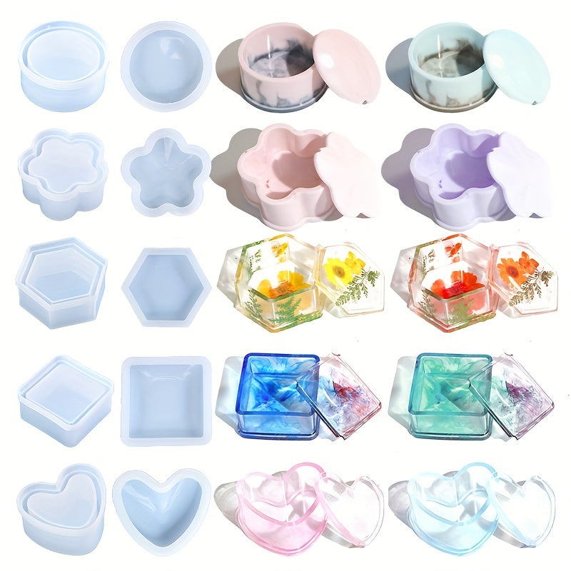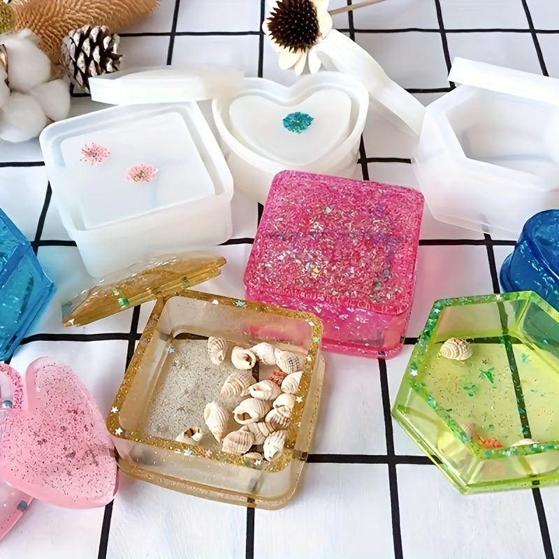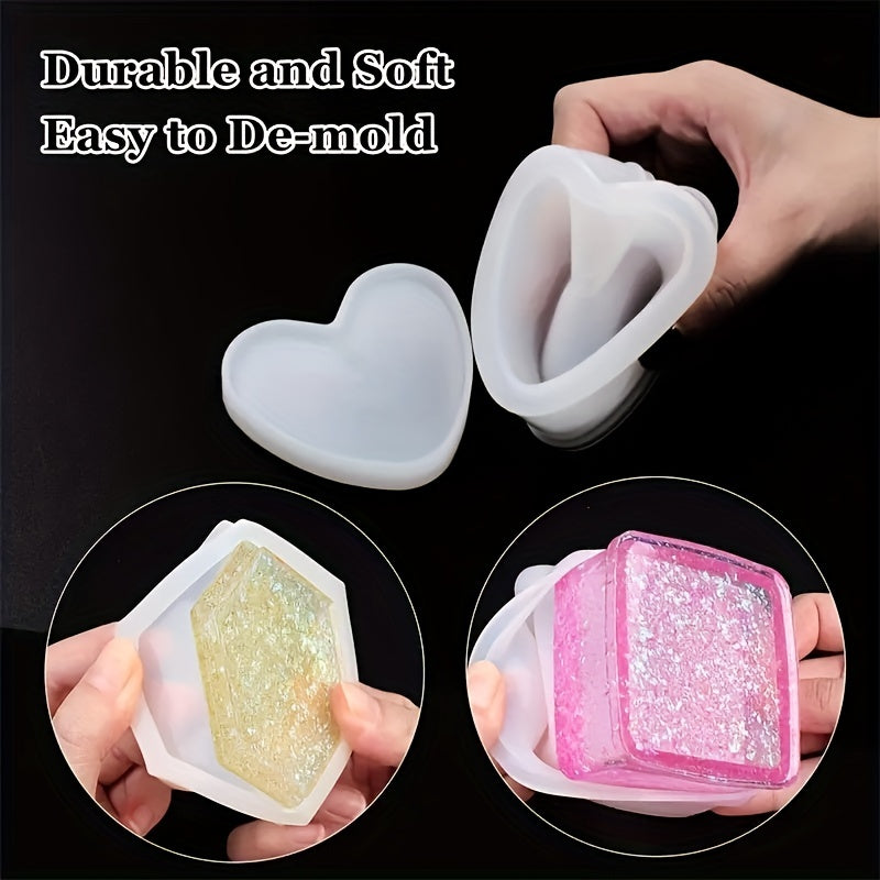 Create unique jewelry boxes with these versatile resin molds. Perfect for crafting beautiful square, round, flower, heart, and hexagonal designs.