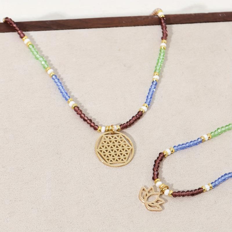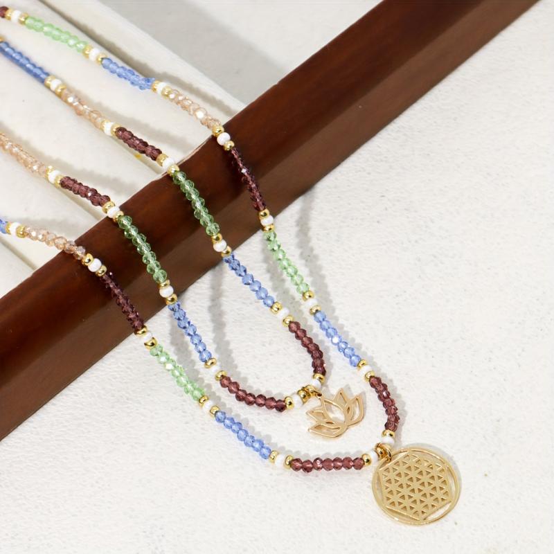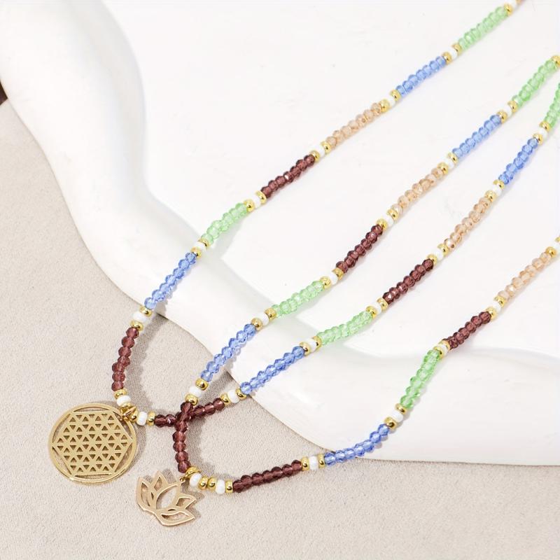 2pcs Lotus Double Layer Necklace Bohemian Beaded Pendant for Vacation