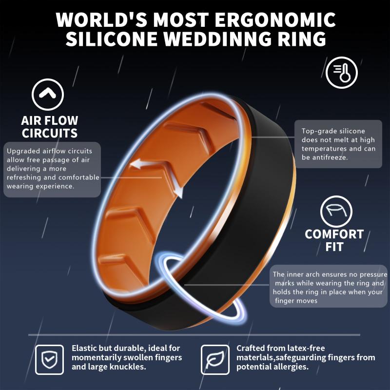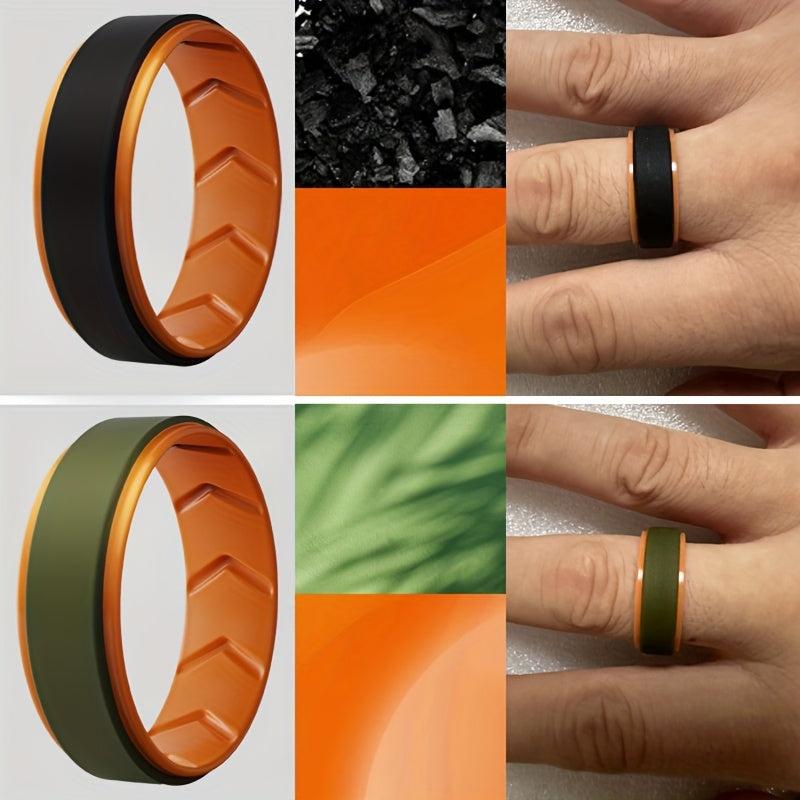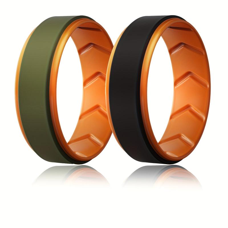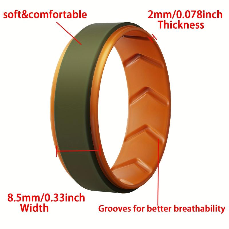 These 2pcs Men's Silicone Rings in dual tone olive green are perfect for outdoor activities. Made with durable material, they feature an air release groove for added comfort. Great for sports, weddings, and everyday wear.