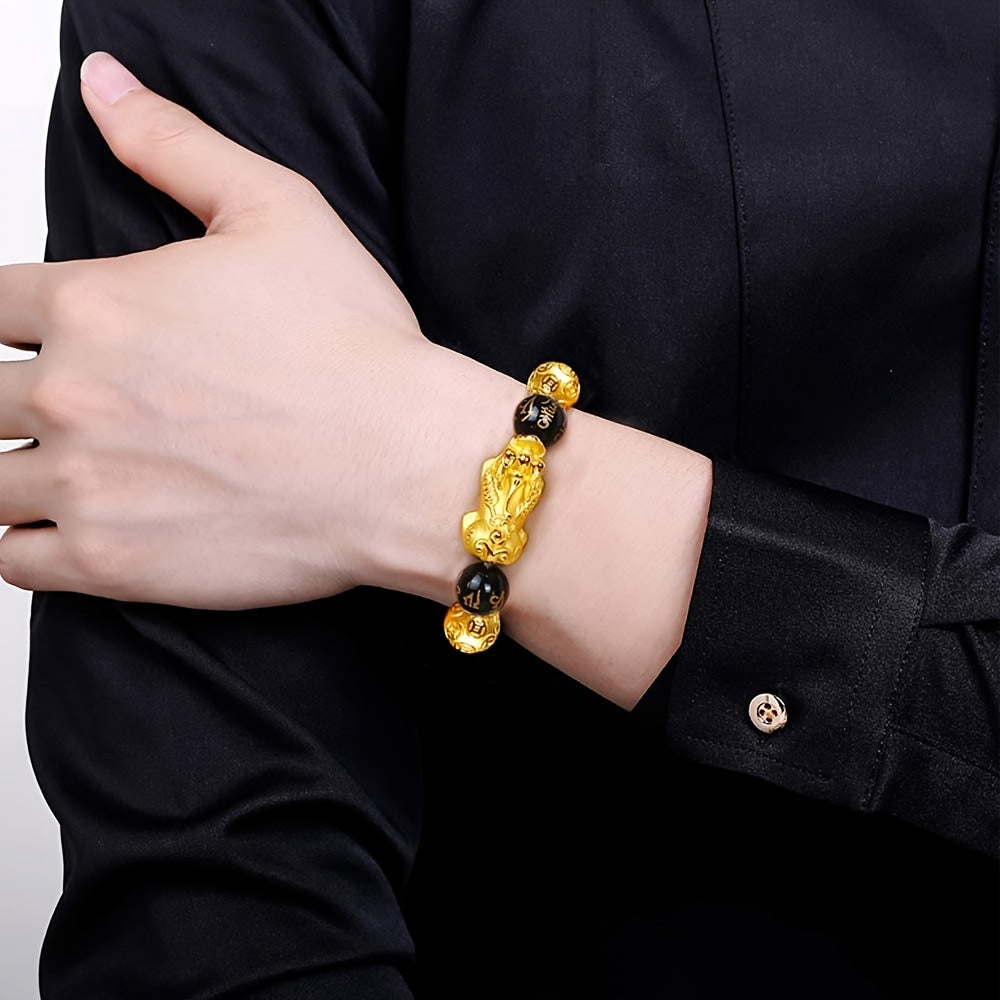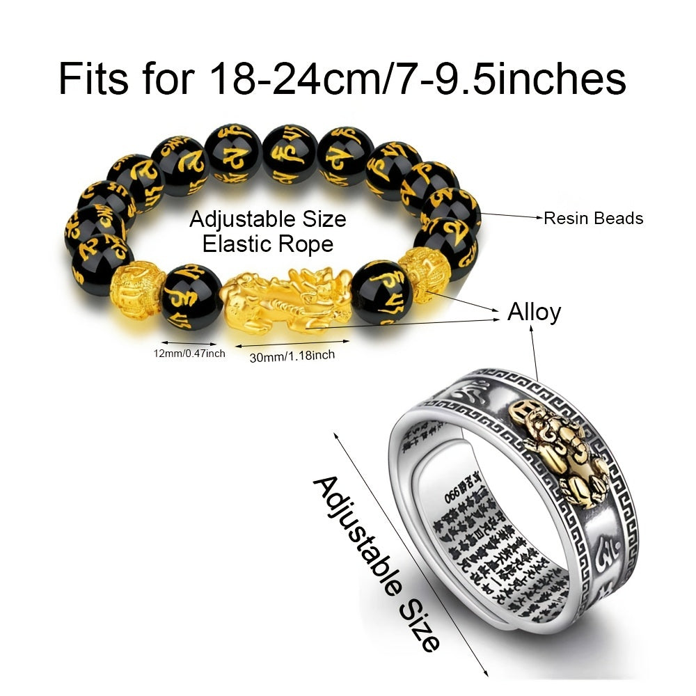 This set includes a Golden Pixiu bracelet and an adjustable open ring for luck and wealth. The Pixiu symbolizes good fortune and protection in Buddhist beliefs.