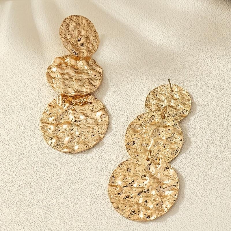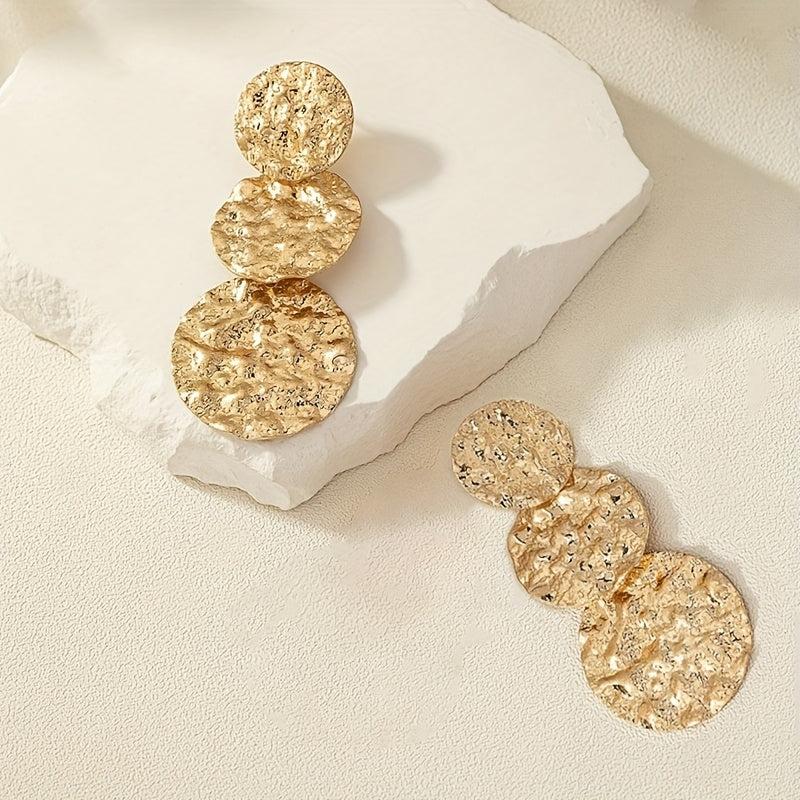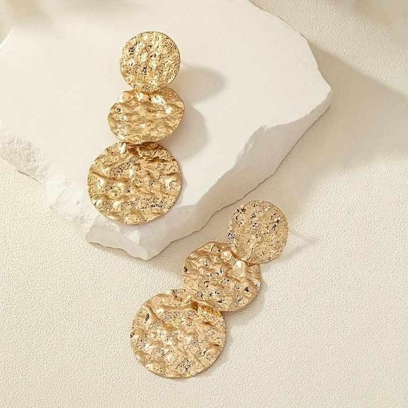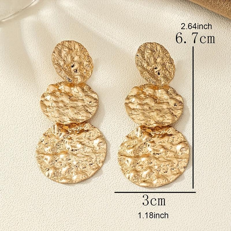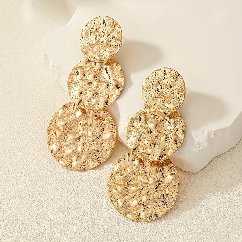These sophisticated dangle earrings feature a geometric round design with a textured golden finish. Perfect for daily wear and music festivals, these versatile accessories add a touch of glam to any outfit.
