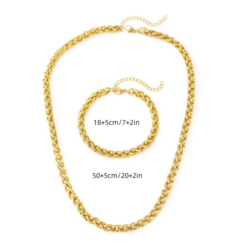 This set includes a stylish unisex necklace and bracelet crafted from stainless steel. The handwoven chain design makes it a versatile accessory for both men and women.