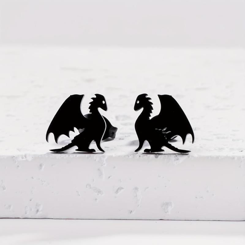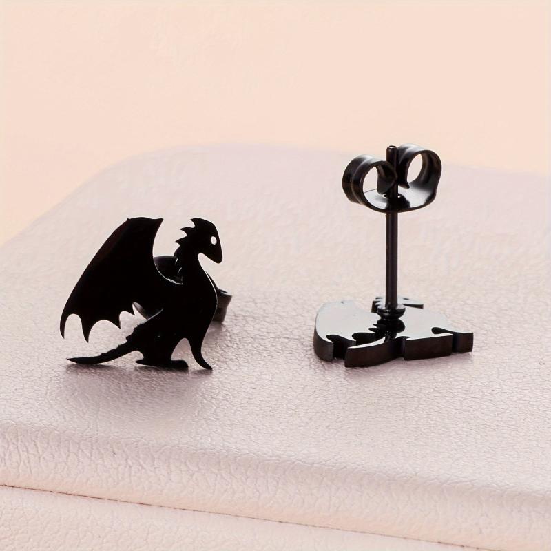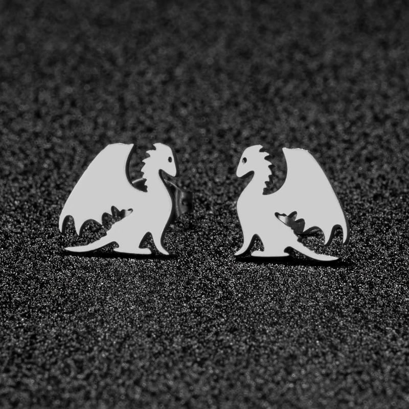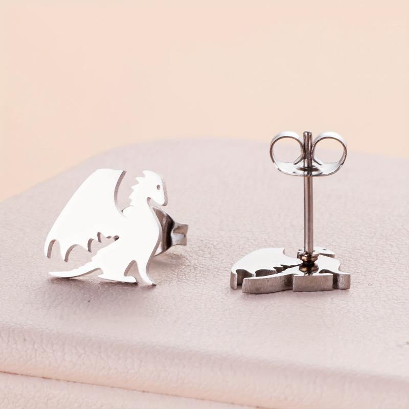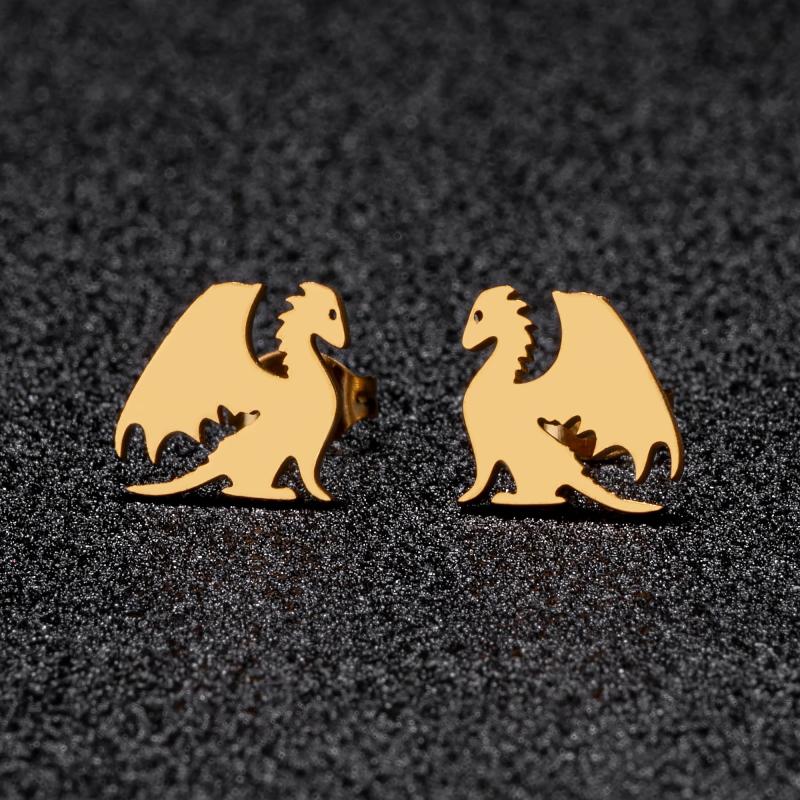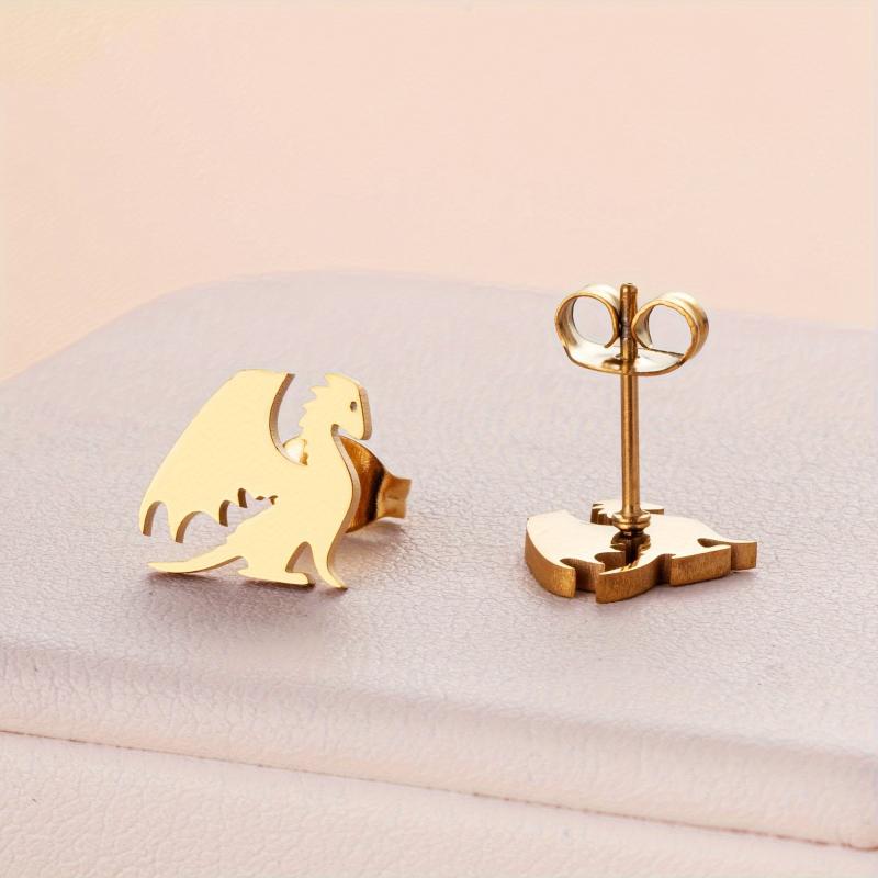 Adorable pair of stainless steel earrings featuring cartoon dinosaur design. Plated with 18K gold, perfect for everyday wear or special occasions.