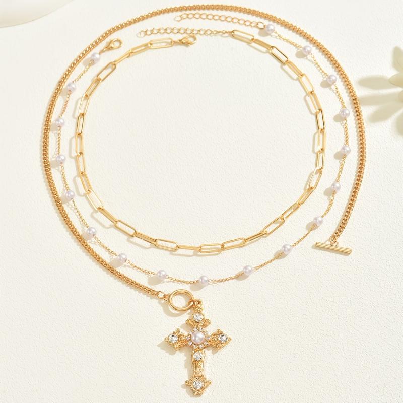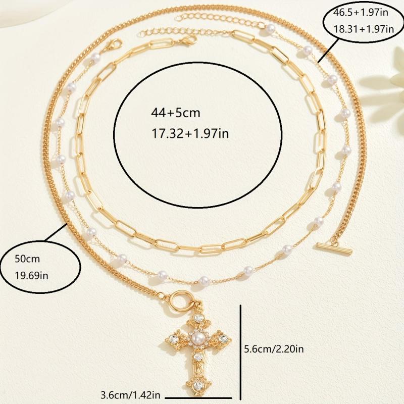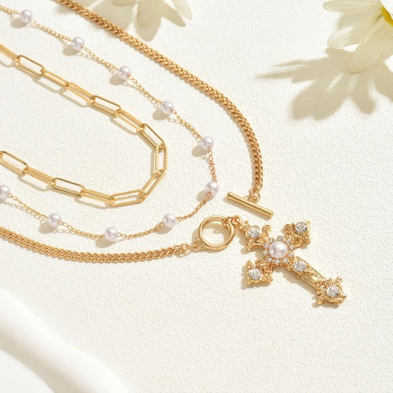 This set includes three stylish necklaces featuring heavy industry cross pendant, acrylic pearl ball bead chain, and blingbling pendant neck. Elevate your look with this trendy jewelry set.