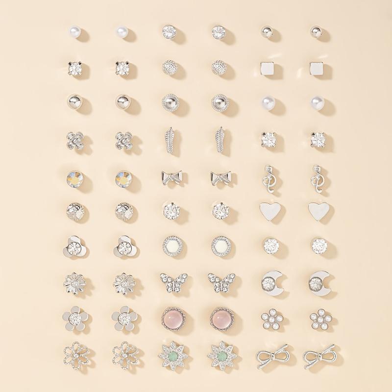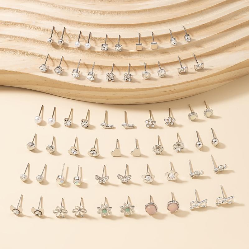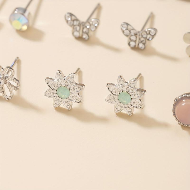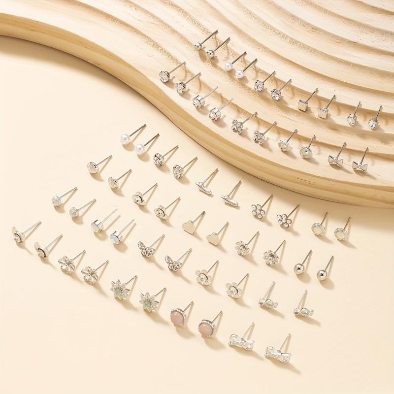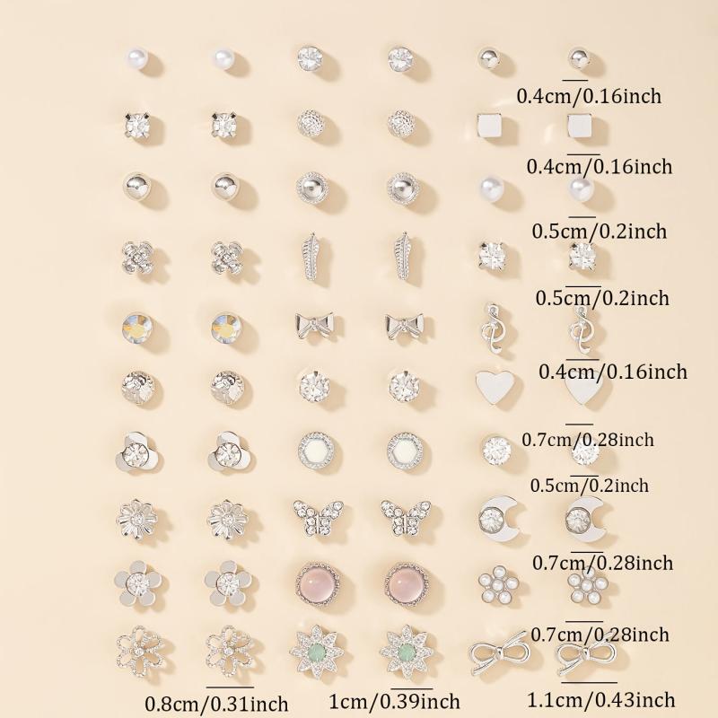 Gift this large set of earrings for daily wear jewelry. Each pair features small flowers, faux bows, rhinestones, hearts, and moons.