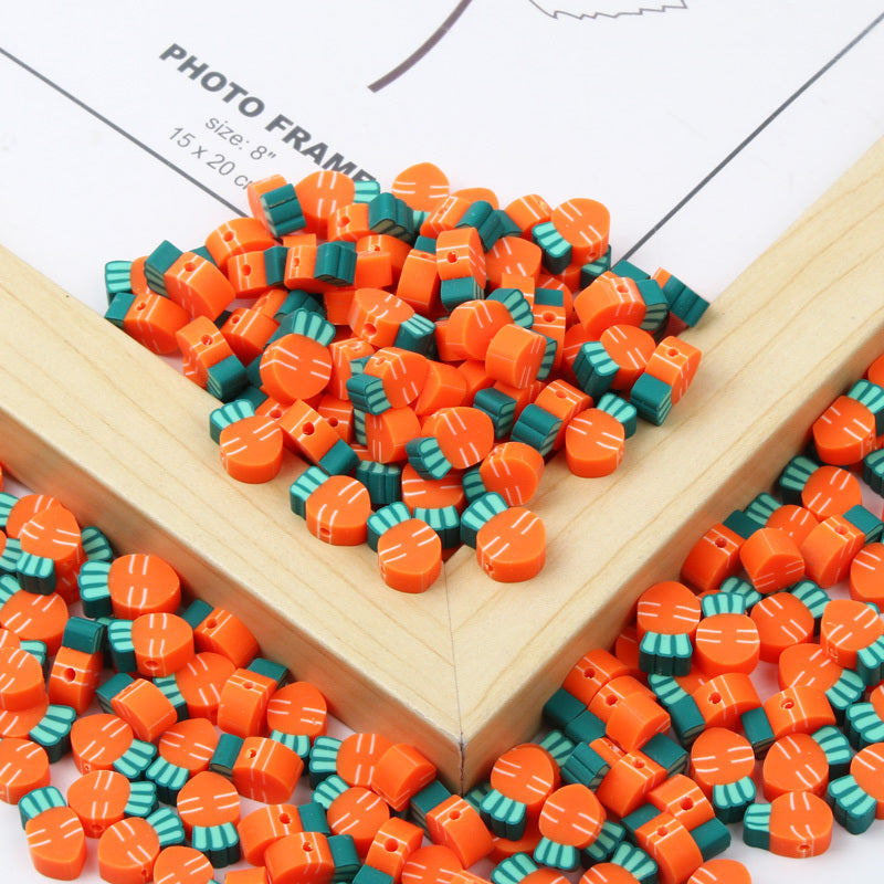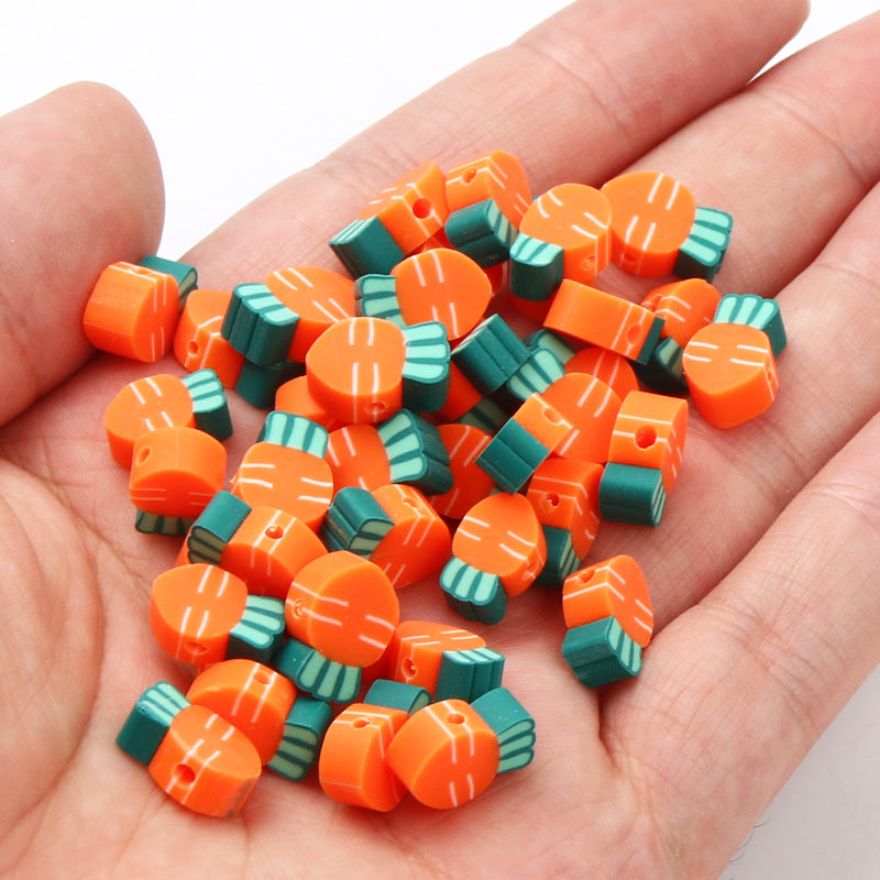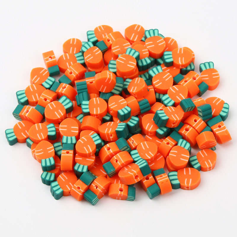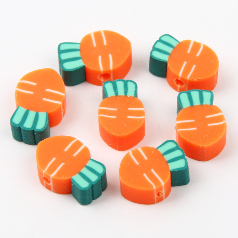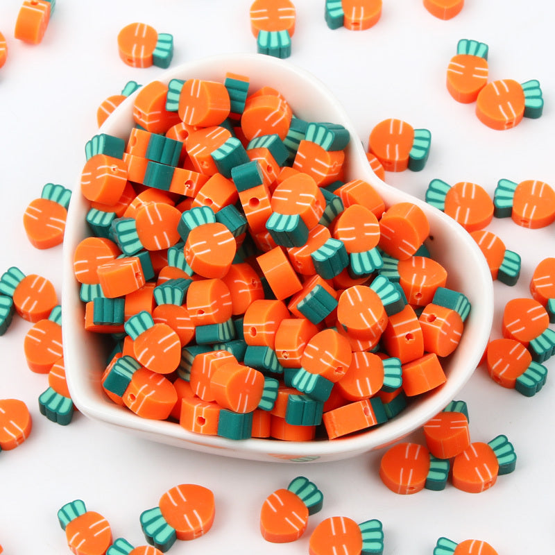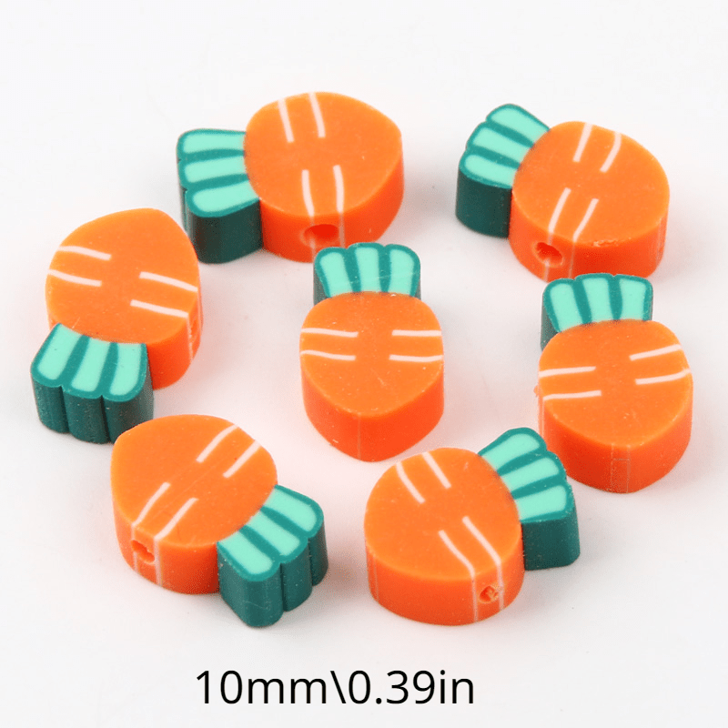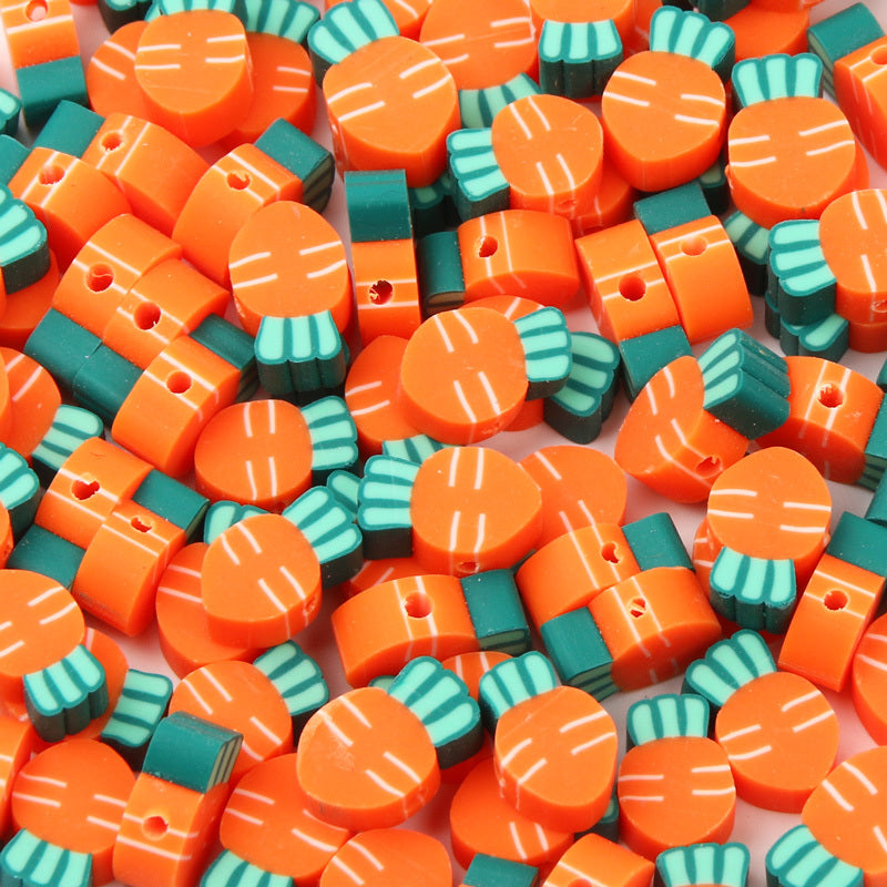 Add a playful touch to your handmade accessories with these colorful carrot-shaped polymer clay beads. Perfect for creating unique bracelets, necklaces, and earrings.