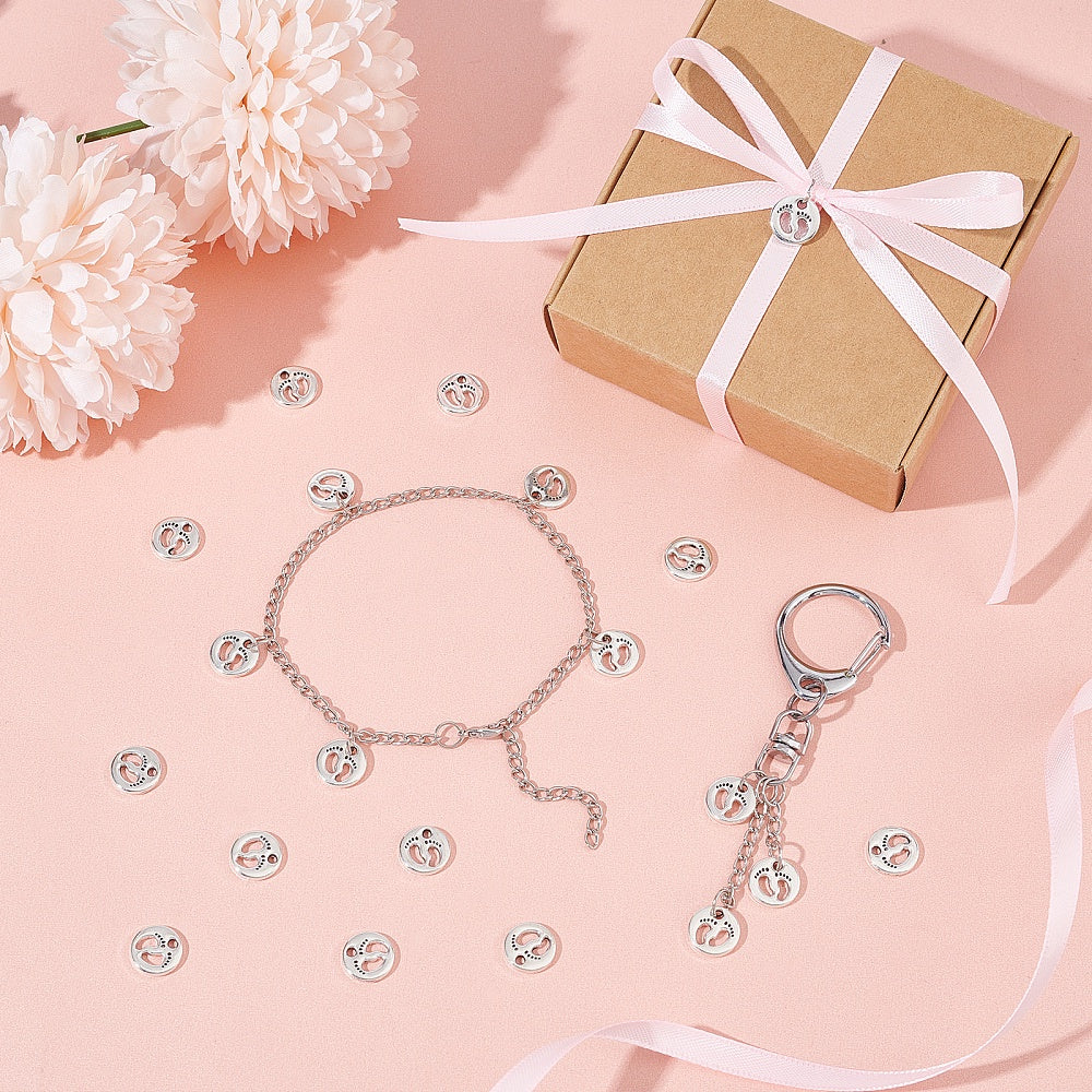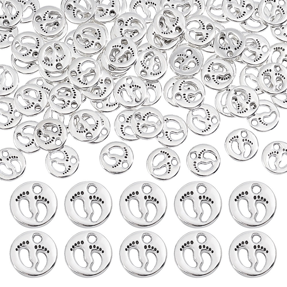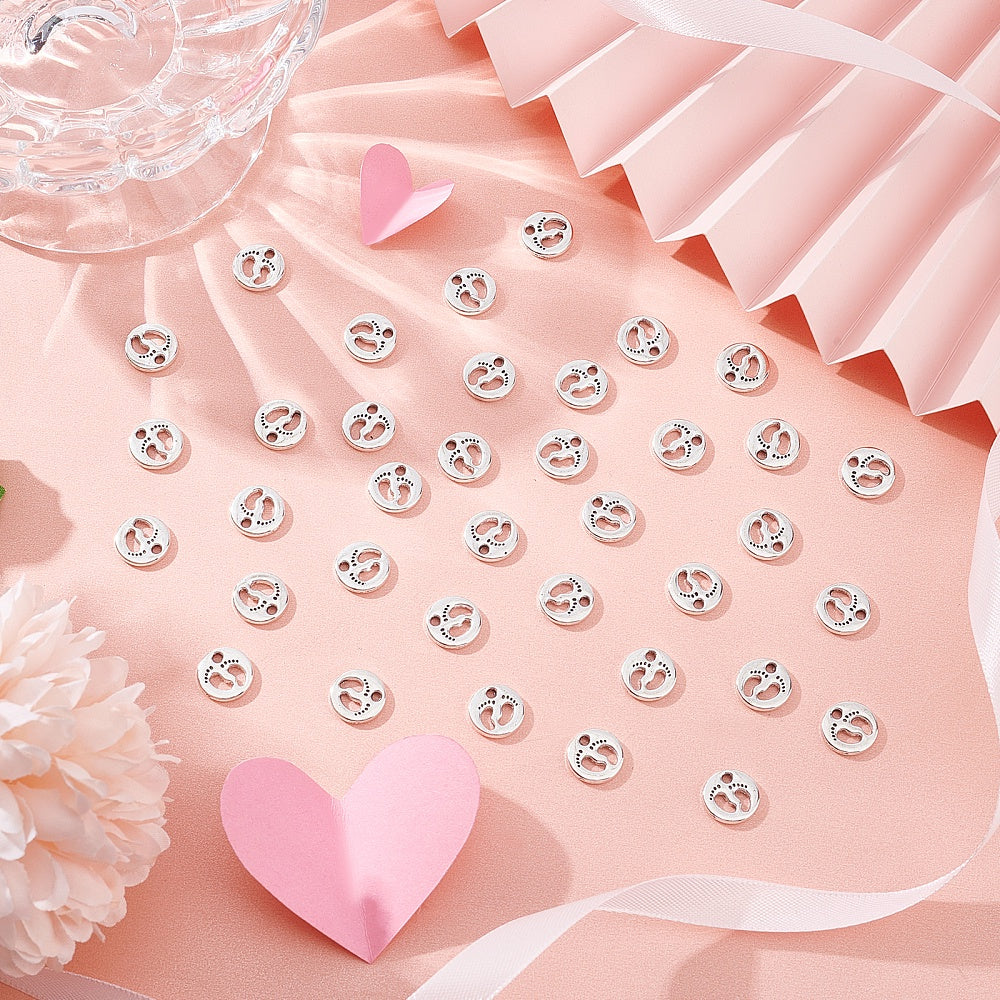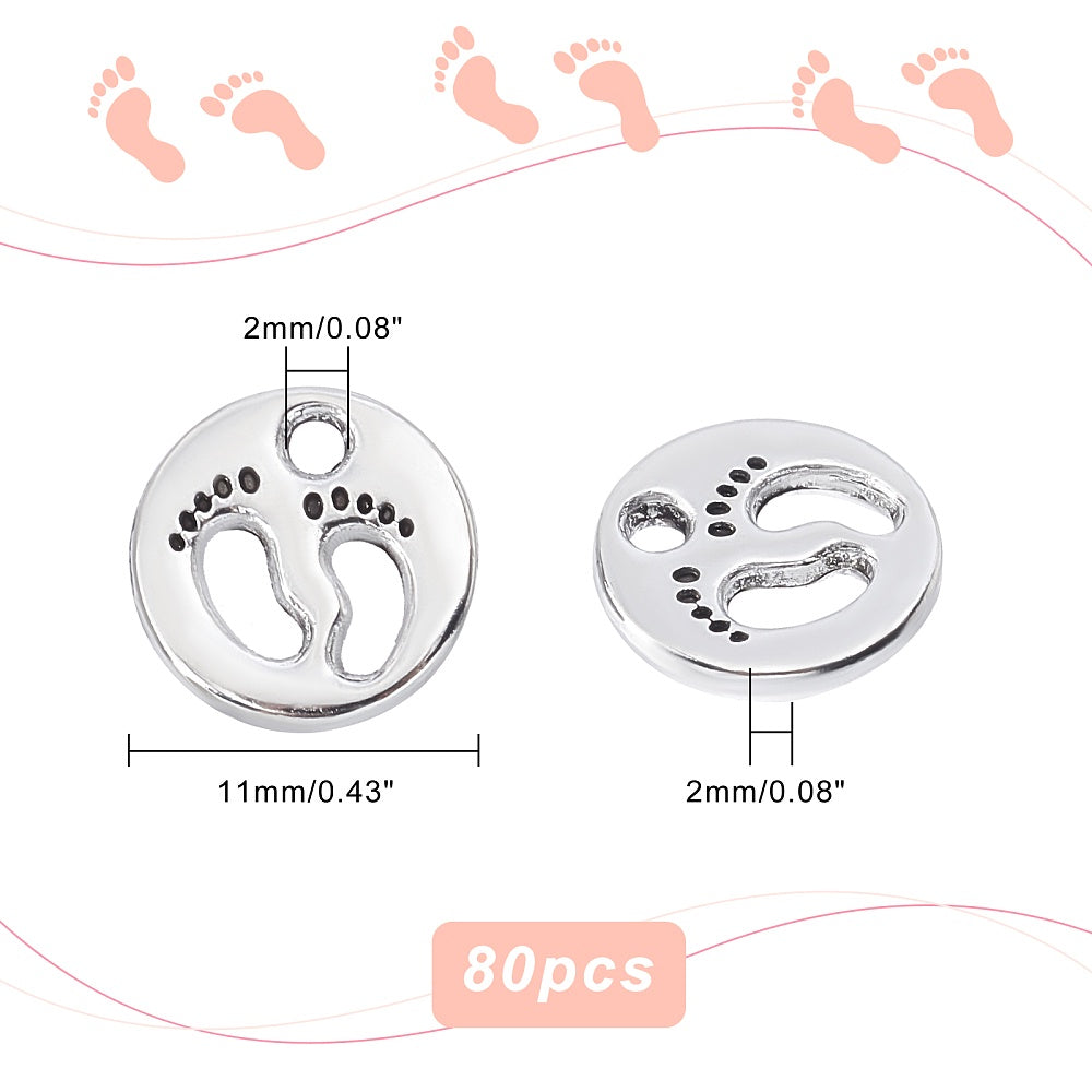 Get creative with these 30 silvery hollow baby foot print round alloy pendants. Perfect for DIY jewelry making projects. Each pendant measures approximately 17.35x10.16x1.5mm with a hole size of 1.3mm.