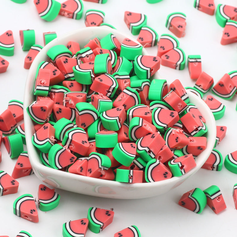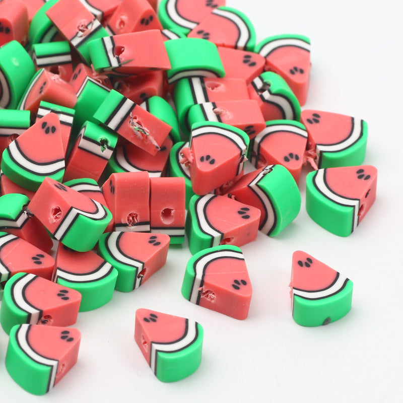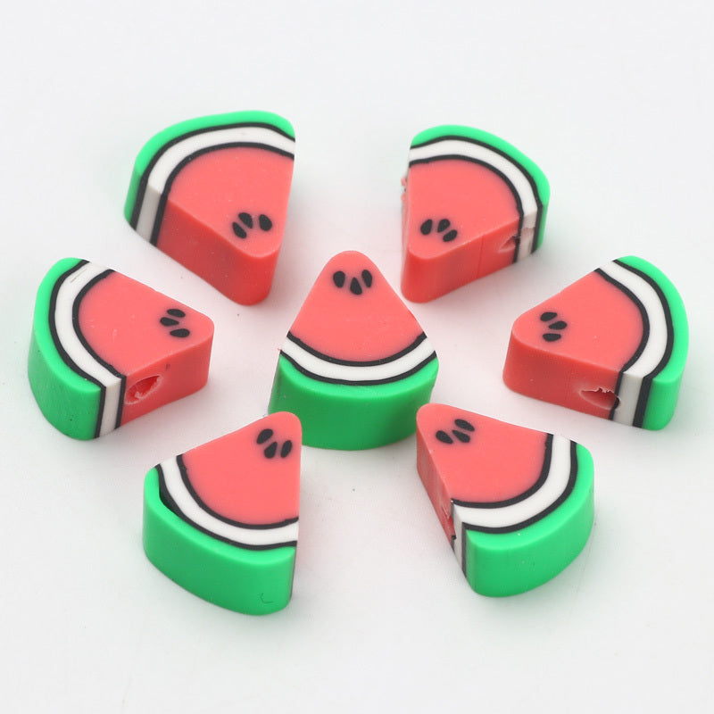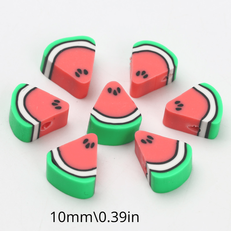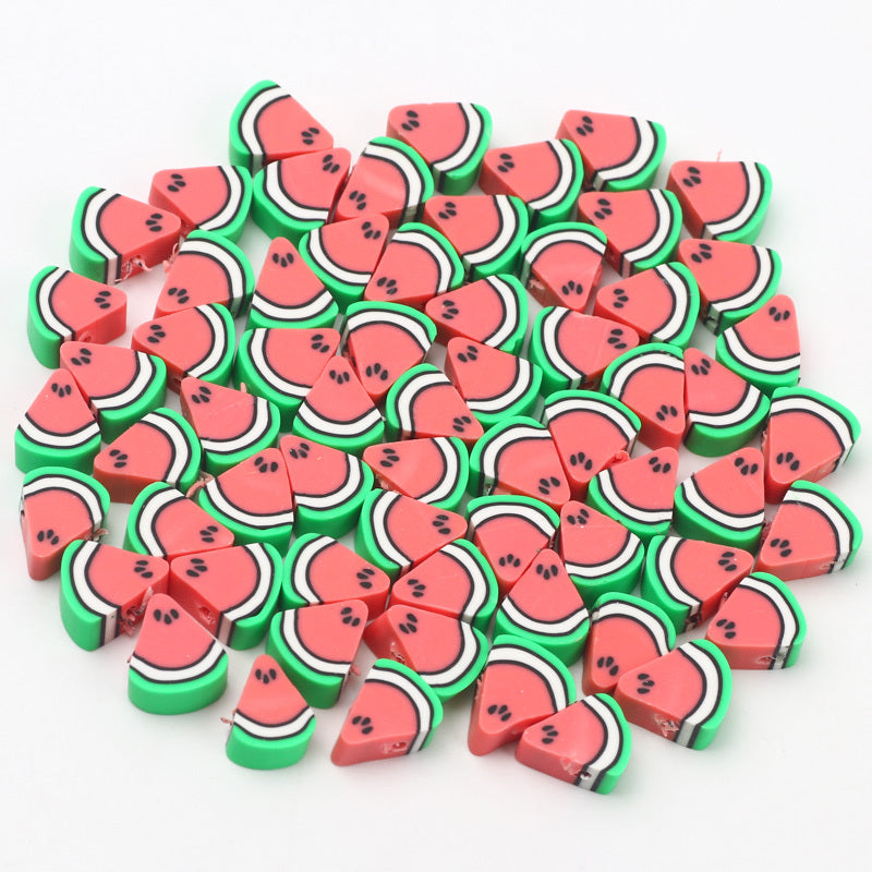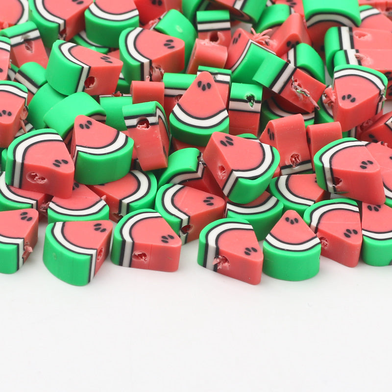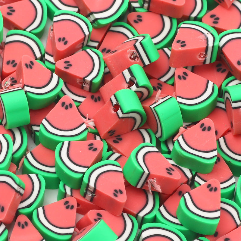 These polymer clay beads feature a fun watermelon pattern, perfect for creating vibrant jewelry pieces. Each pack contains 30 spacer beads.