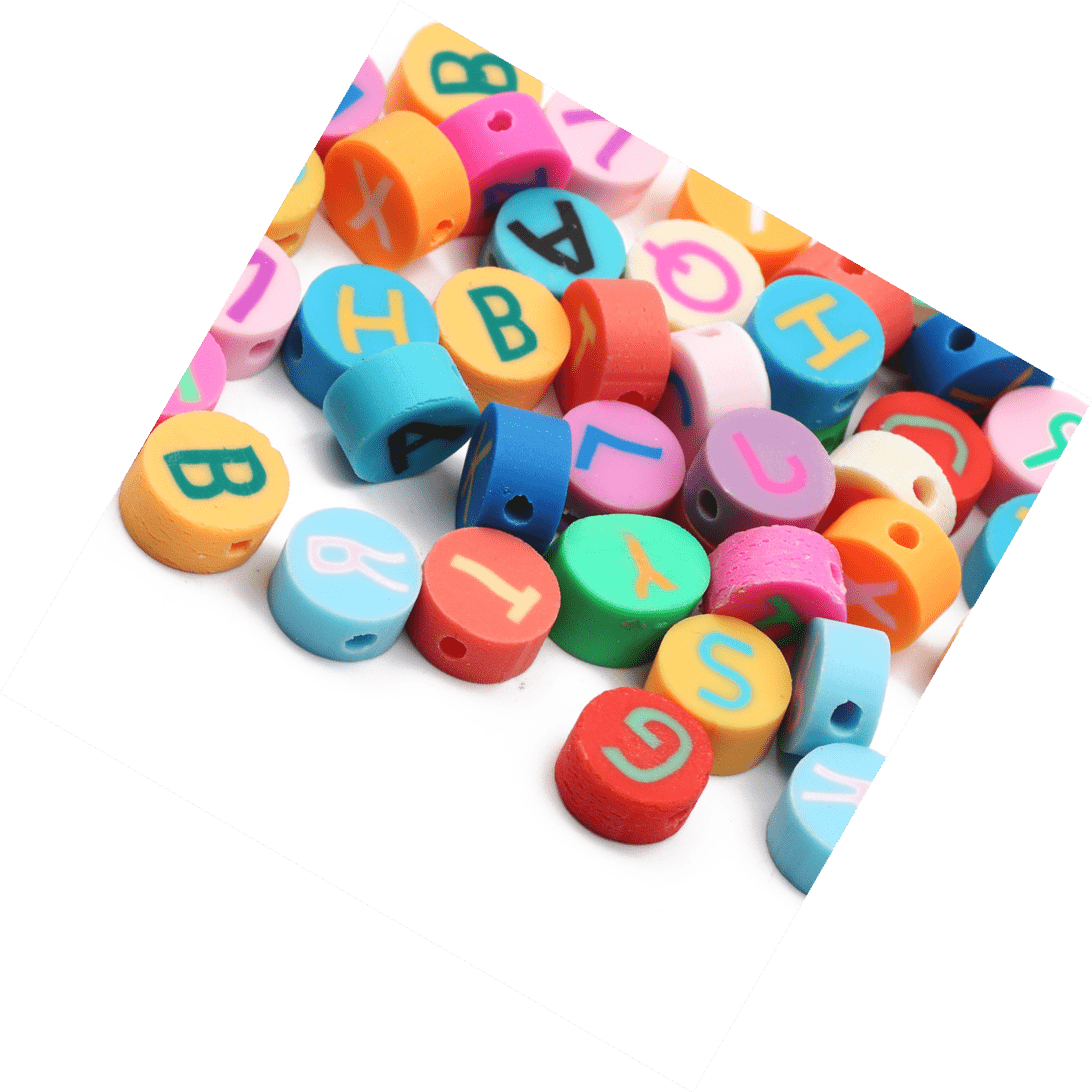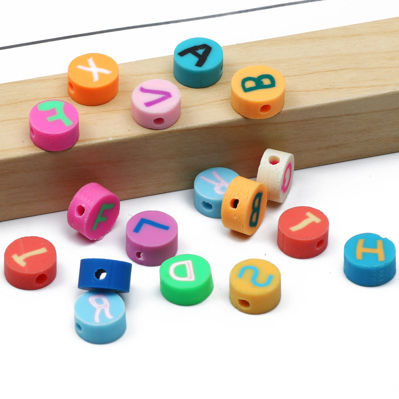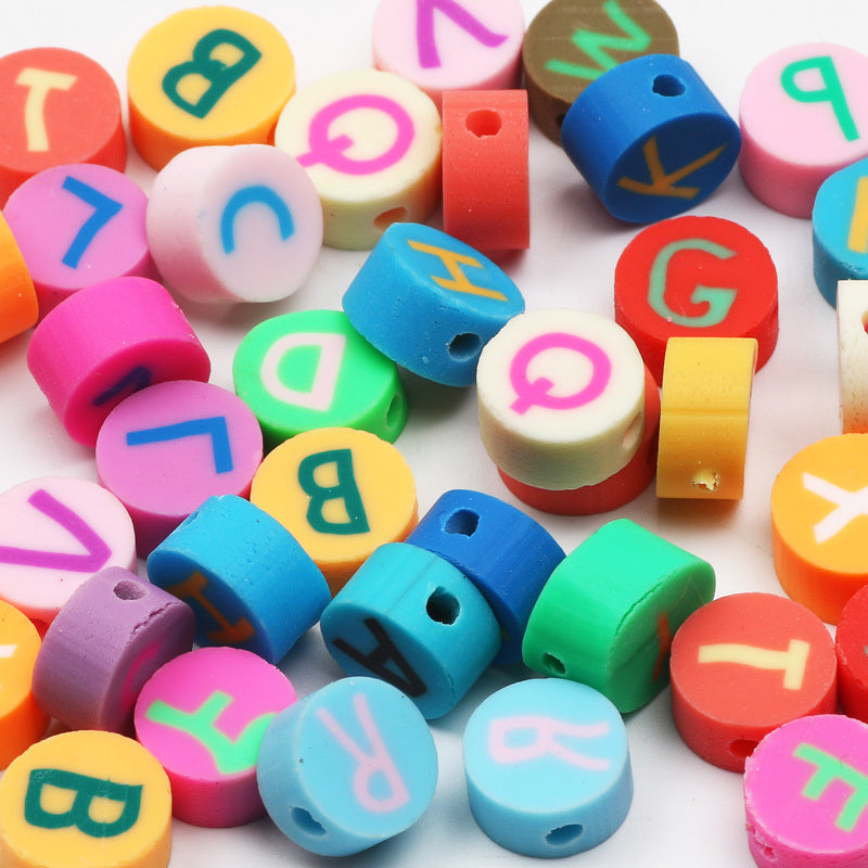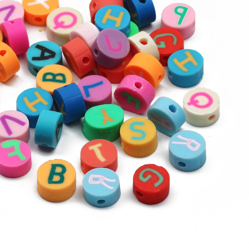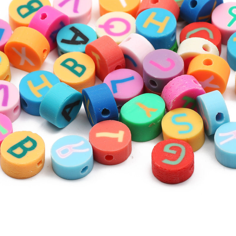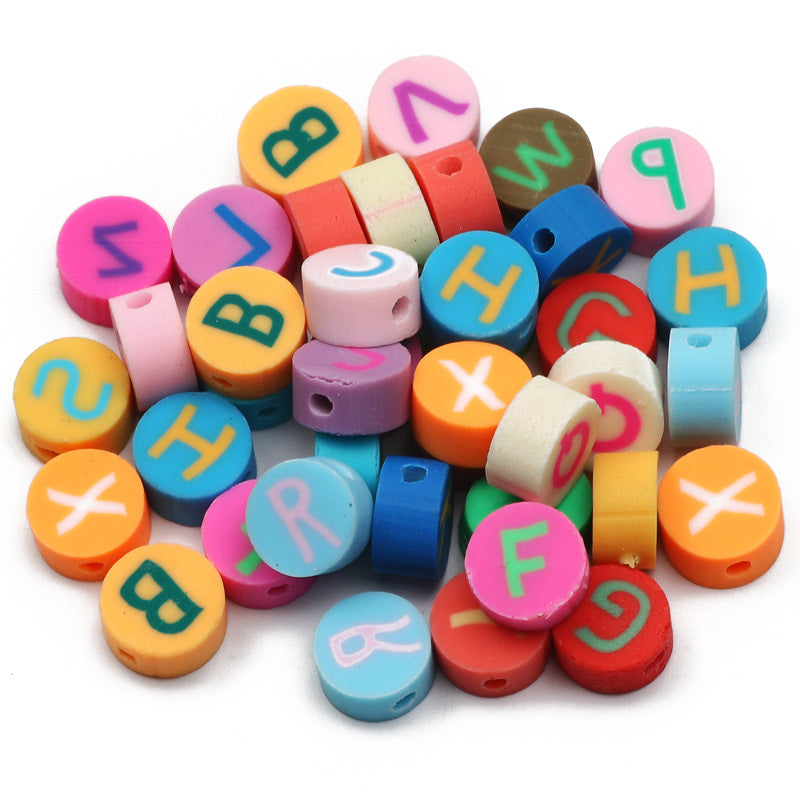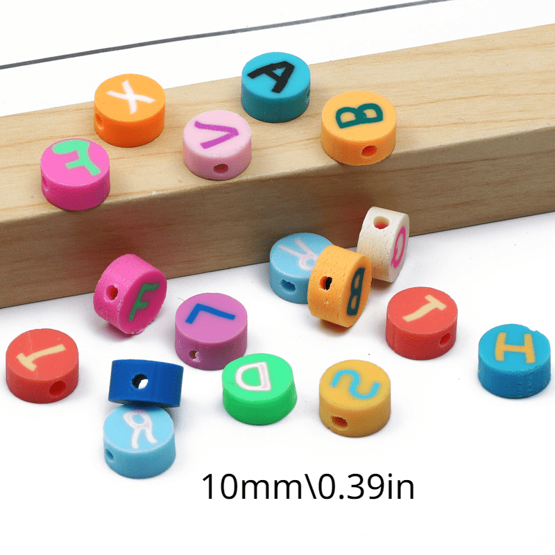 Create unique jewelry with this set of 30 polymer clay beads. Each bead is 10mm in size with mixed letter details, perfect for bracelets and DIY accessories.