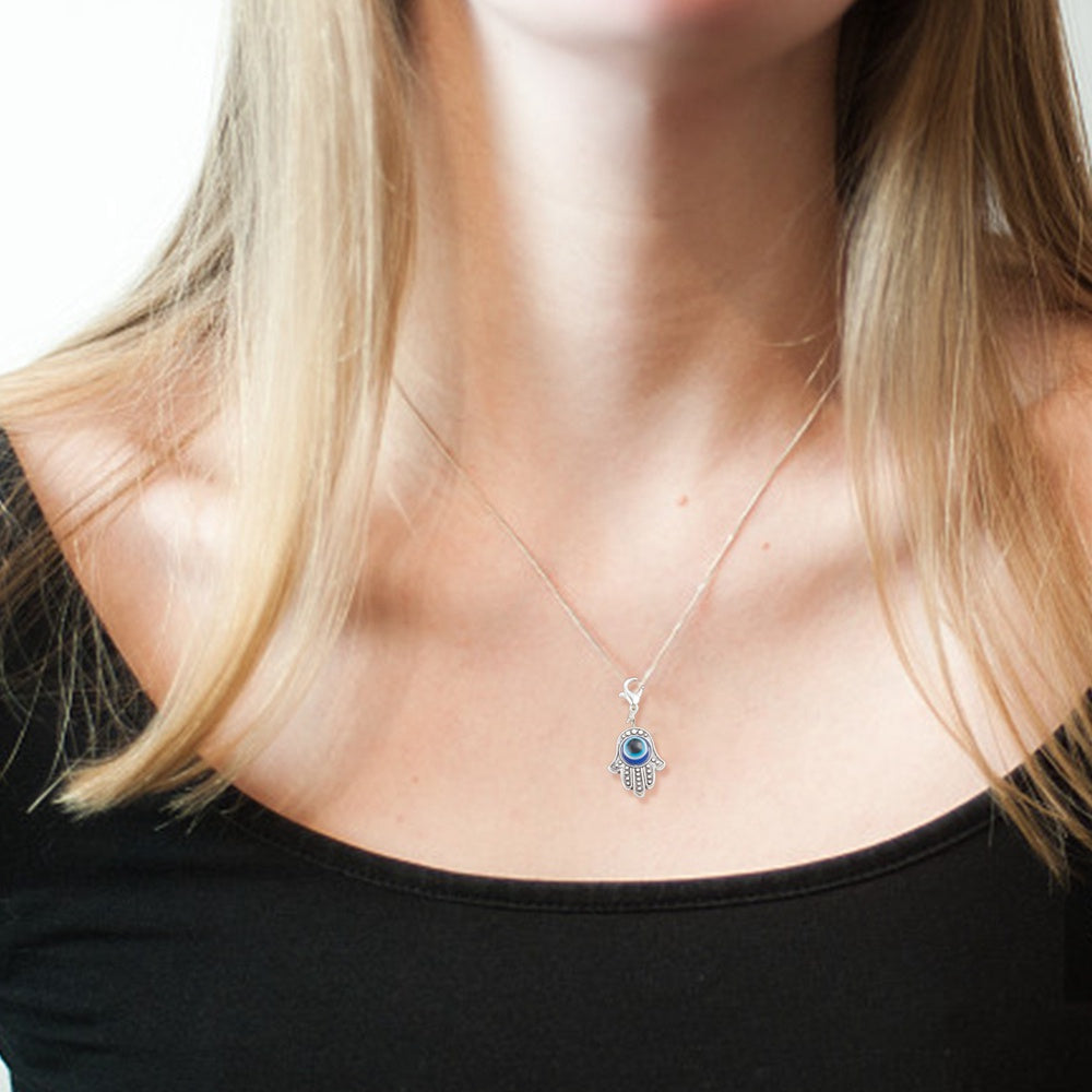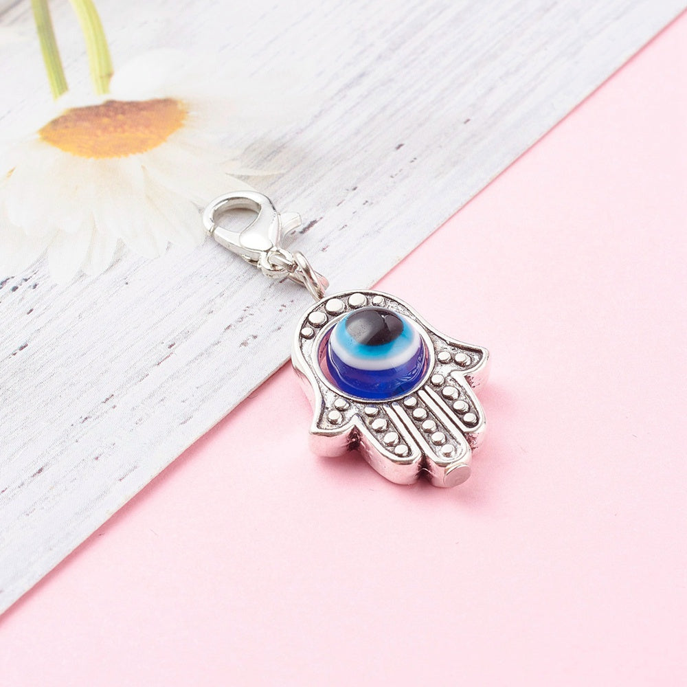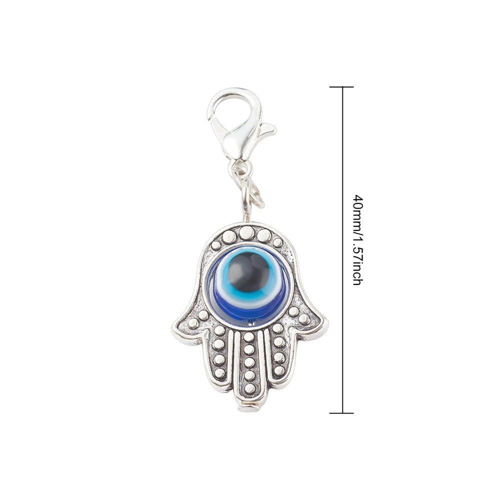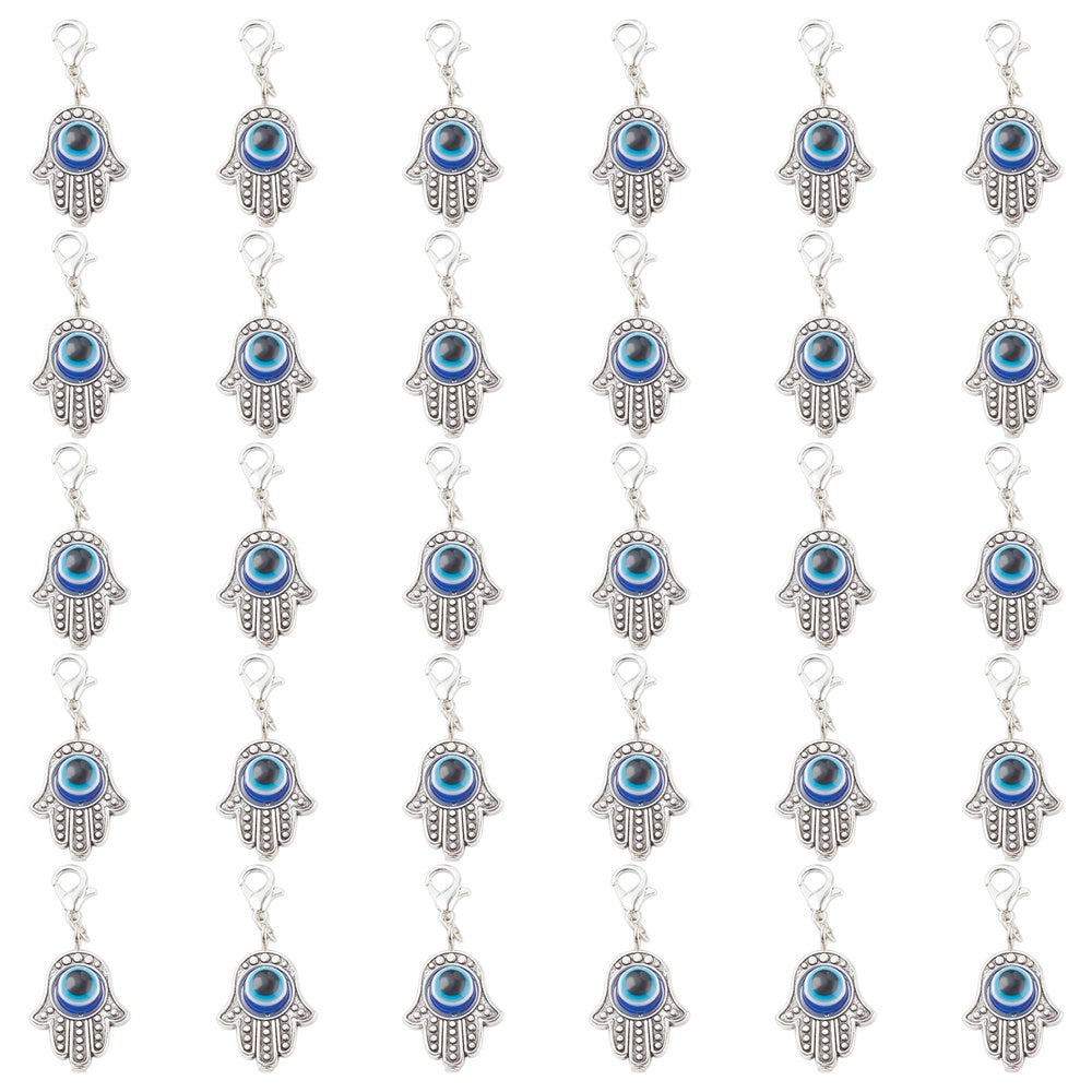 This set includes 30 antique silver and platinum Hamsa hand pendants with lobster claw clasps, perfect for DIY jewelry making projects.