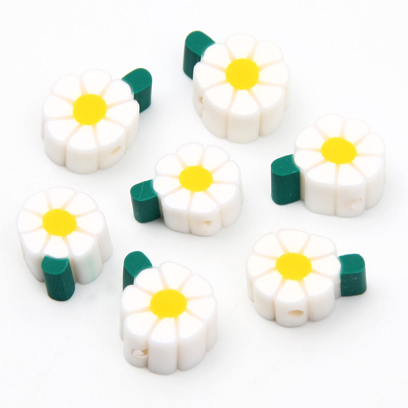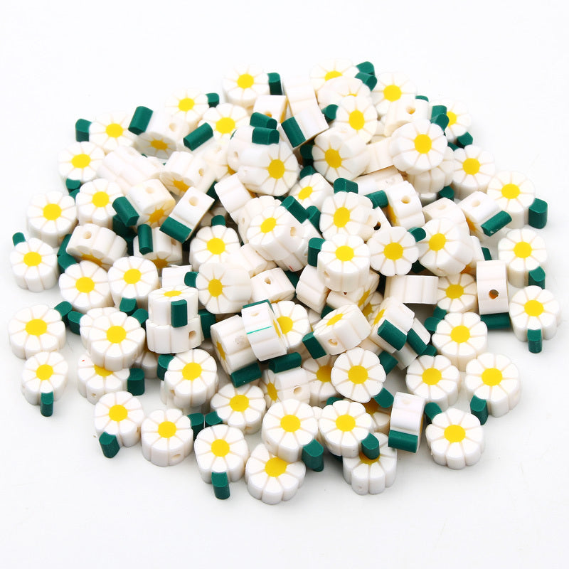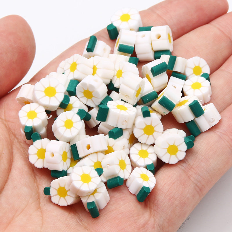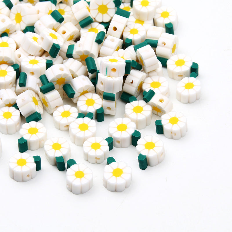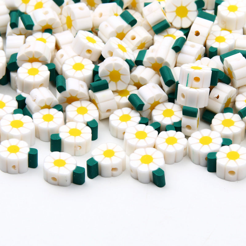 These daisy pattern polymer clay beads are perfect for creating unique jewelry pieces. Use them to make bracelets, earrings, and other accessories. Each pack contains 30 spacer beads.