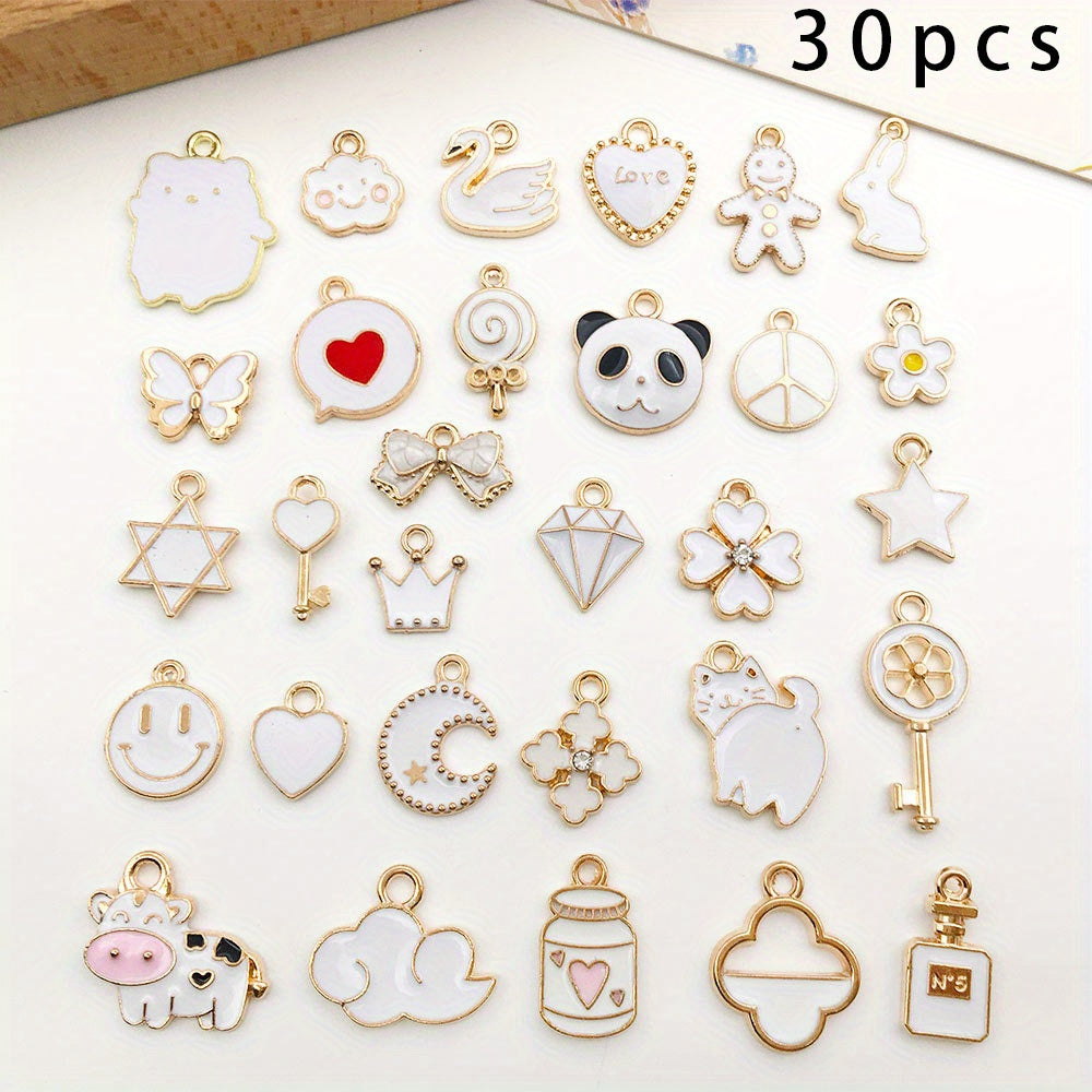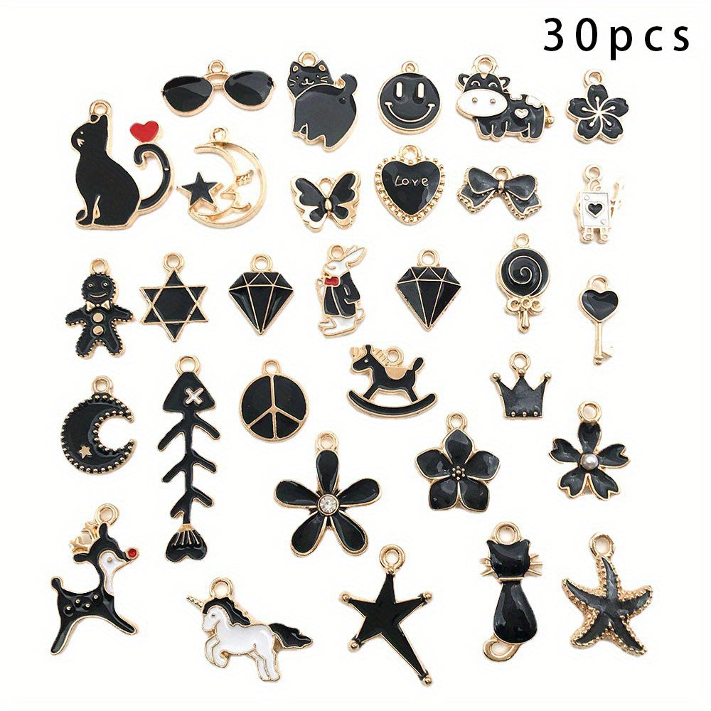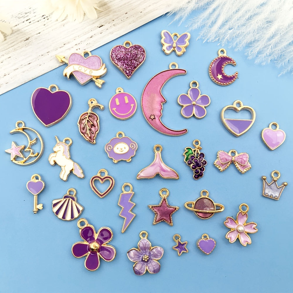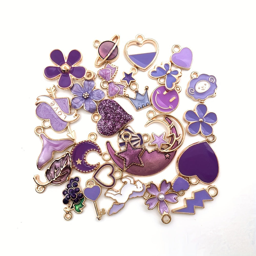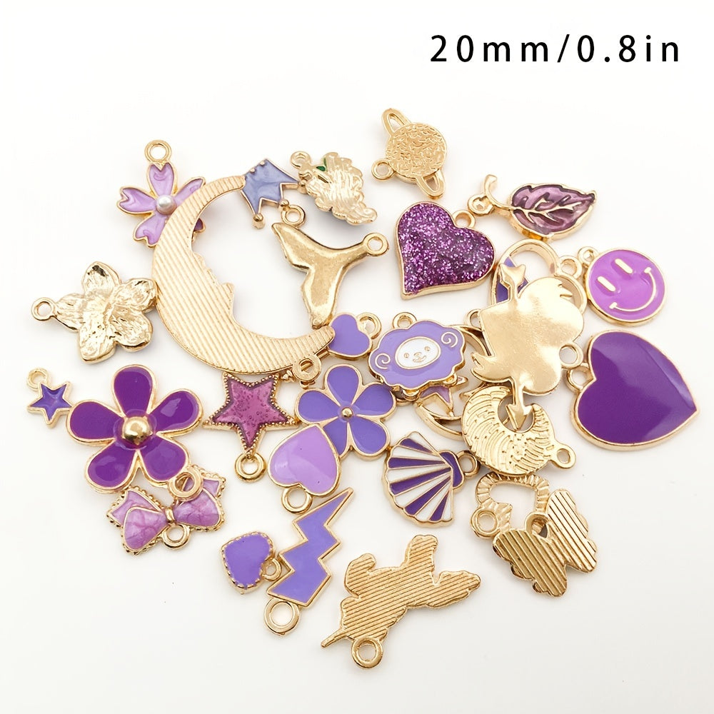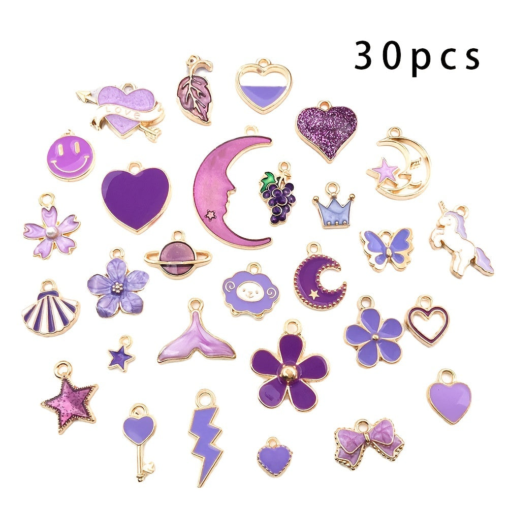 Enhance your DIY jewelry projects with this set of 30 purple alloy drip oil pendants featuring lightning, flower, love, and grape designs. Perfect for adding a unique touch to your creations.