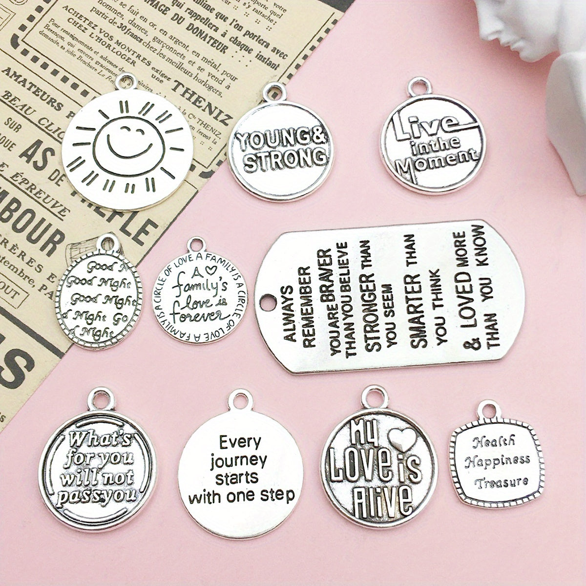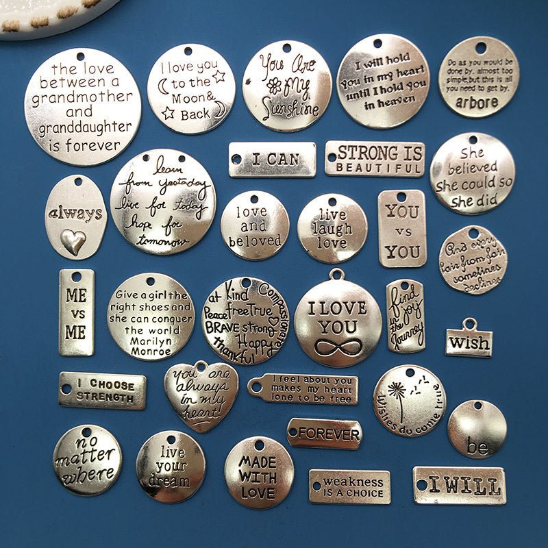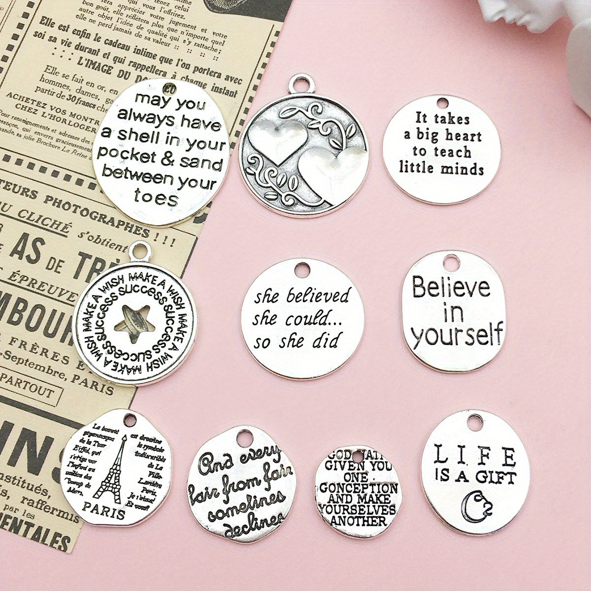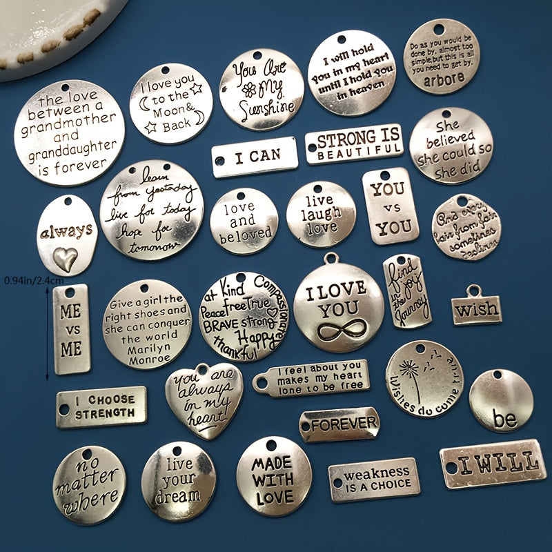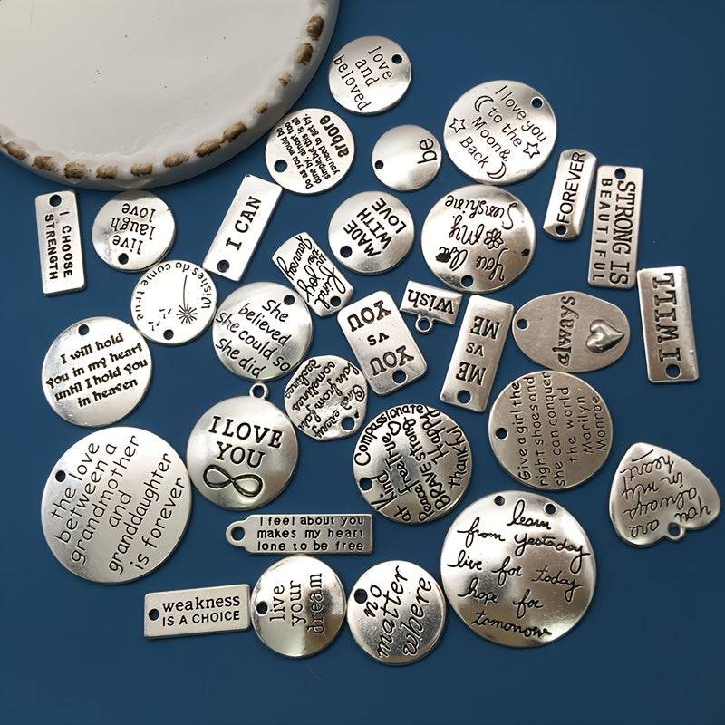 Get inspired with this set of 30 antique silver zinc alloy charms featuring motivational words and letters. Perfect for creating personalized necklaces, bracelets, and other DIY jewelry projects.