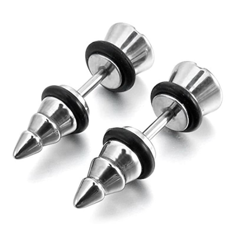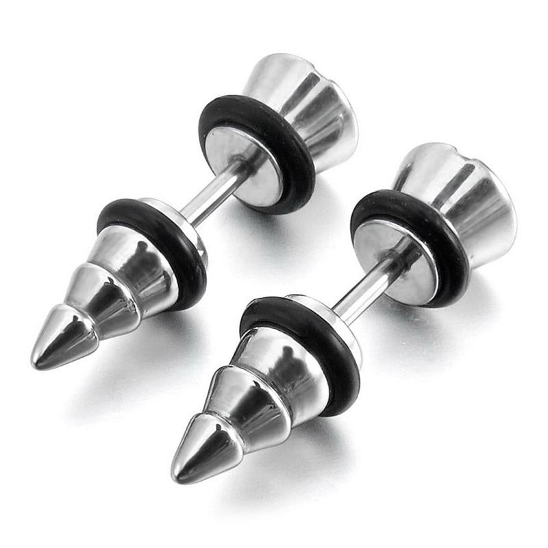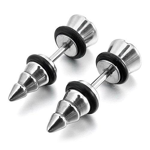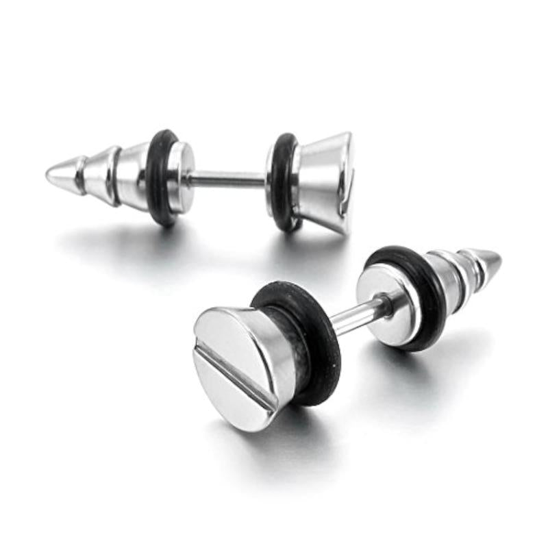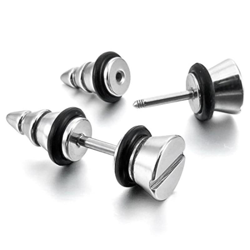 Elevate your style with these trendy stainless steel stud earrings featuring rubber tone screw spike plug tapers. Perfect for adding a touch of edginess to any outfit.