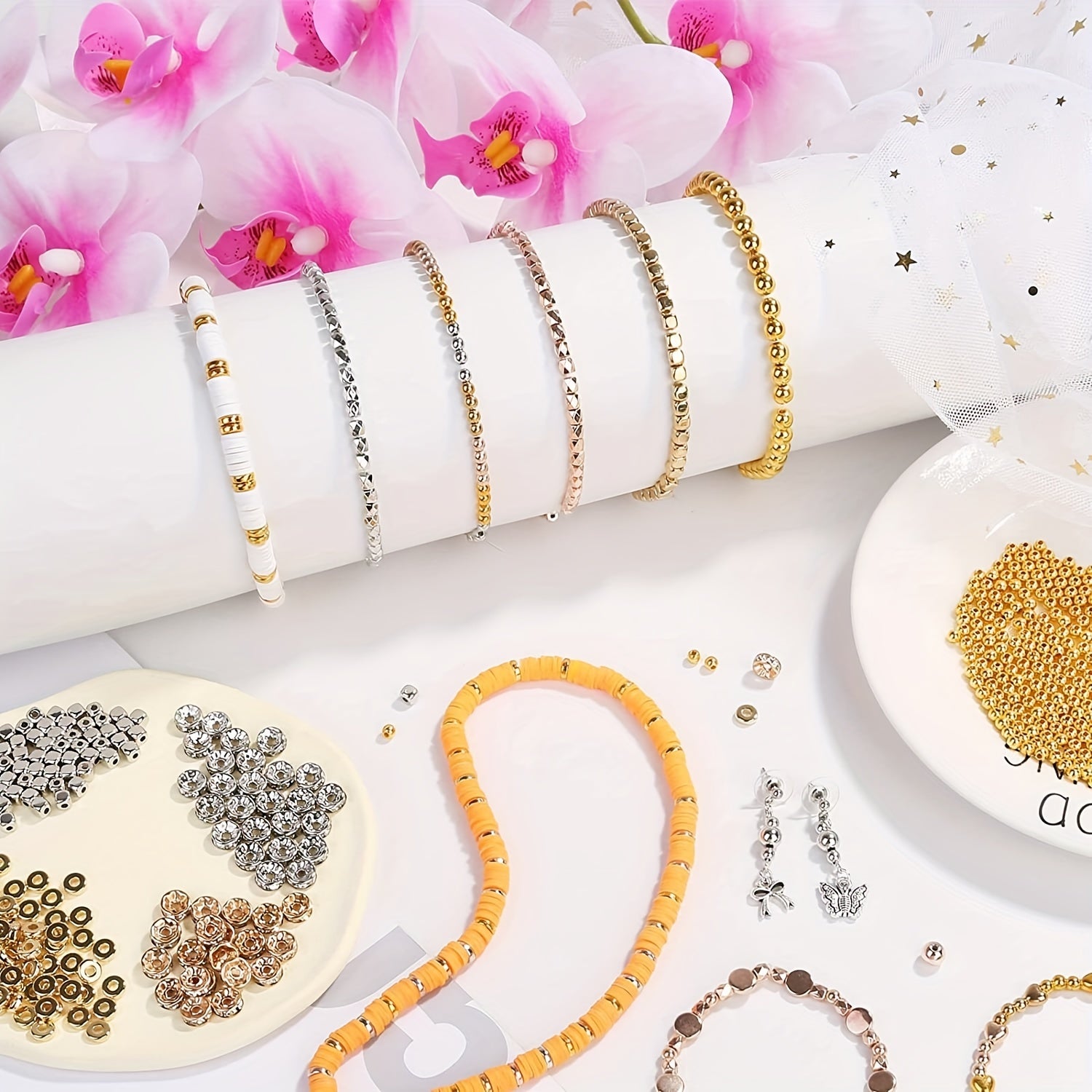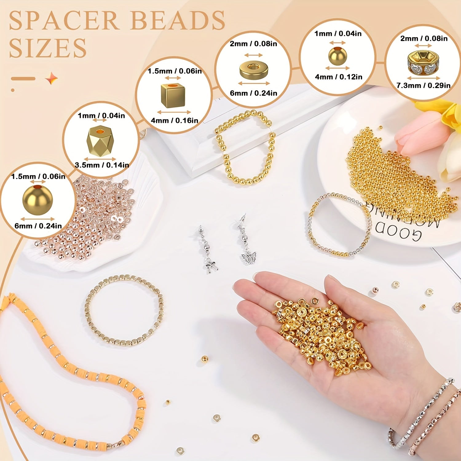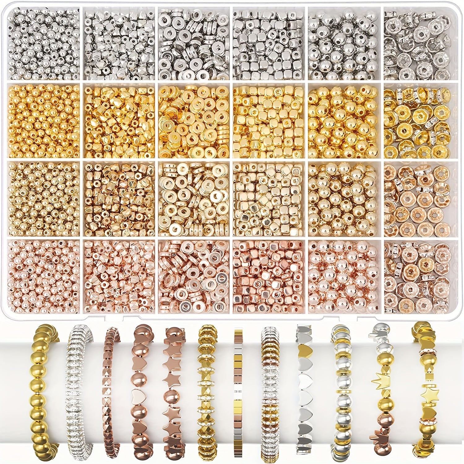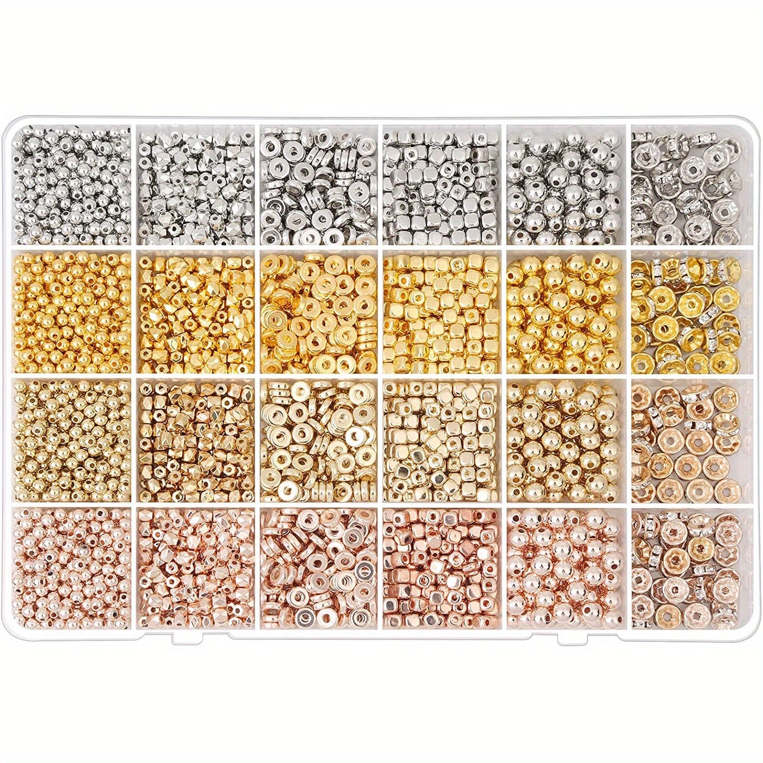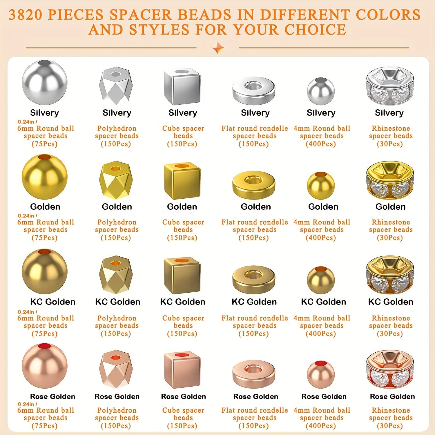 Get creative with this set of 3820 spacer beads in various styles including round, flat, cube, bracelet, and rhinestone spacers. Perfect for jewelry making and DIY crafting projects. Available in golden and silver colors.