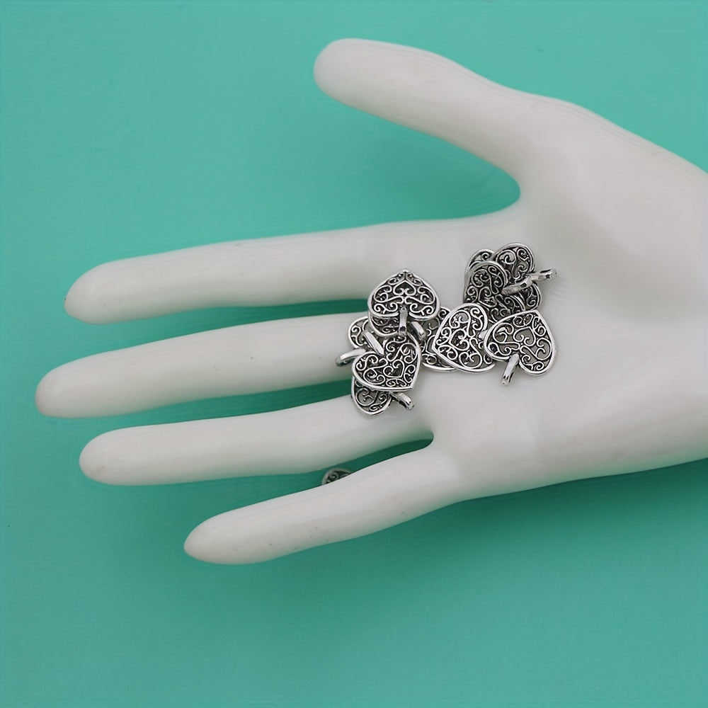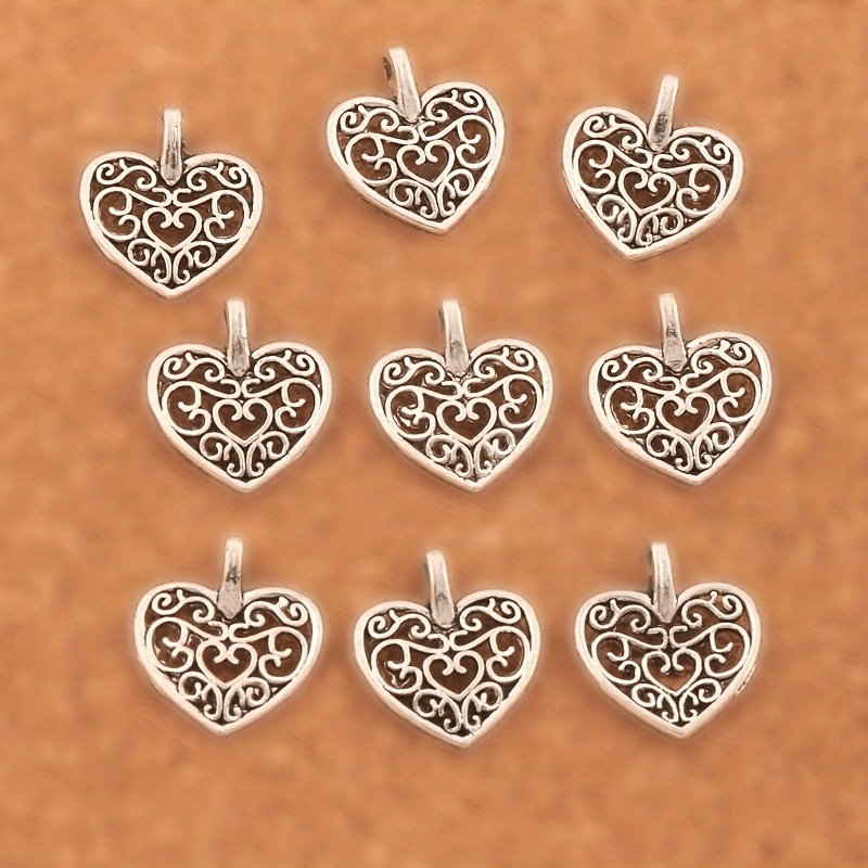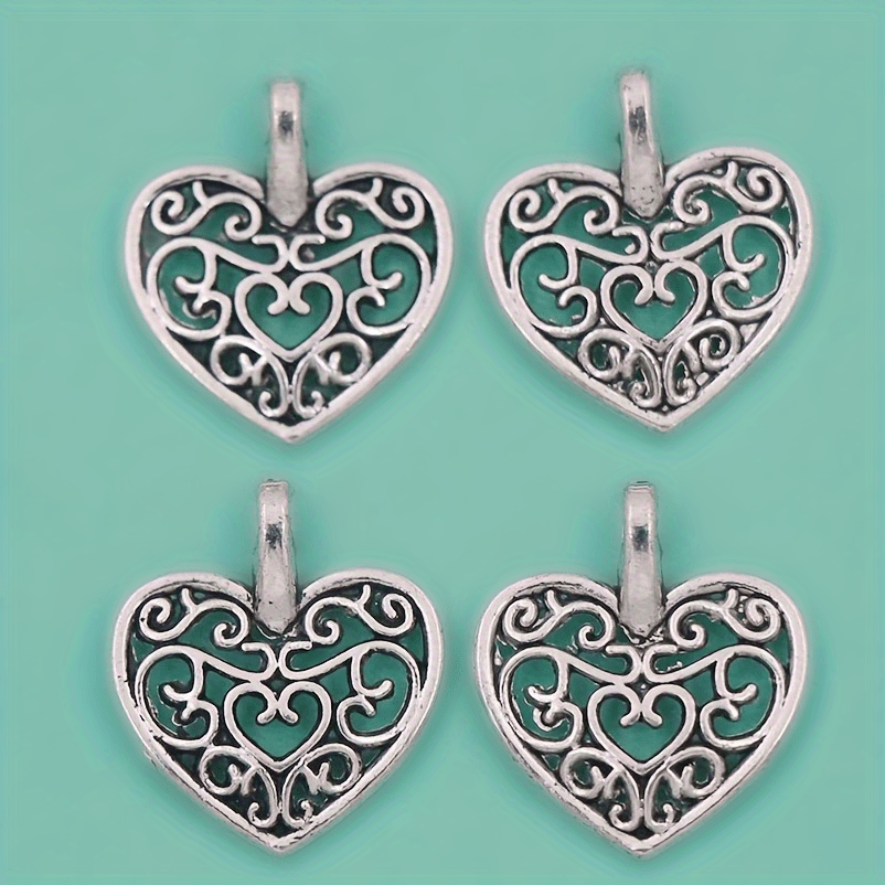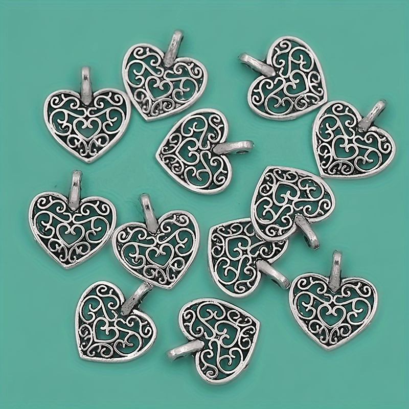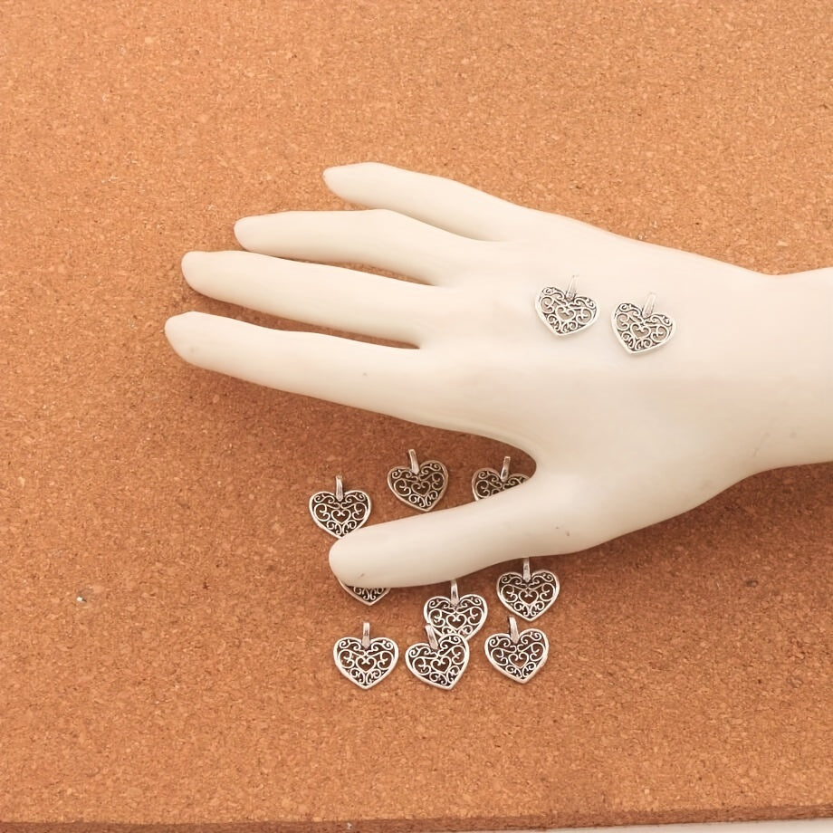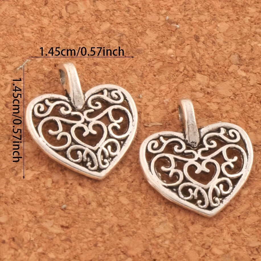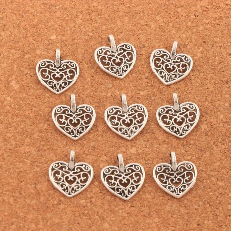 These antique silvery alloy pendant charms feature a hollow out heart pattern, perfect for creating your own necklaces, bracelets, and other jewelry items. Enhance your DIY projects with these charming charms.