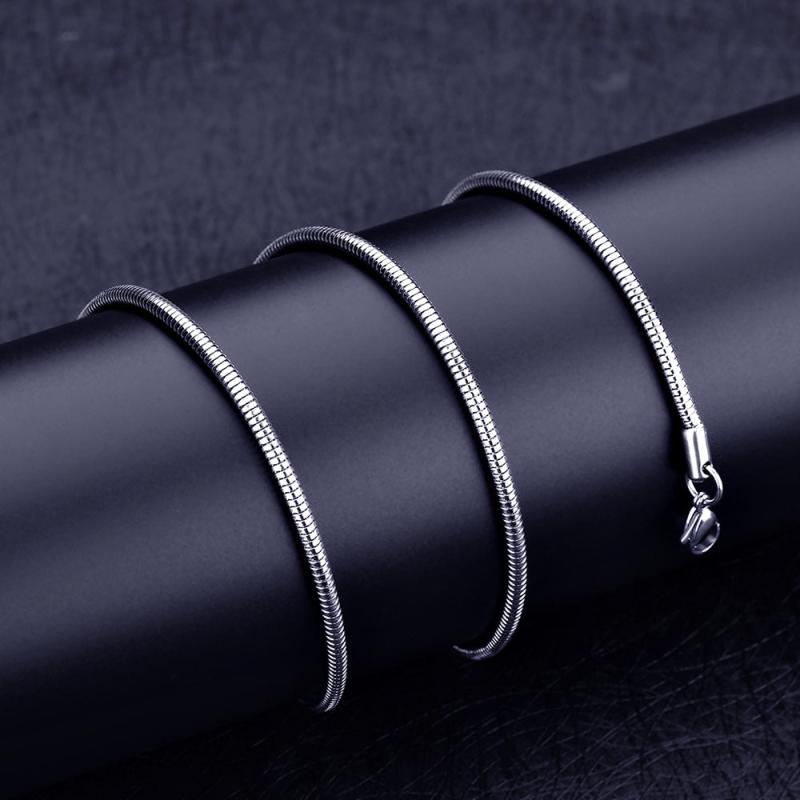 This 3mm wide snake chain necklace is crafted from 316L stainless steel with a polished finish, making it durable and tarnish resistant. Suitable for casual attire.