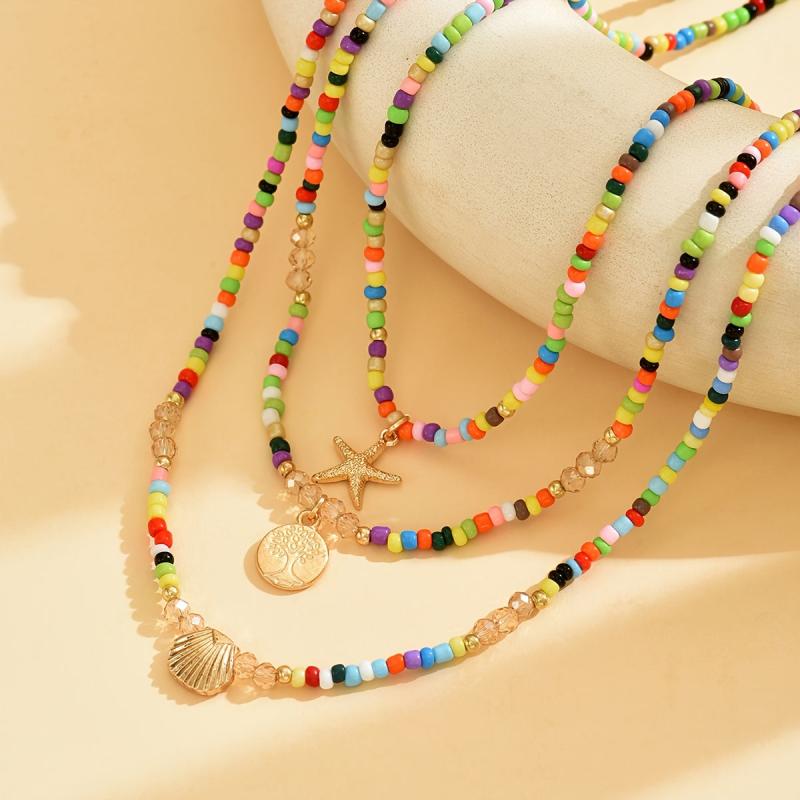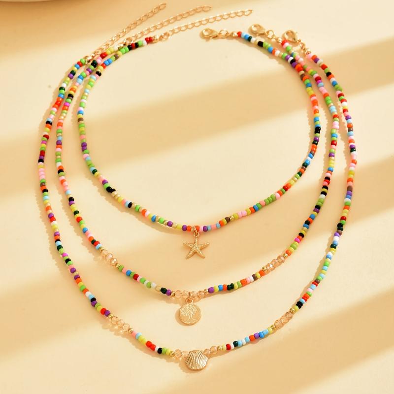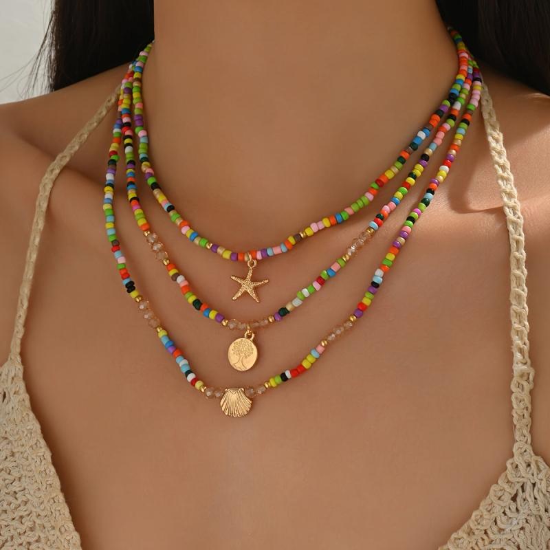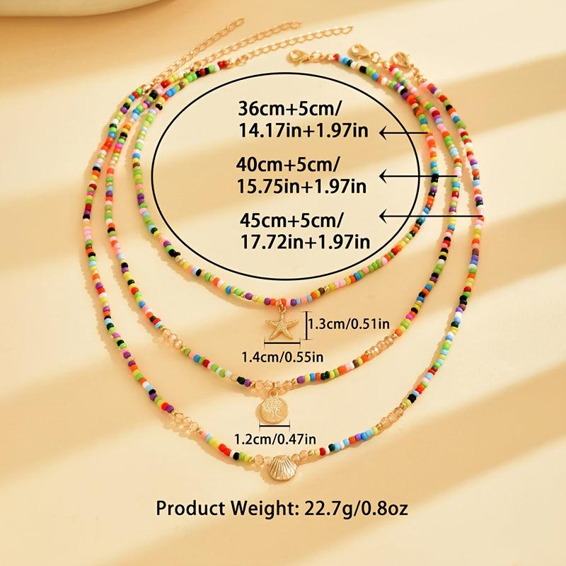 Add a pop of color with this 3-piece boho necklace set featuring multicolor glass seed beads and charming starfish and shell pendants. Perfect for beach vacations or casual outfits.