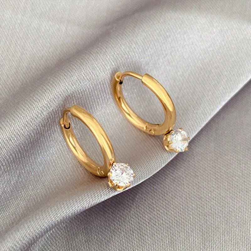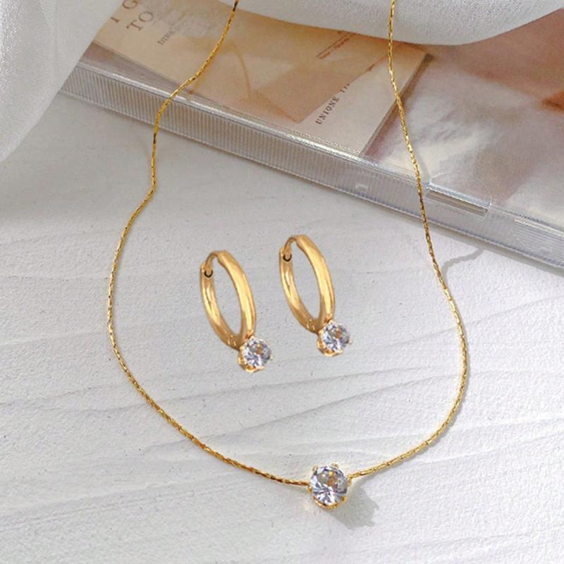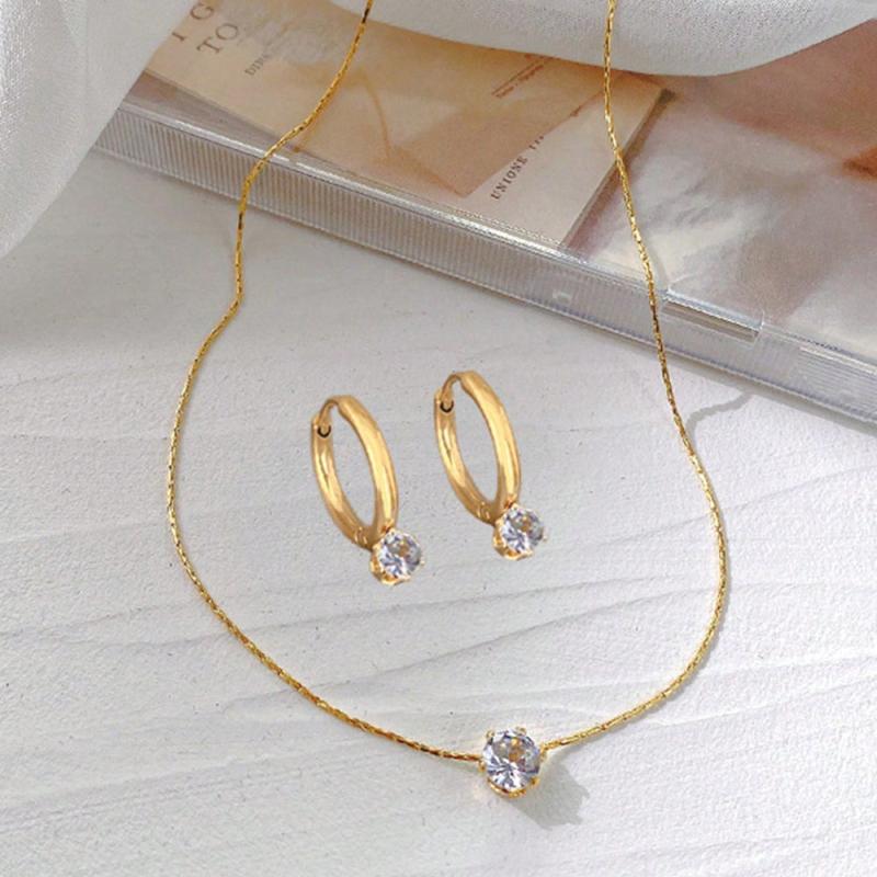 This stunning 3-piece jewelry set includes a necklace and earrings made with 18K plated stainless steel and synthetic diamond accents. Perfect for adding a touch of elegance to any outfit.