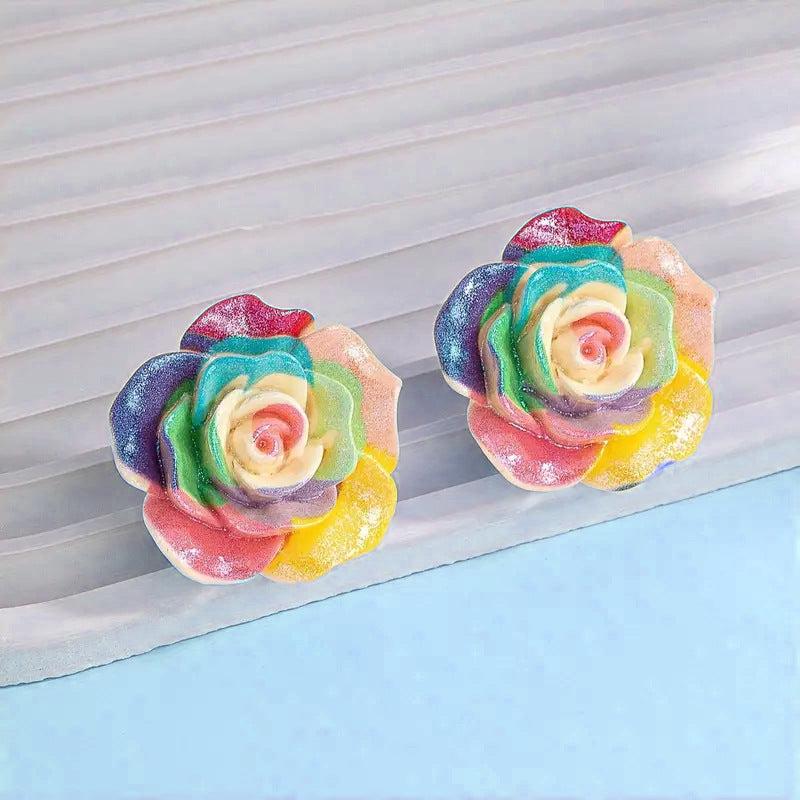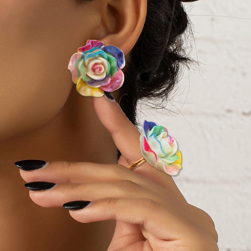 Add a touch of sparkle with this set of colorful luminous earrings and ring featuring a radiant powder rose design. A sweet gift for any occasion.