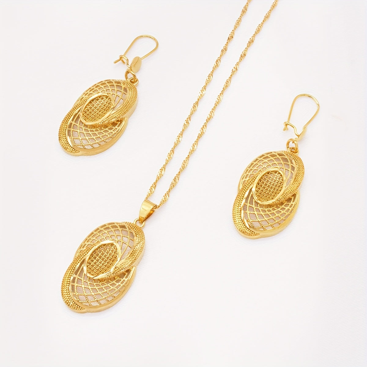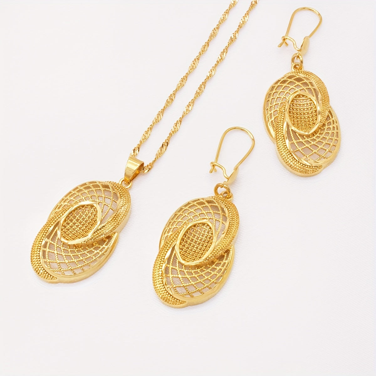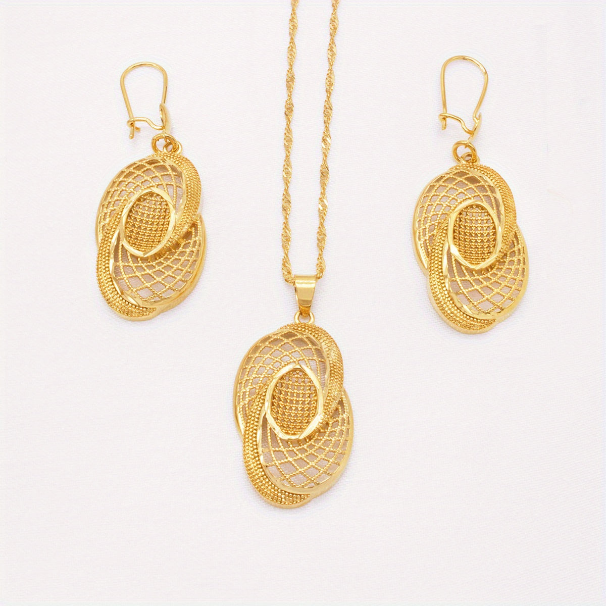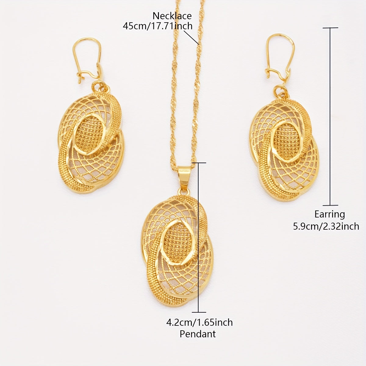 Add a touch of glamour to your look with this 3-piece jewelry set. Made with 18k gold plating, this set includes an exaggerated Indian-style necklace and matching earrings. Perfect for special occasions or to elevate your everyday style.