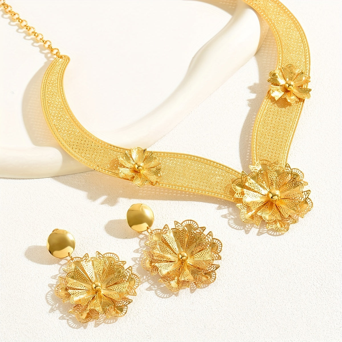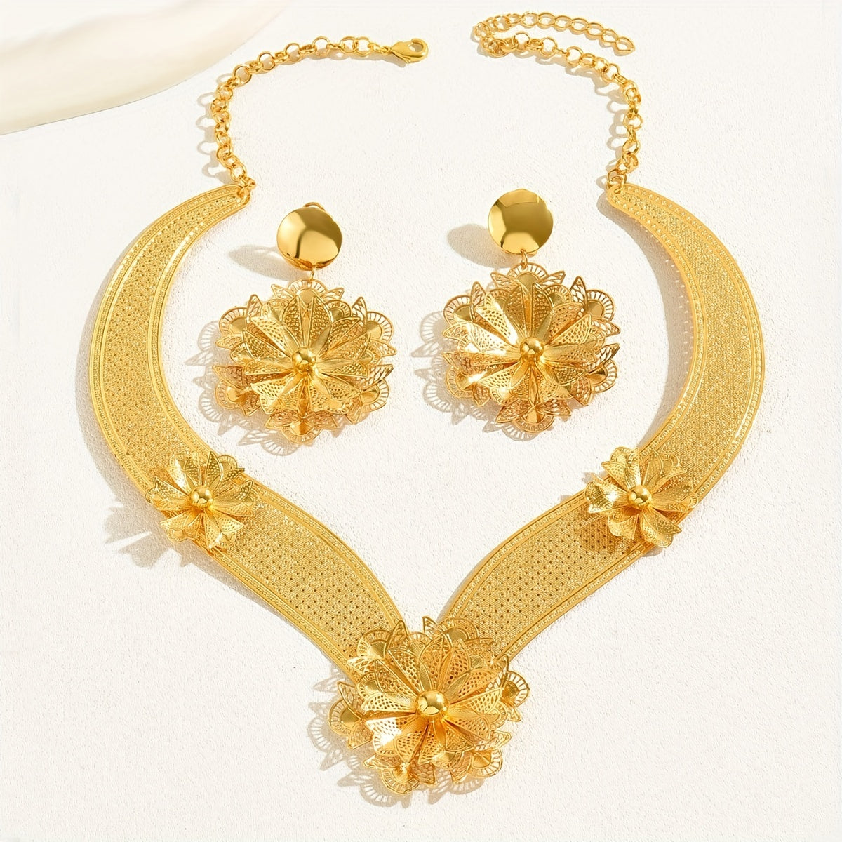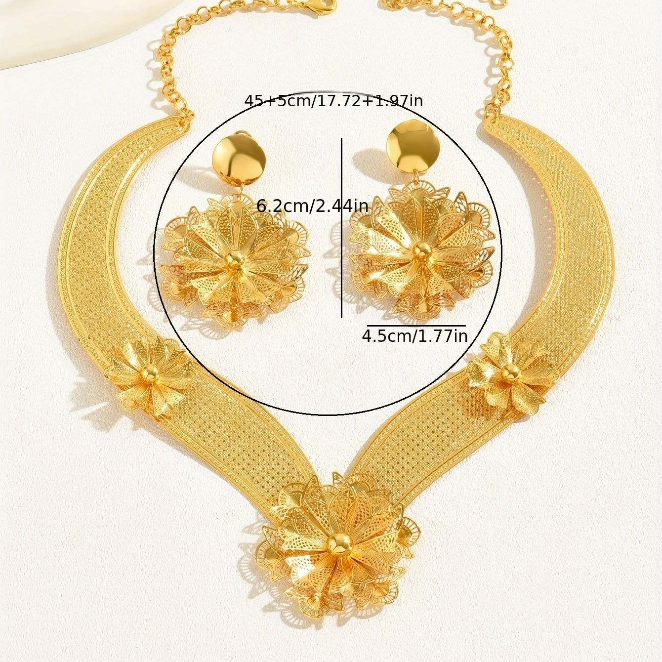 Make a statement with this stunning 3-piece jewelry set, perfect for evening parties and cocktail events. Each piece is plated with 18k gold for a luxurious touch.