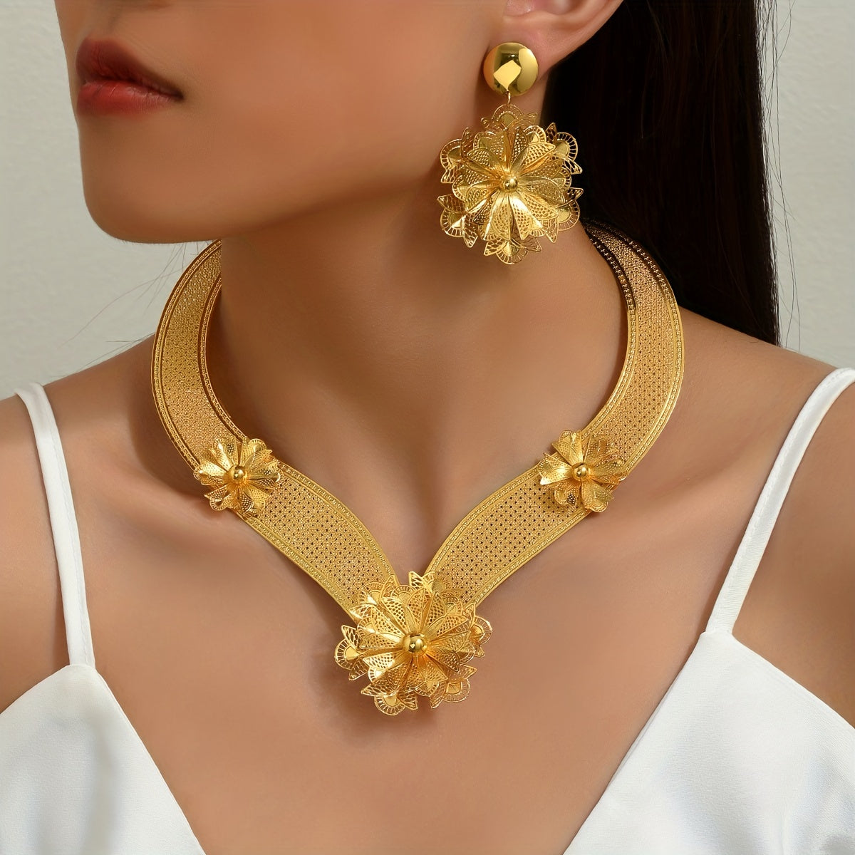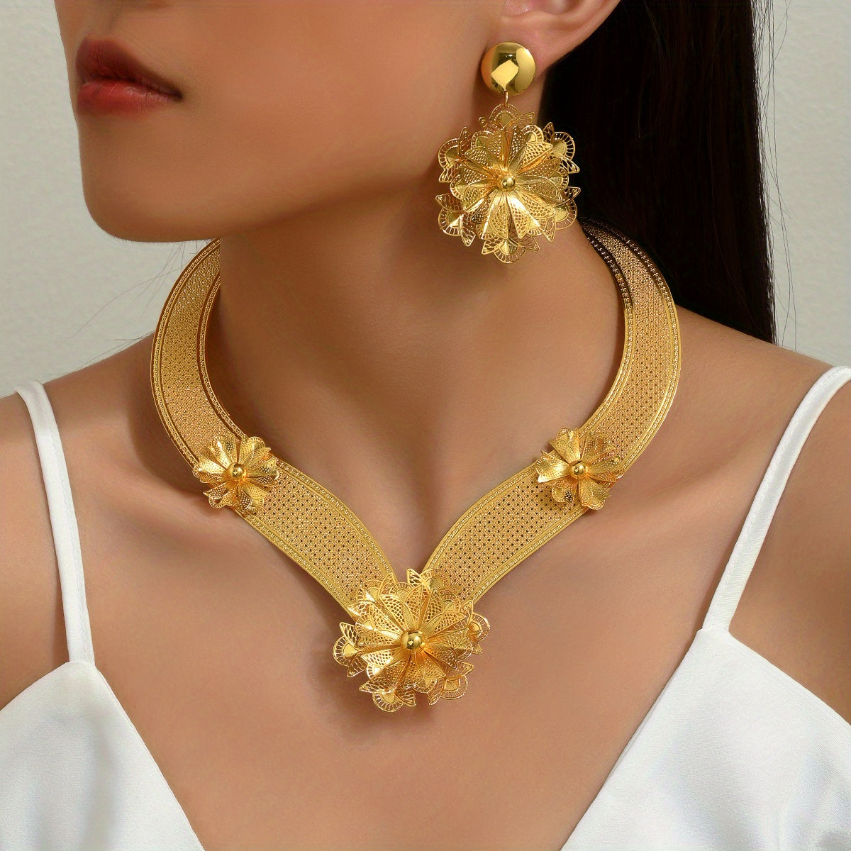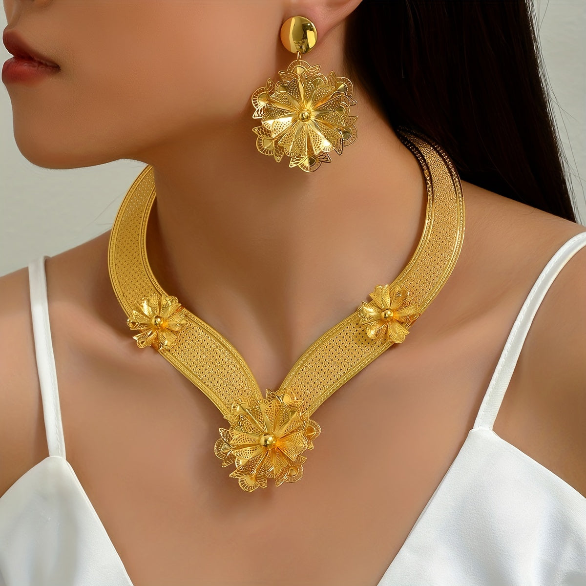 Make a statement with this stunning 3-piece jewelry set, perfect for evening parties and cocktail events. Each piece is plated with 18k gold for a luxurious touch.