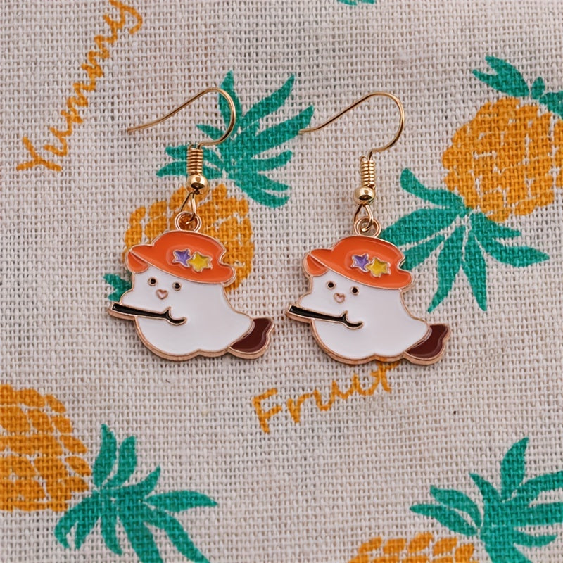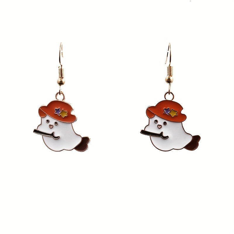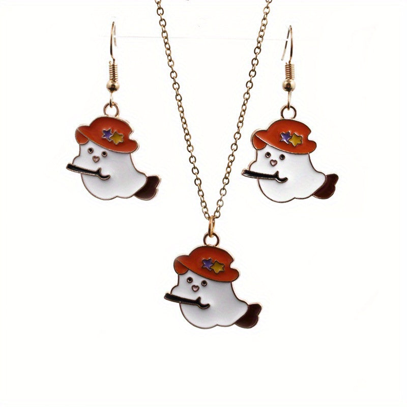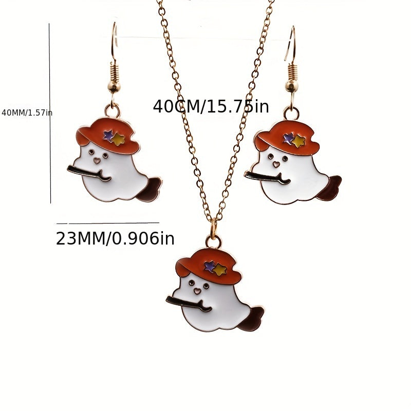 Add a spooky touch to your outfits with this Halloween jewelry set featuring cartoon ghost pendant earrings and necklace. Perfect for the holiday season!