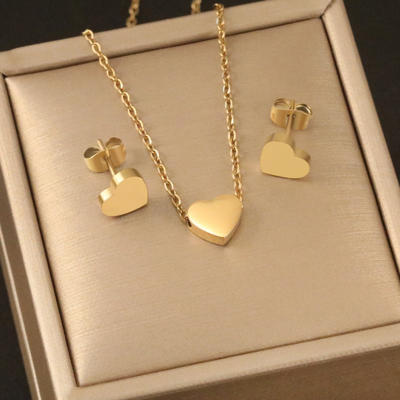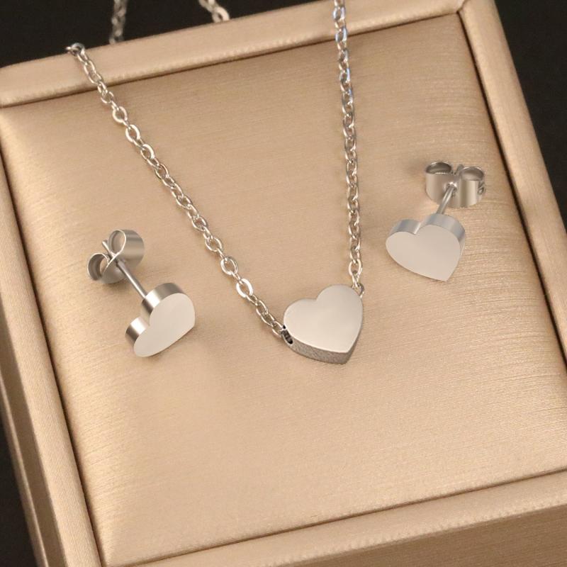 Complete your everyday look with this hypoallergenic stainless steel set featuring a classic small peach heart design. Perfect for daily wear.