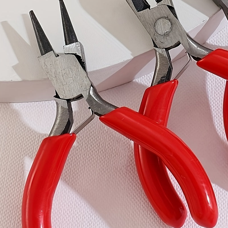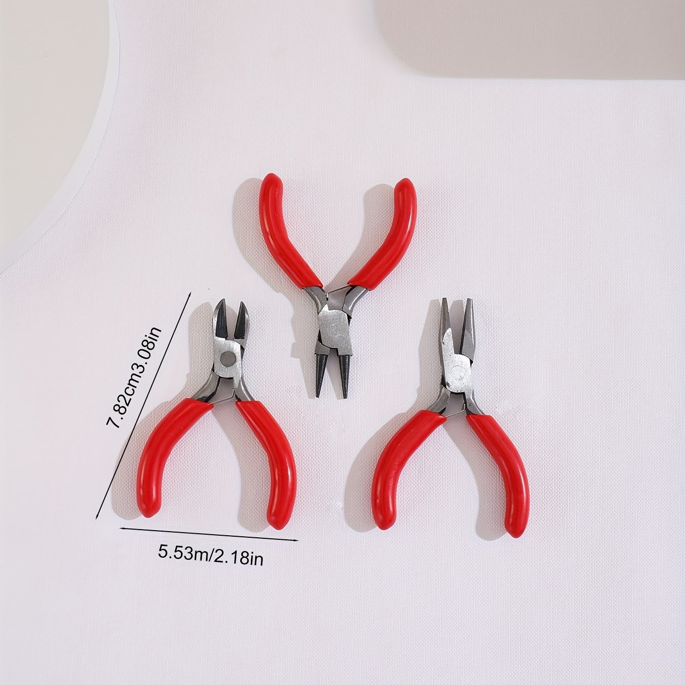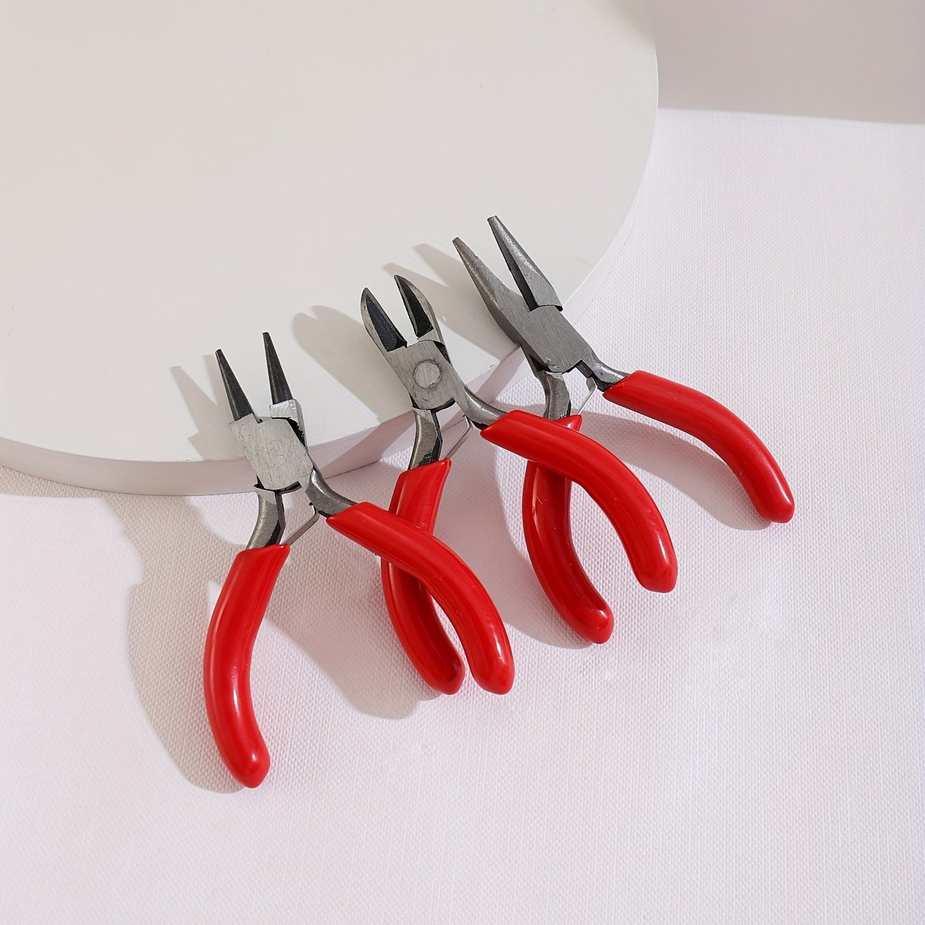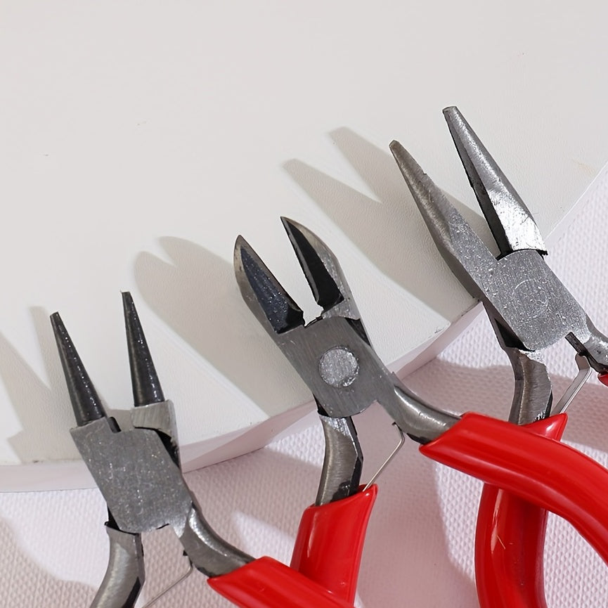 This 3-piece jewelry pliers set includes round nose pliers, side cutting pliers, and flat nose pliers. Perfect for beading, wire work, and jewelry repair.
