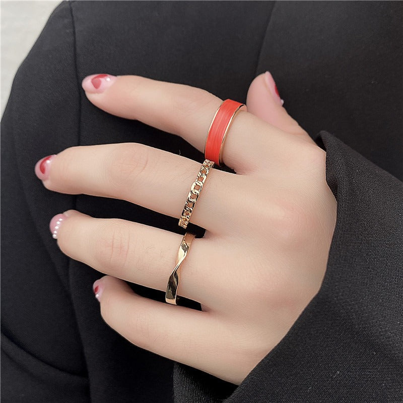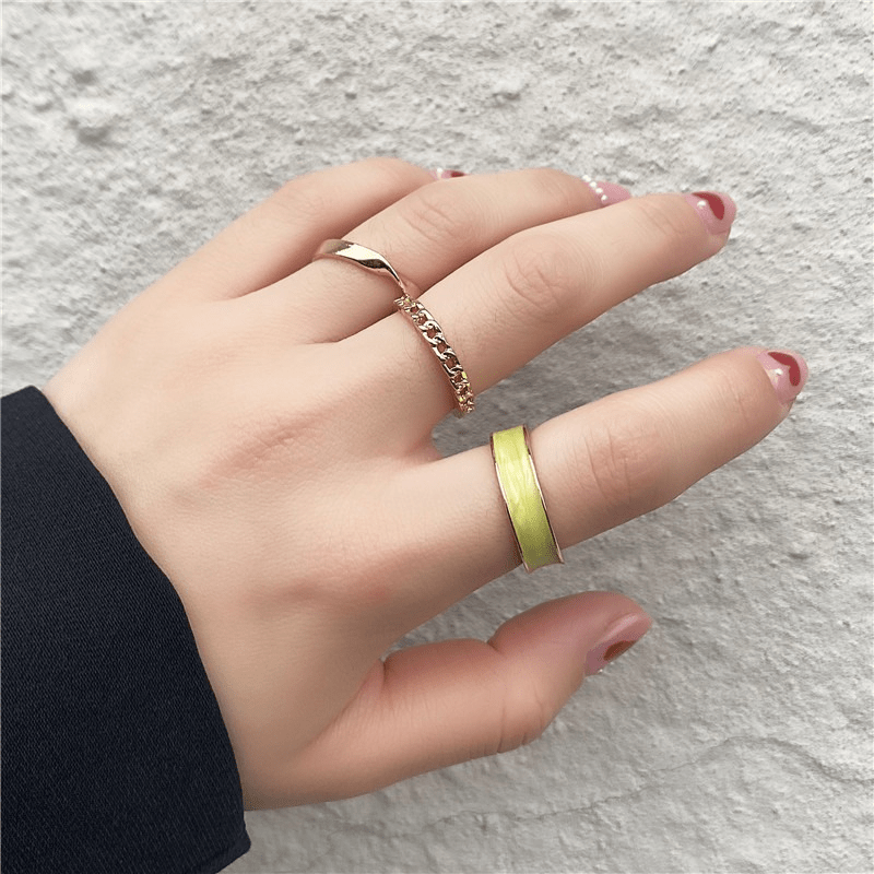 Elevate your daily outfits with this 3-piece stacking ring set. Each ring is 18k gold plated and features a wide band, chain detail, and a knot shape design. Perfect for adding a touch of elegance to any look.