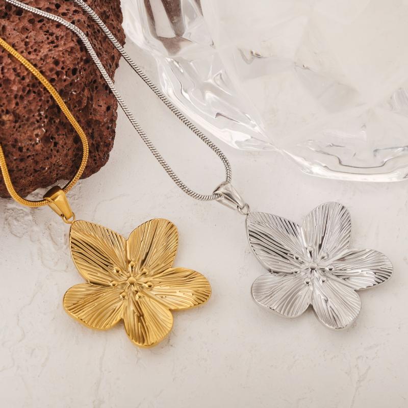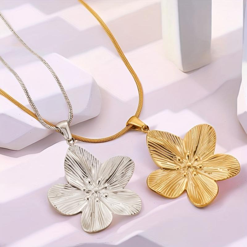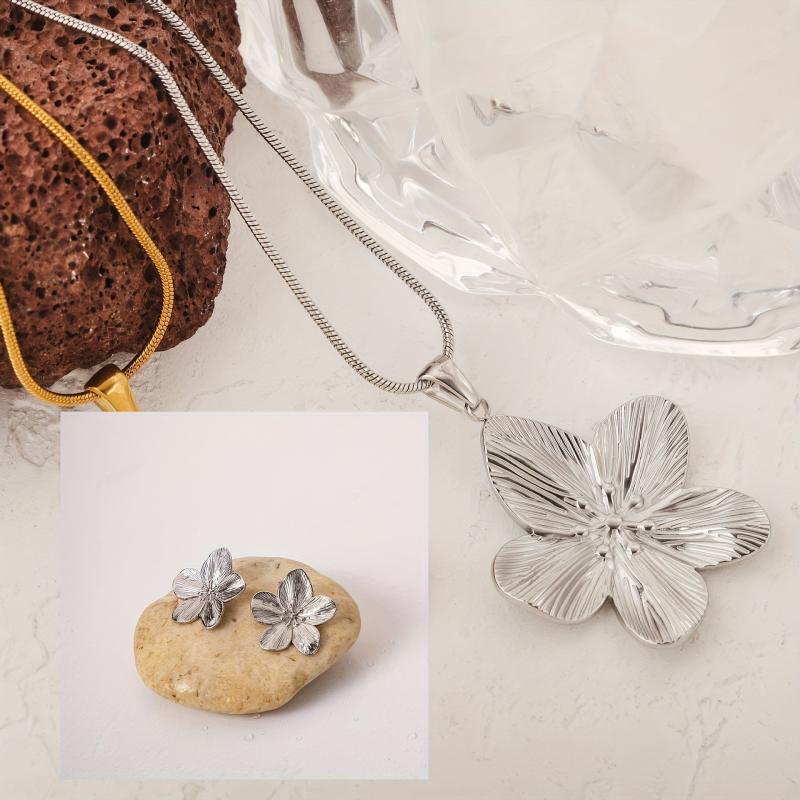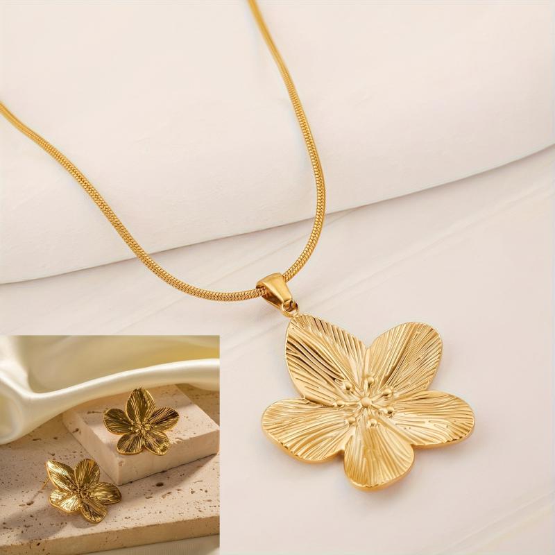 This 3-piece set includes a necklace and earrings made of stainless steel with 18K gold plating. Hypoallergenic and stylish design.