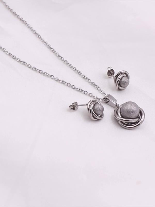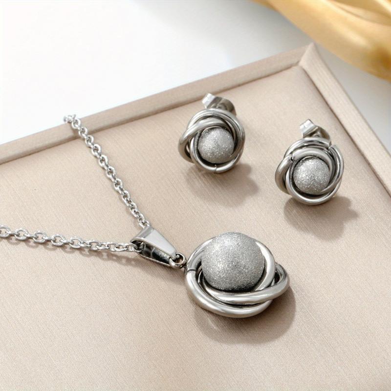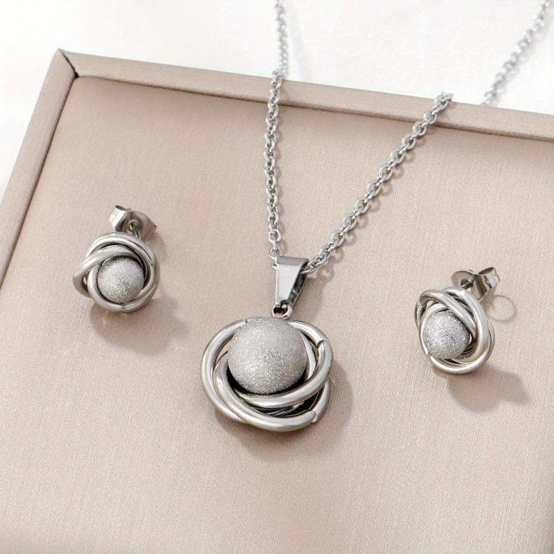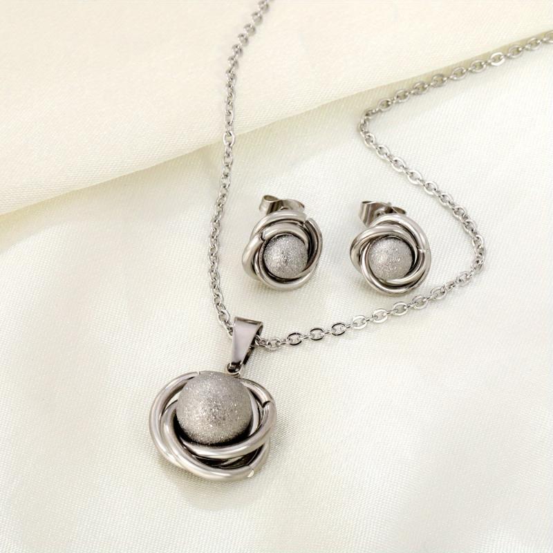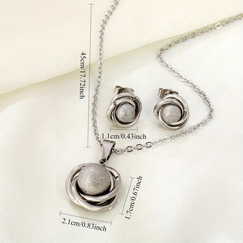 Complete your look with this trendy 3-piece set featuring stainless steel geometric ball dangle earrings and necklace. Perfect for date nights, vacations, parties, and everyday wear.