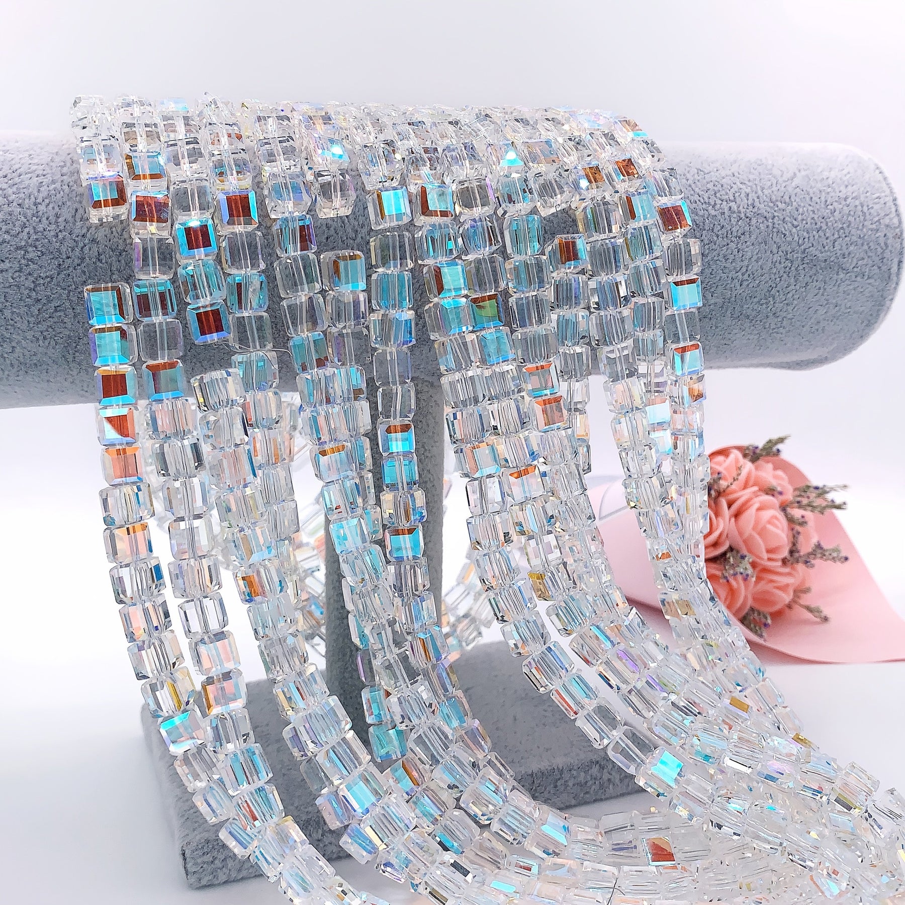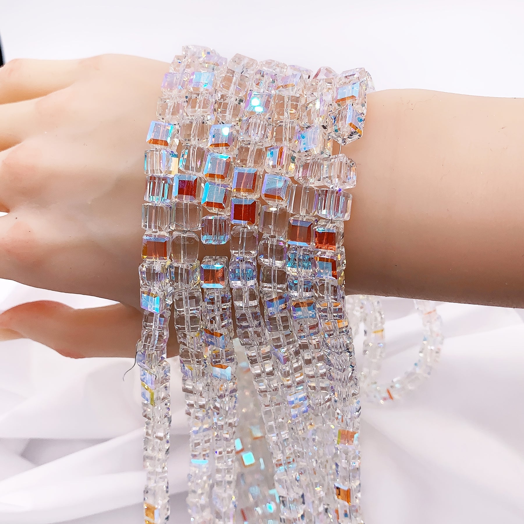 These 0.275 inch cube AB crystal high faceted glass beads are perfect for making jewelry, bracelets, and more. Add a touch of sparkle to your creations with these beautiful spacer beads.