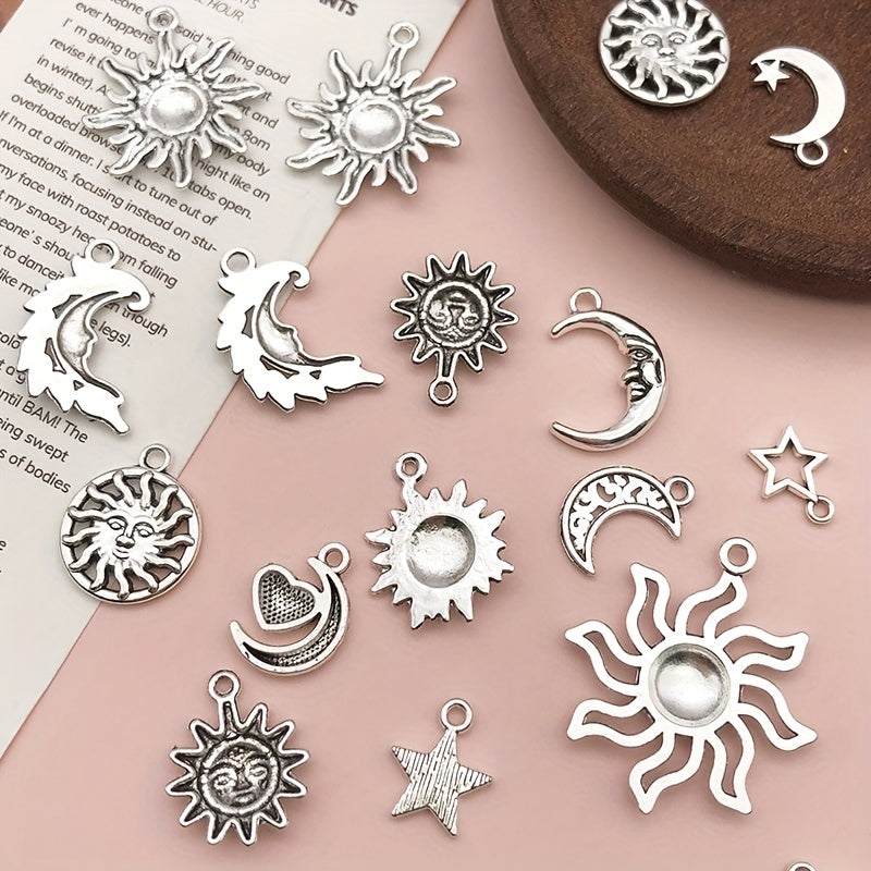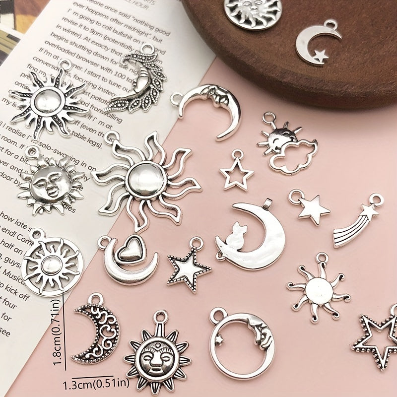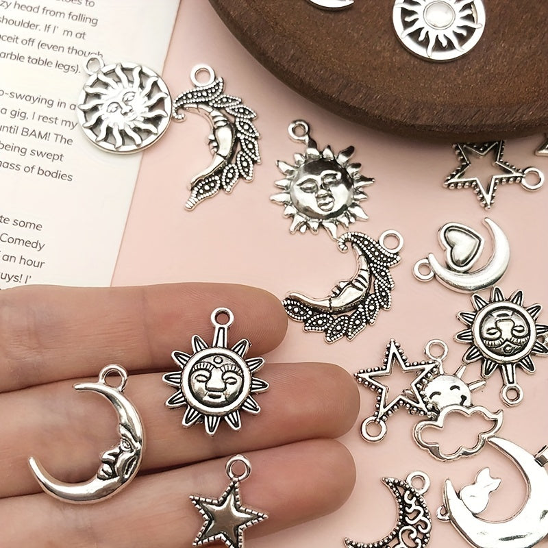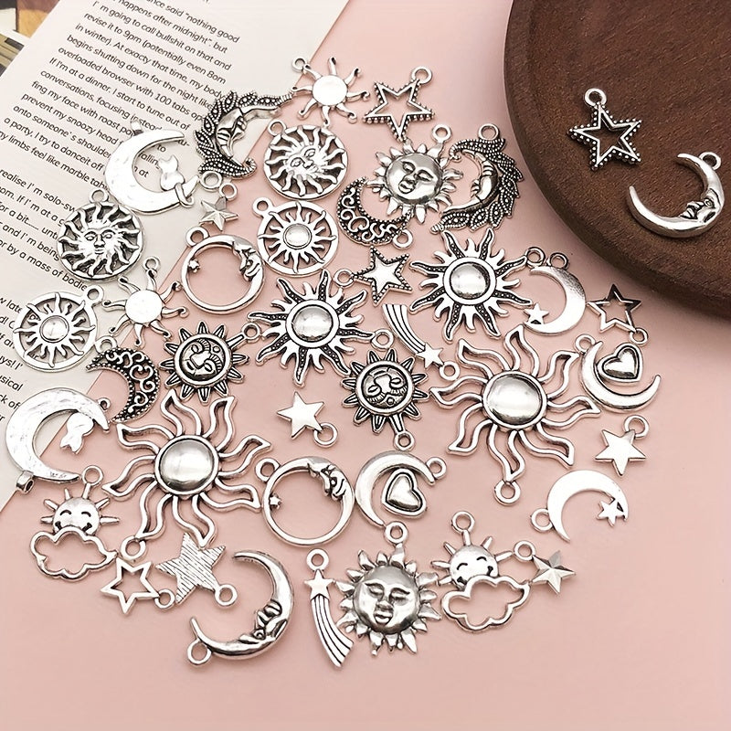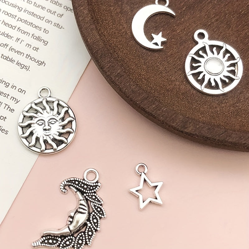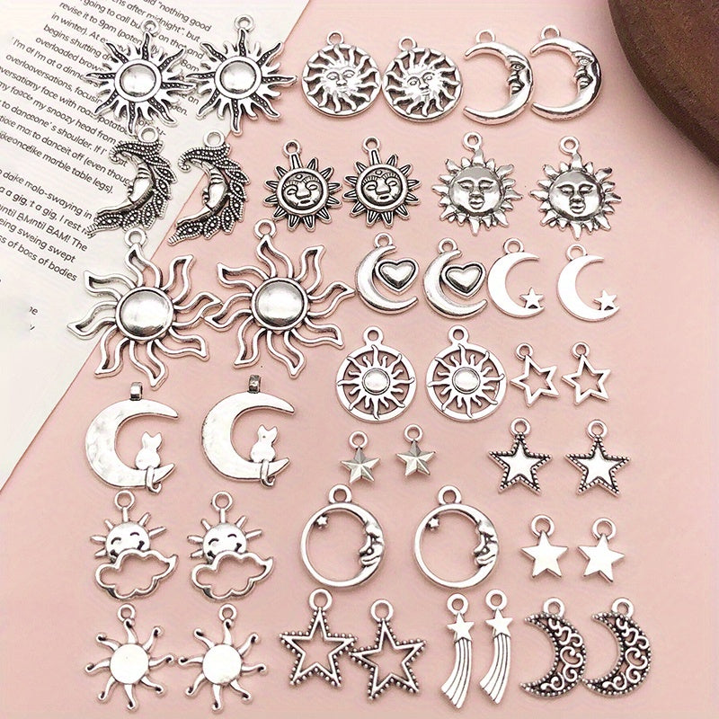 Create stunning jewelry pieces with this set of 40 antique silver star, moon, sun, and pentagram charms. Perfect for necklaces, bracelets, earrings, and more.