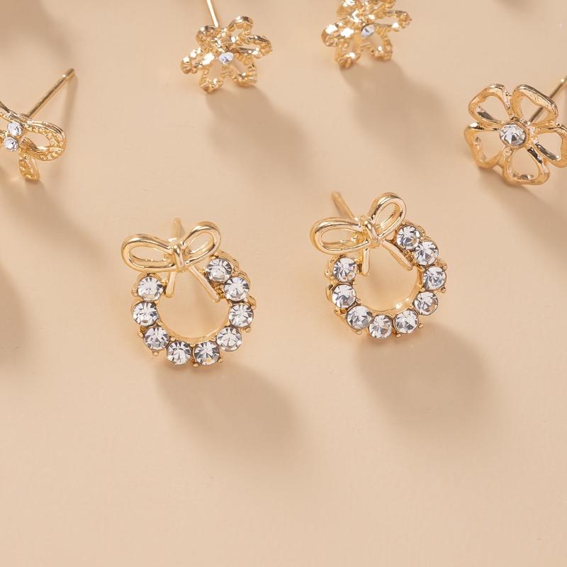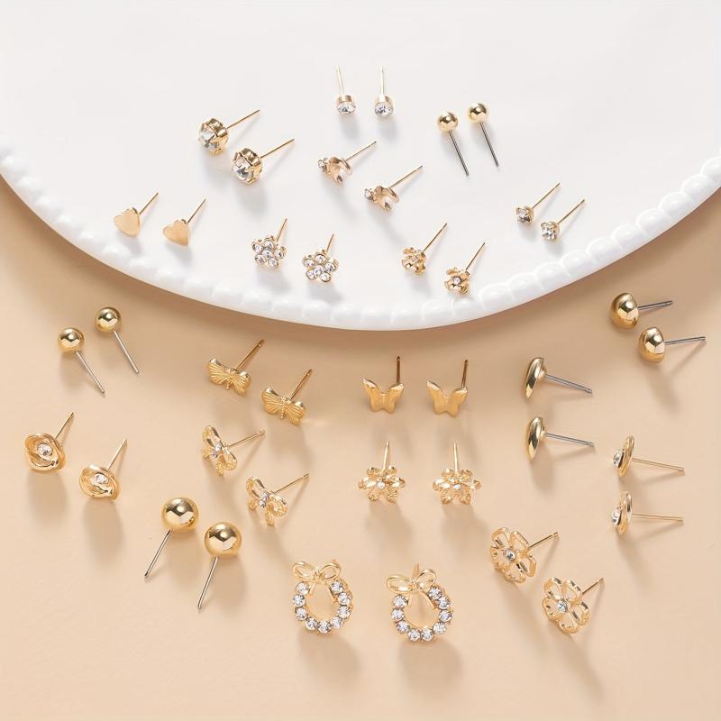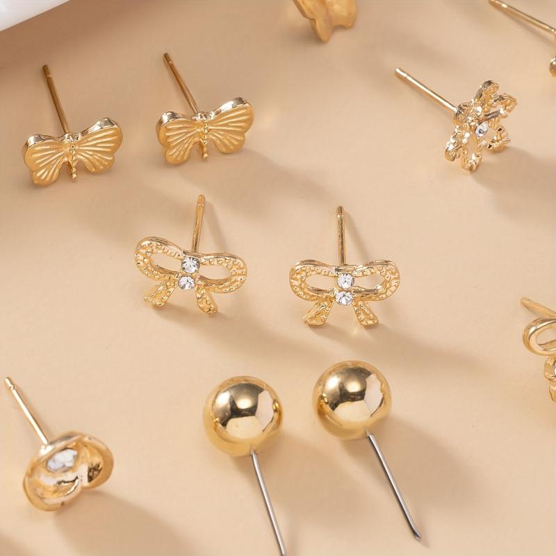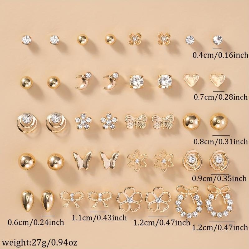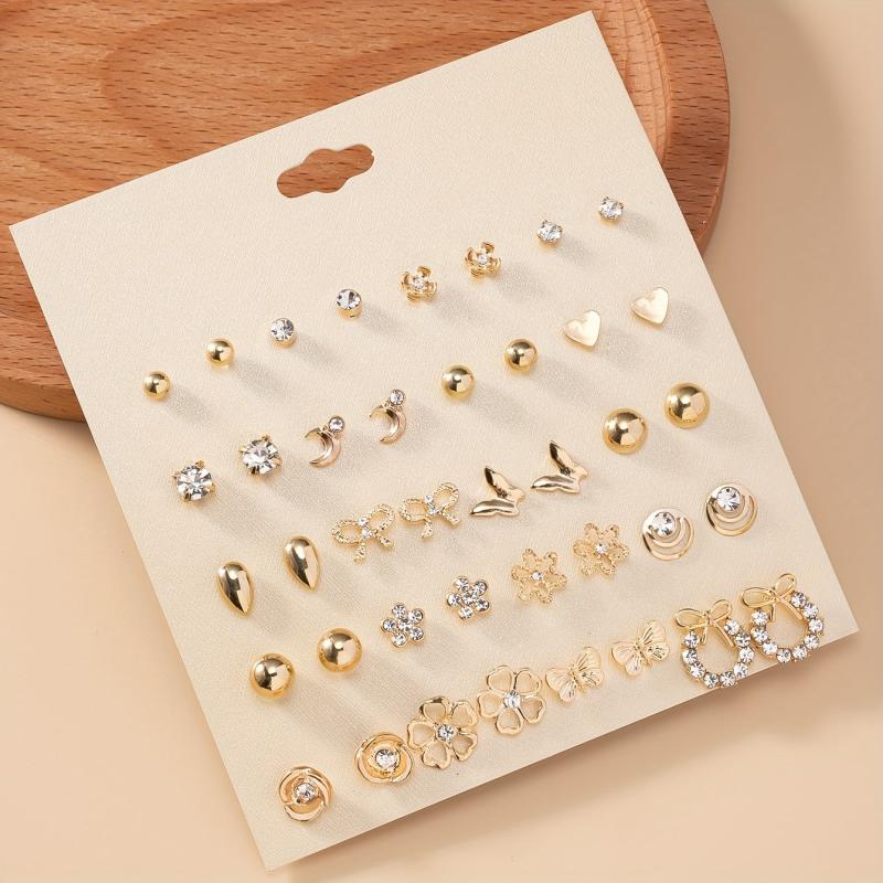 This set includes a variety of metal bow, rhinestone, flower, moon, and heart-shaped earrings. Perfect for daily wear or as a holiday gift.