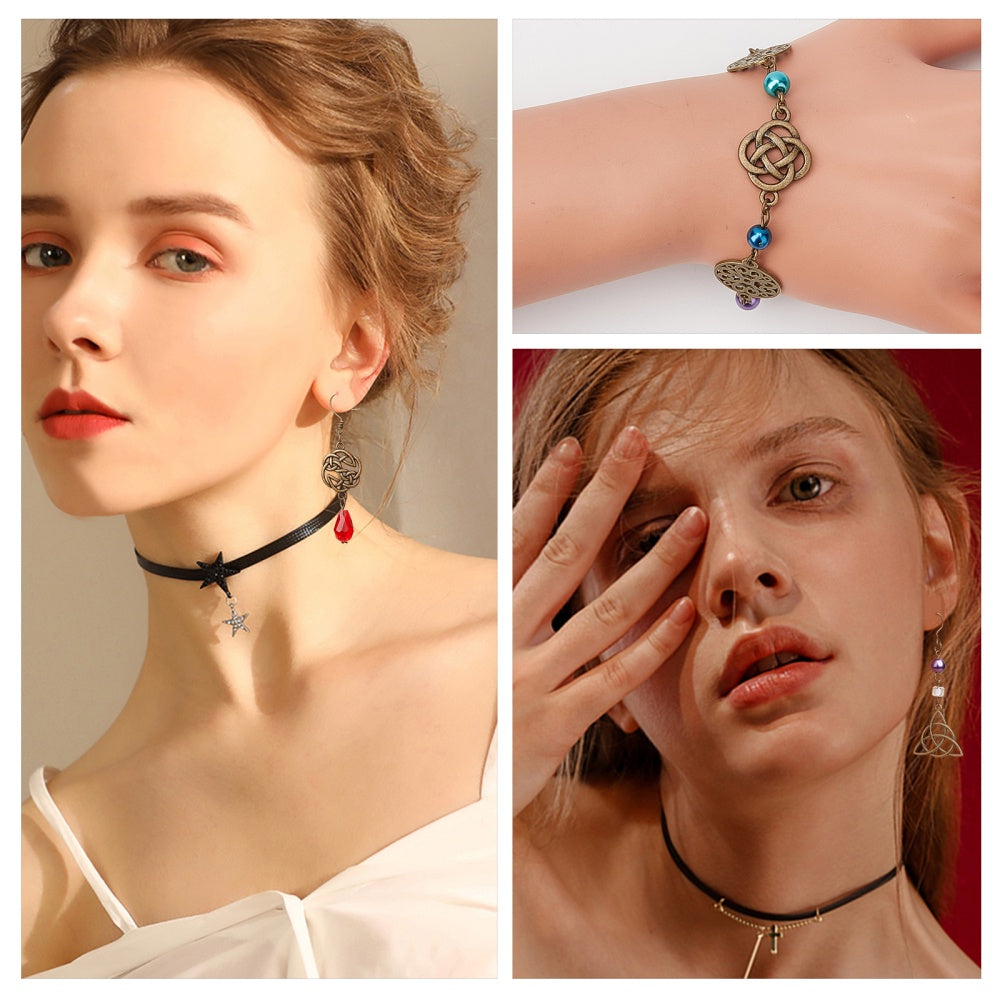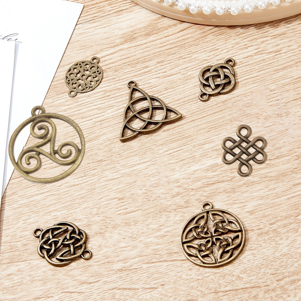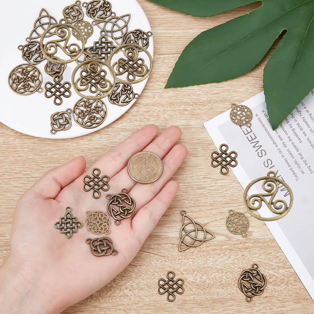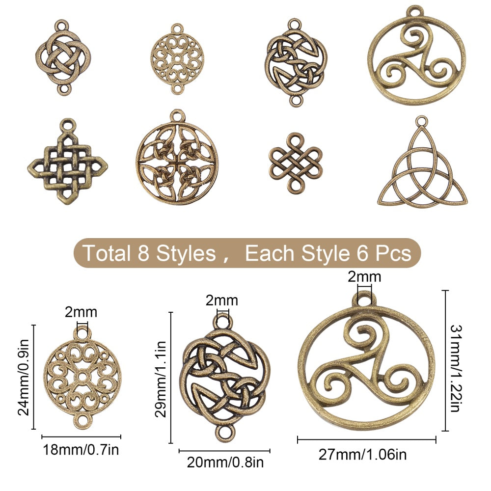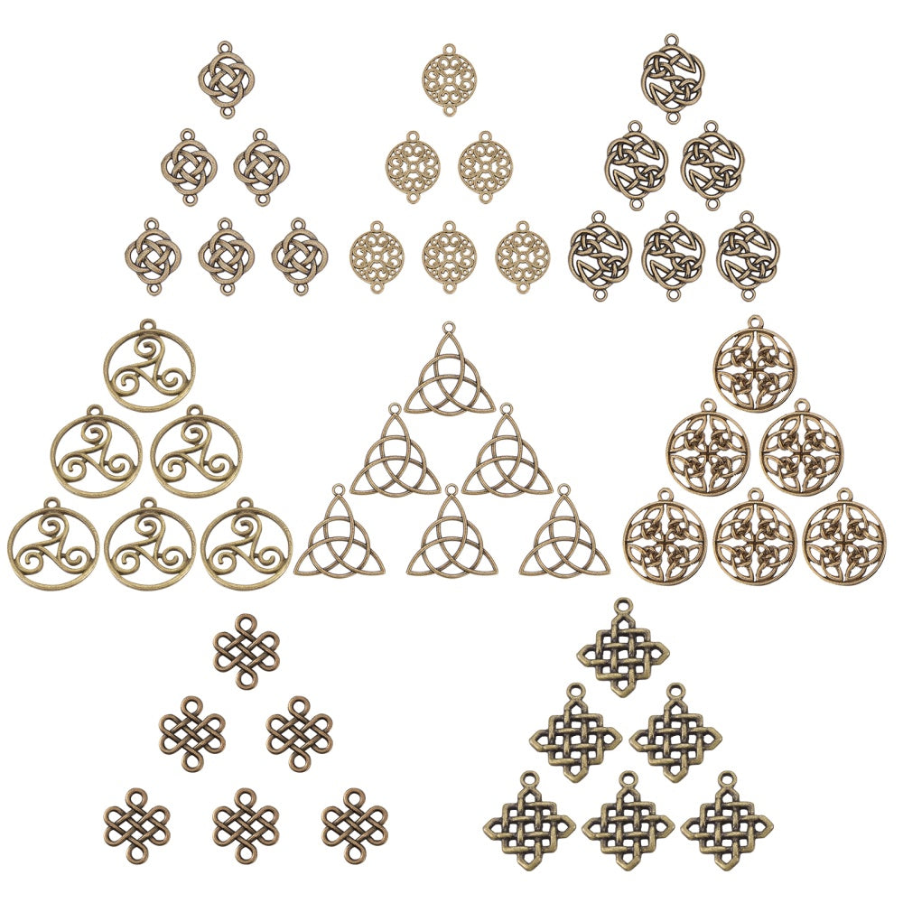 This assorted set includes 48 antique bronze hollow knot alloy pendants perfect for creating earrings, bracelets, necklaces, and other accessories. Great for DIY projects.