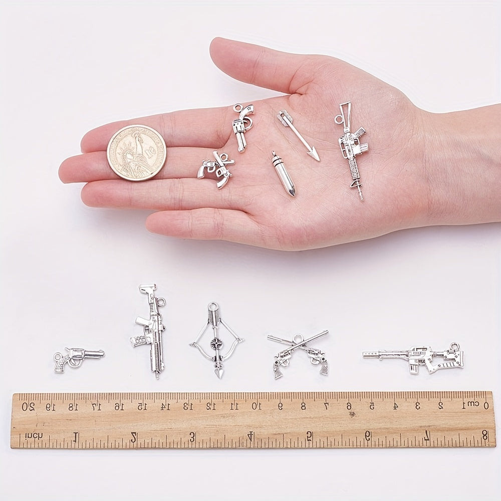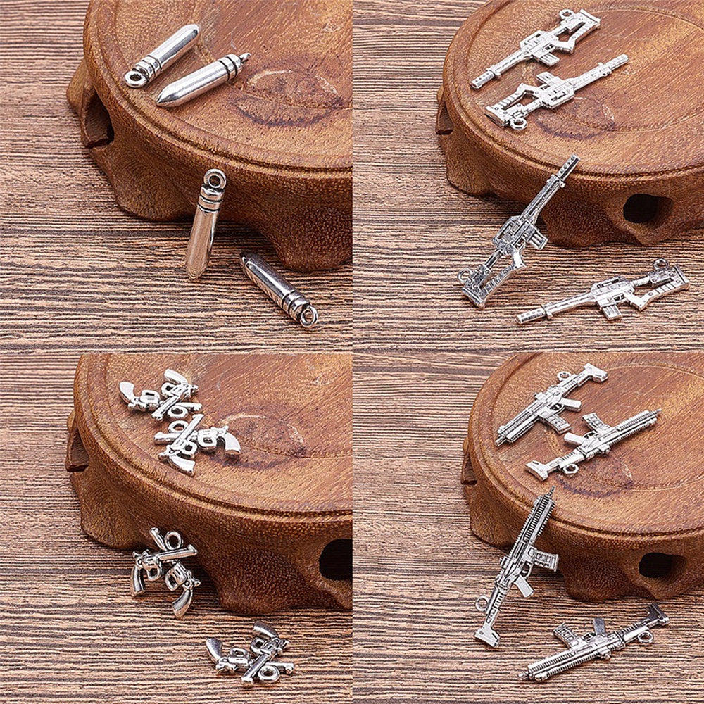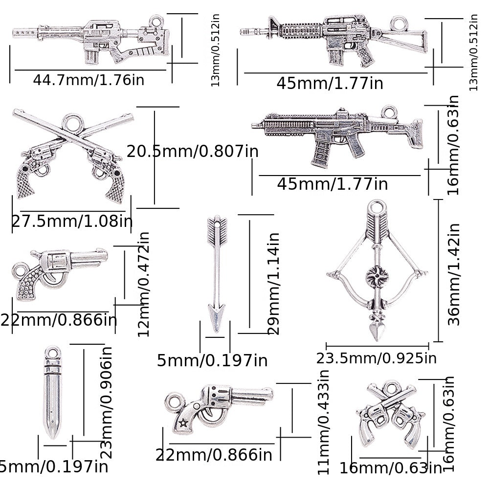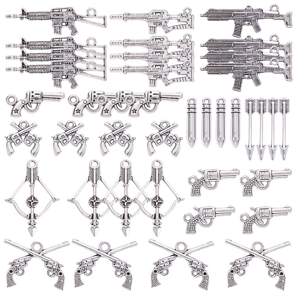Enhance your jewelry making projects with this set of 48 antique silver weapon alloy pendants in various shapes. These pendants are 22x11x3mm in size and have a hole size of 2mm.
