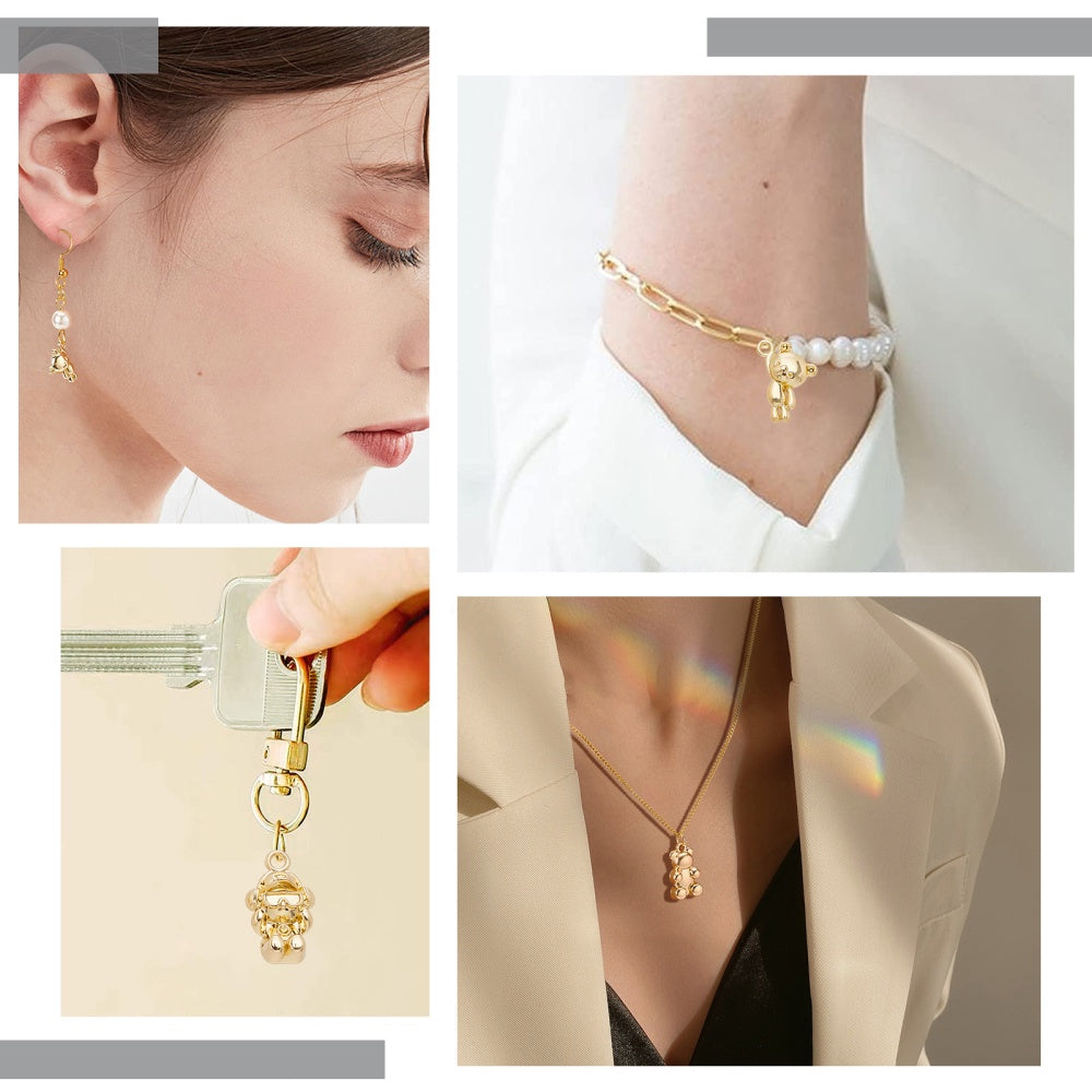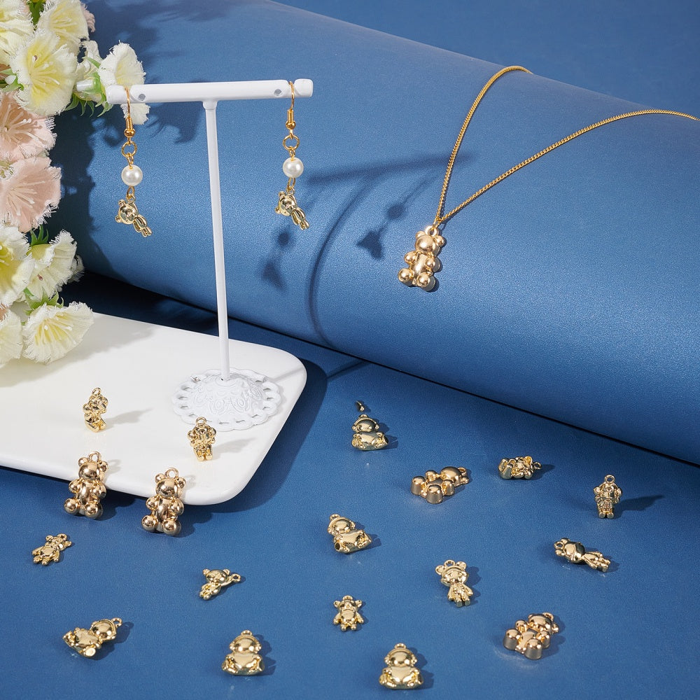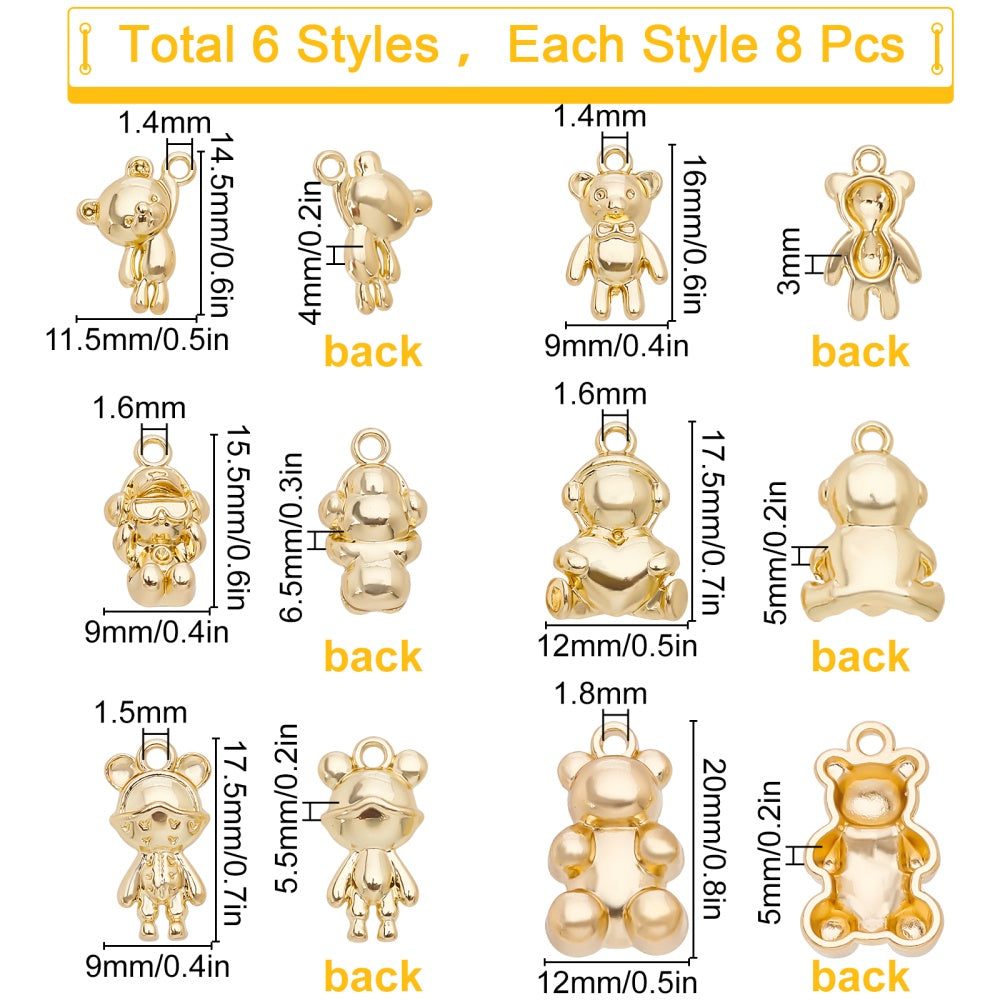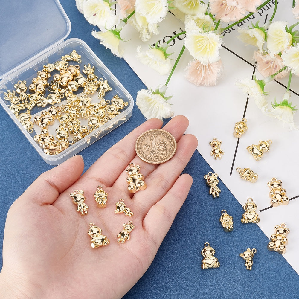 This box contains 48 pieces of assorted bear-shaped golden alloy pendant dangles that are perfect for making keychains, earrings, bracelets, and necklaces. Ideal for jewellery supplies.