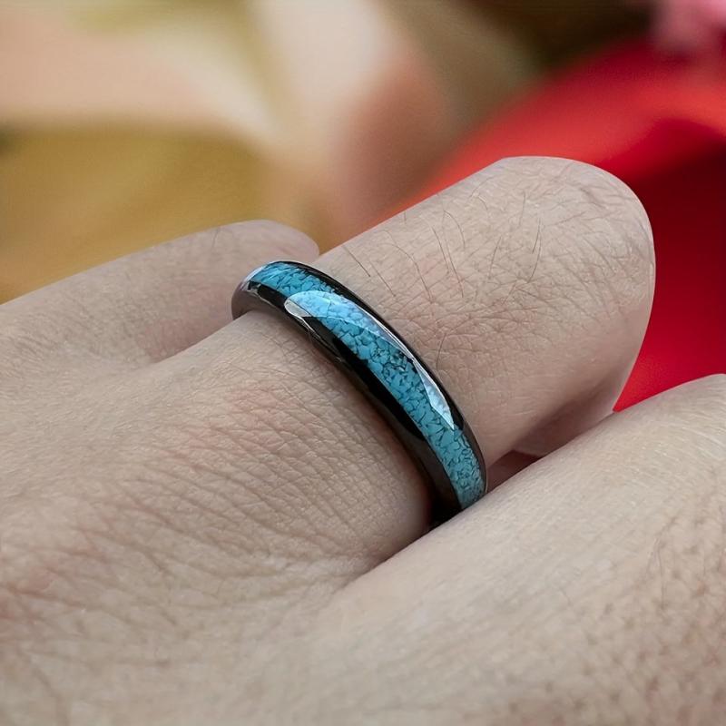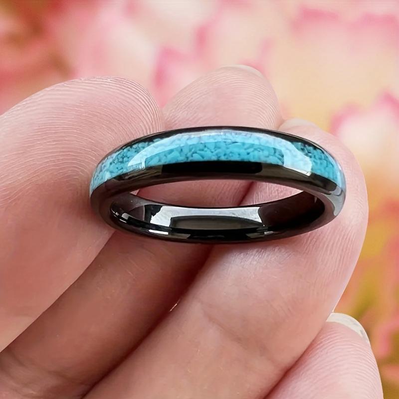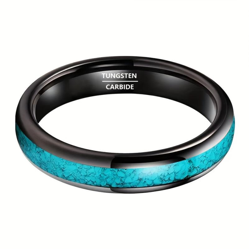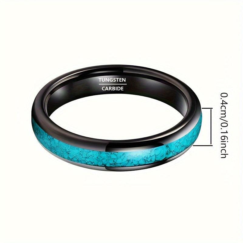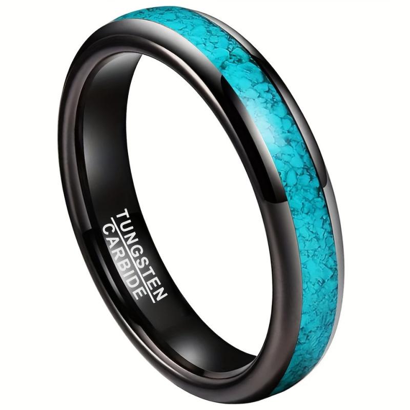 This stunning ring features crushed turquoise inlay set in a domed Tungsten band, perfect for both engagement and wedding occasions.
