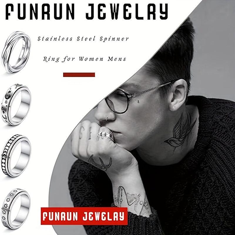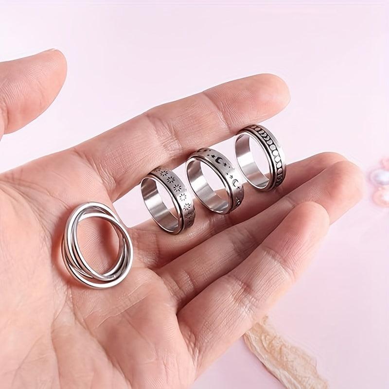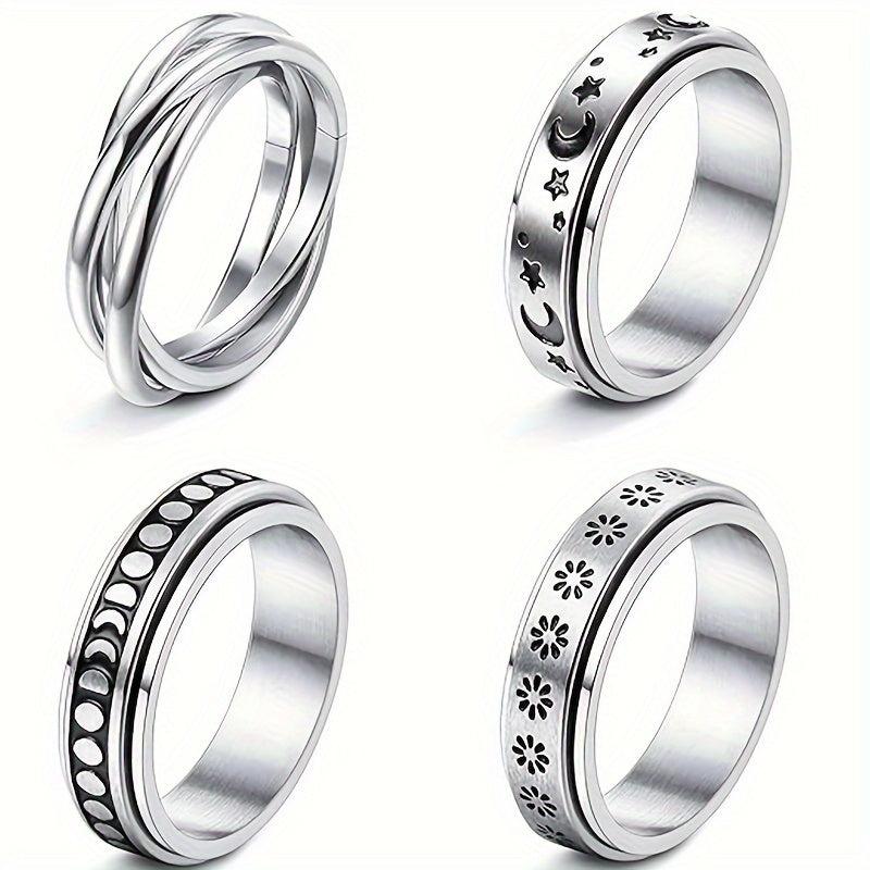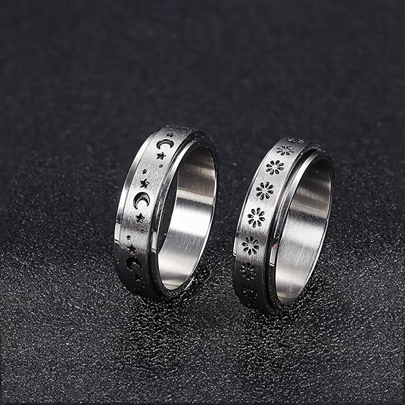 These fidget spinner rings are made of 201 stainless steel and feature a moon, star, and celtic design. Perfect for anxiety relief and fidgeting. Ideal for weddings or everyday wear.