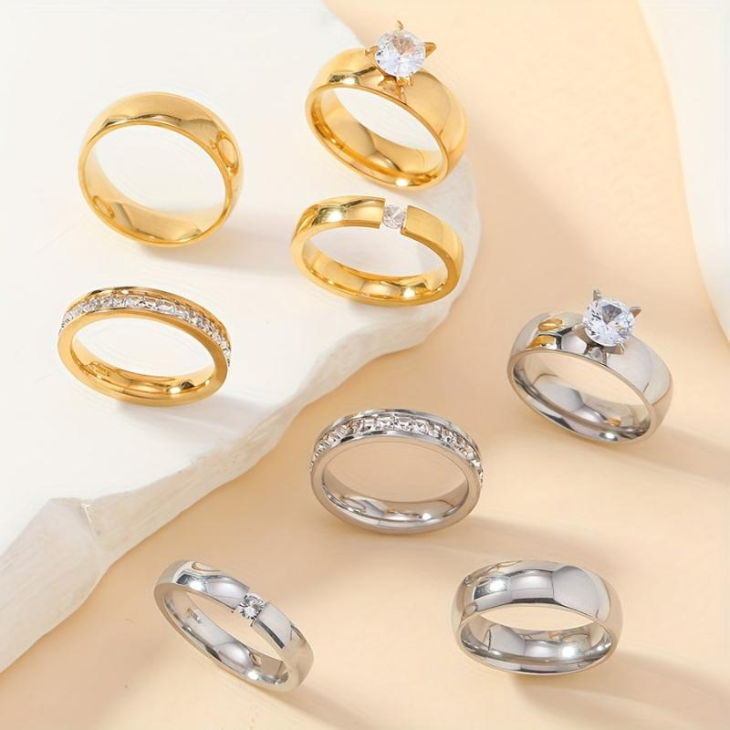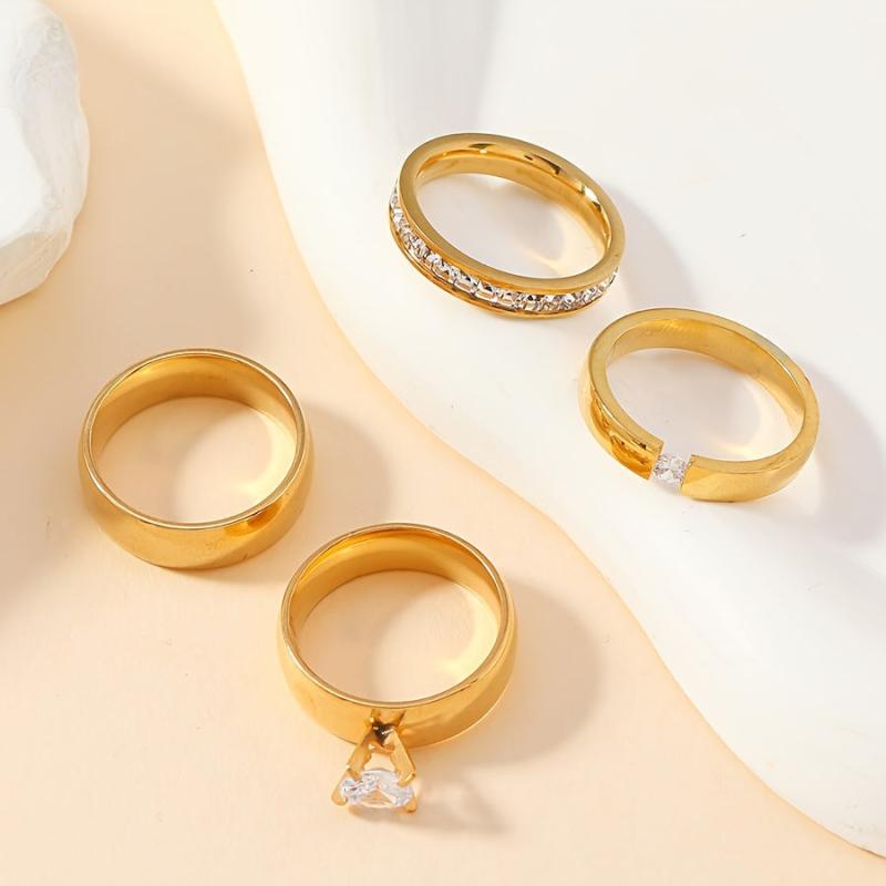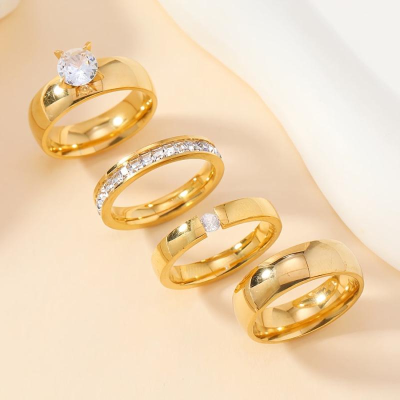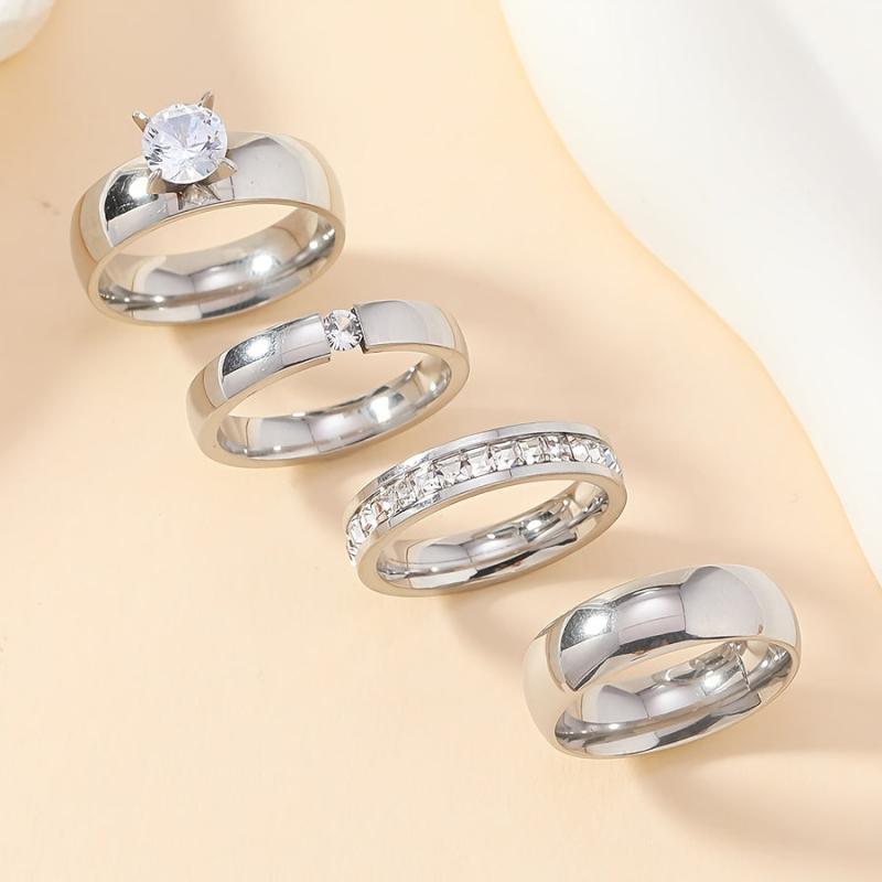 This set includes four stylish stainless steel rings with rhinestone accents, suitable for both men and women.