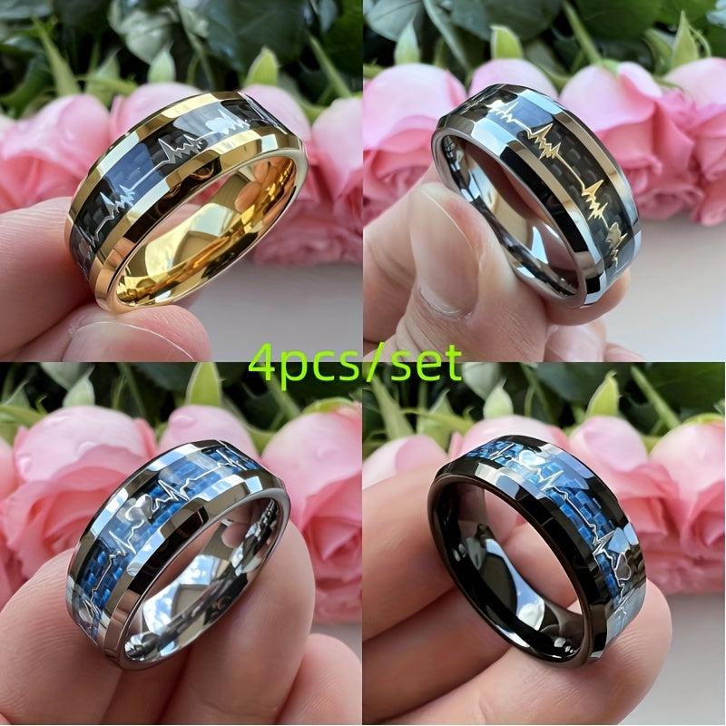 This set includes 4 Hawaiian inspired stainless steel rings with carbon fiber and fire inlaid details. Perfect for Valentine's Day or any special occasion.