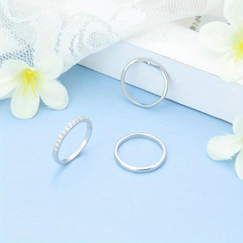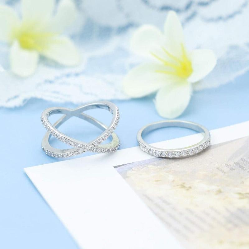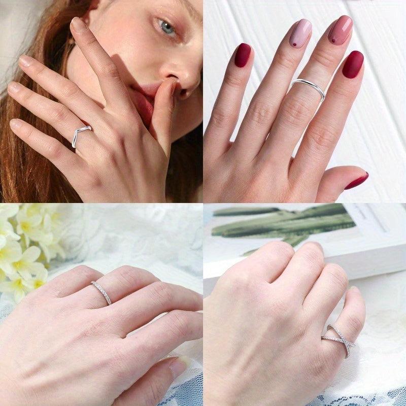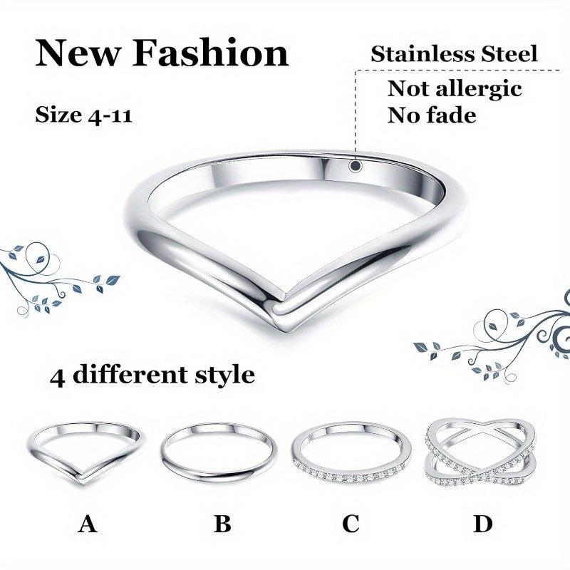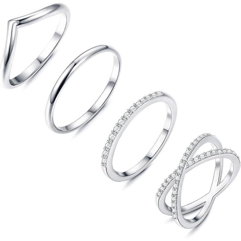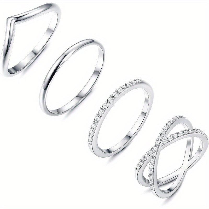 This set includes 4 stylish rings featuring V-shaped Chevron design, criss-cross details, and CZ stones. Perfect for engagement, wedding, or everyday wear.