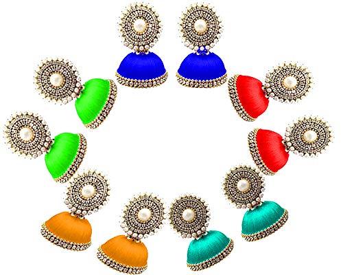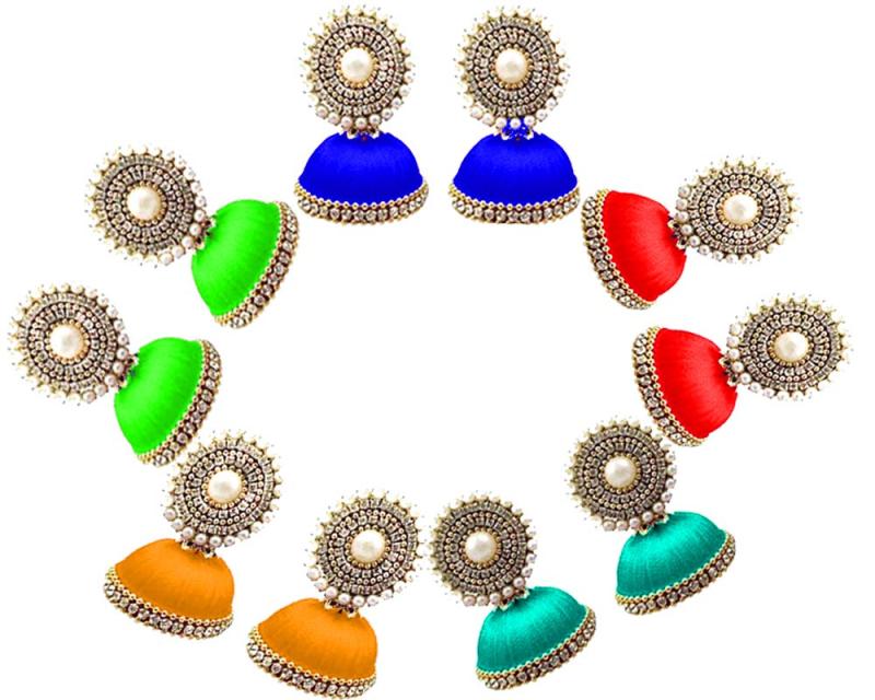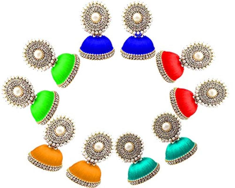 Get this beautiful set of 5 pairs of handcrafted silk jhumki earrings with silk dori. Perfect for adding a touch of elegance to your outfit.